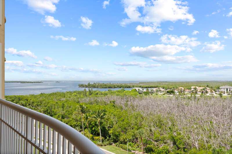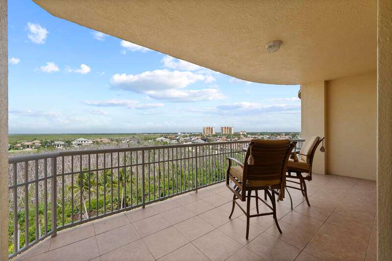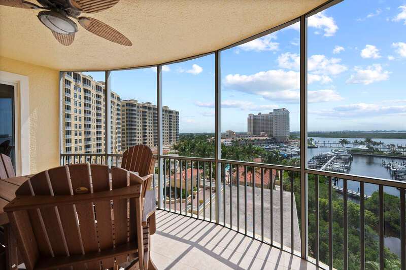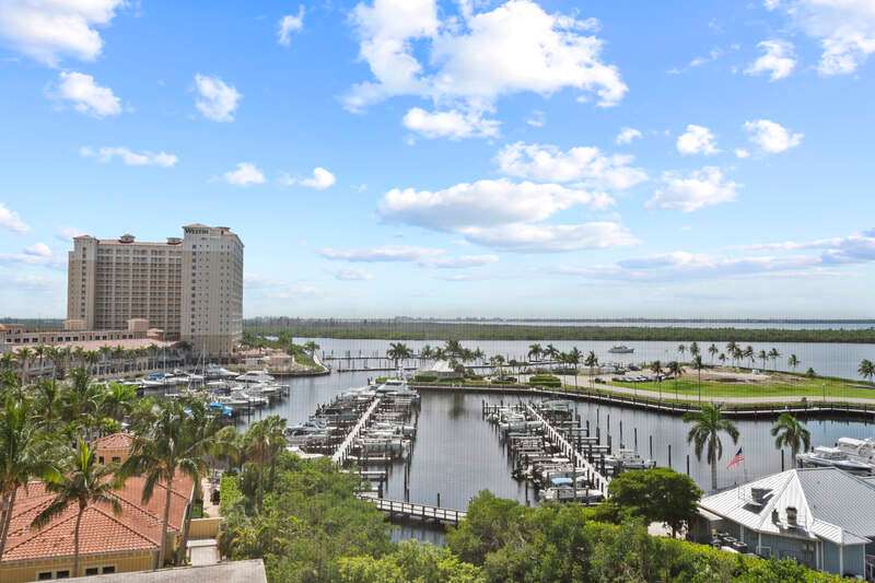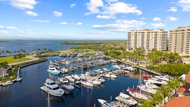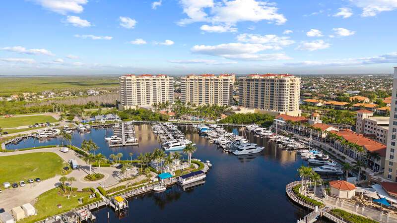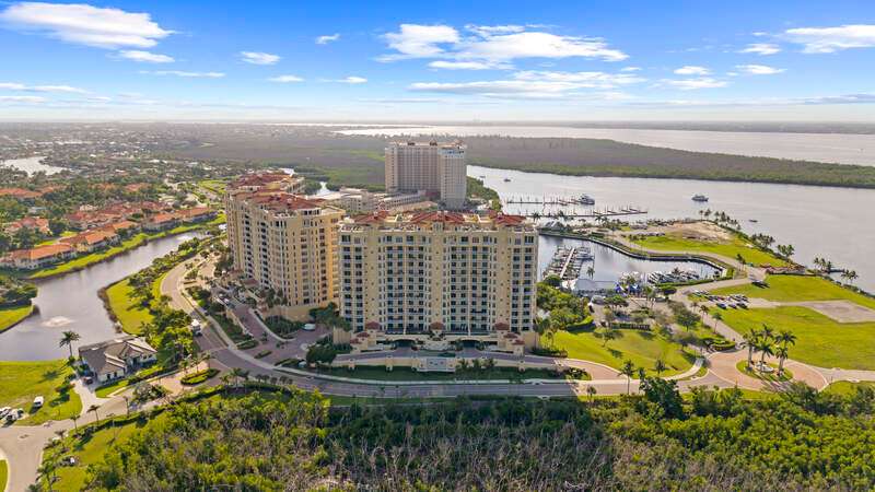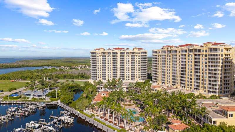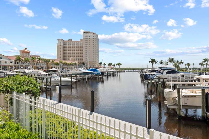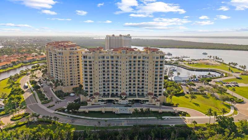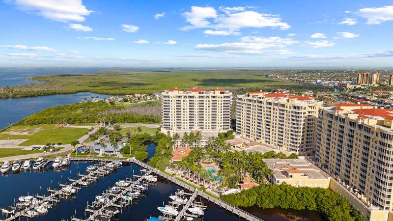 Nestled in the heart of Cape Coral, this exquisite waterfront property offers unparalleled luxury and convenience within a prestigious gated community. With deep-water Gulf access and leased boat dockage accommodating vessels up to 75 feet, this haven is a boater's dream, complimented by a full-service marina just moments away. As you explore the two expansive pools you'll be surrounded by tropical palms and mature landscaping giving you the island feeling. The two balconies offering breathtaking east and west views, leave you captivated by the stunning vistas of both the Bay leading to the Gulf and the serene river overlooking lush mangrove estuaries. The community is rich with amenities-dive into relaxation with a community pool and spa, challenge yourself at the exercise room, bocce court or enjoy leisurely days at the fishing pier, tennis court or a lively game of Pickle Ball. The clubhouse beckons with billiards to challenge your expertise, while bike and jog paths wind through beautifully mature grounds. A private elevator delivers you directly to your foyer with double doors opening to a beautiful open floor plan. With over 2900 sq. foot of living area, you have plenty of room for family, friends and entertaining. All stainless appliances grace the home, 2 viewing balconies facing east and west, 3 bedrooms, 3.5 bathrooms and a den for use of whatever makes you happy!! The community's award-winning dining and shopping options are right at your doorstep with a winding boardwalk around the property to stroll along and enjoy the Florida sunshine. Whether for sun-drenched beach days or tranquil sunset cruises, this property promises an unmatched living experience, where every convenience and luxury is at hand. This unit comes with a 2 car 2nd floor elevated Garage for your toys! Call for your private viewing, the home will not disappoint!!