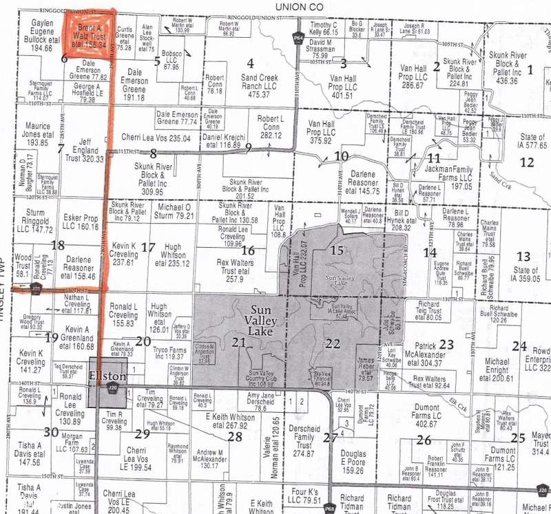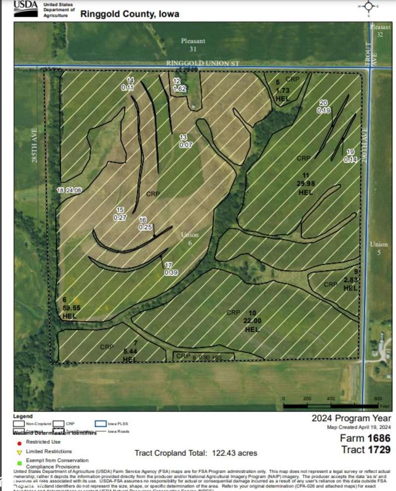 REDUCED!!!!! Excellent, versatile quarter section of real estate on Ringgold-Union line across from public accessible State of Iowa DNR (Union County) land. Very good terrain with some terracing and food plotting. Current CRP contract ends 09/30/2027 with $28,938 paid through expiration. Land is geared for excellent crop potential upon CRP expiration with above 50 CSR2 average. Parcels could be re-enrolled in CRP depending on government availability. Hunting potential exists in the north-south draw in the western parcels as well as across the road north to DNR public hunting.