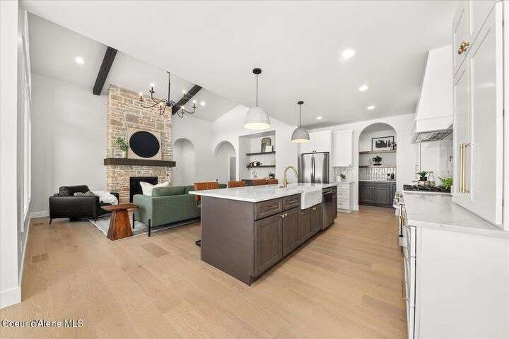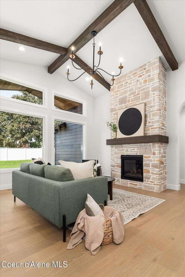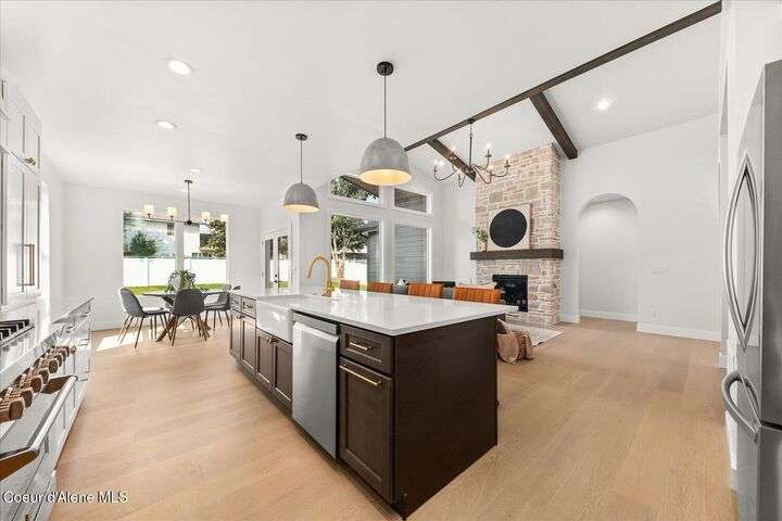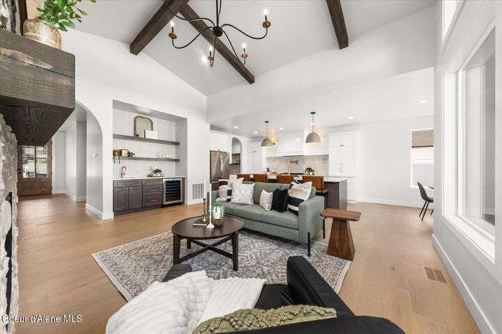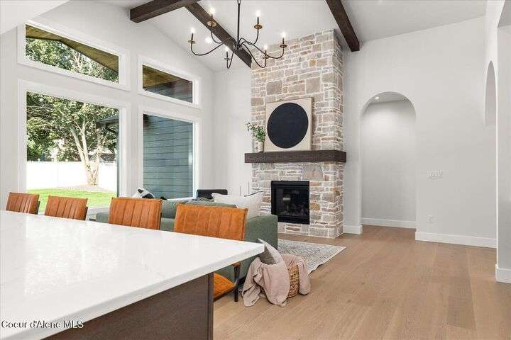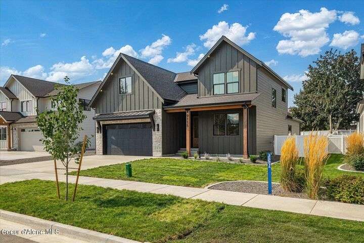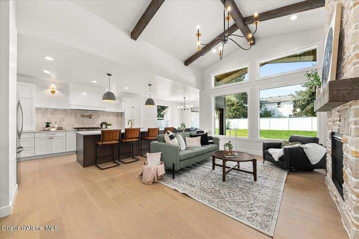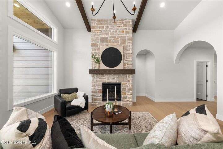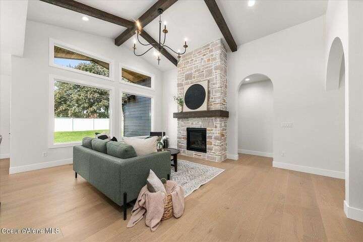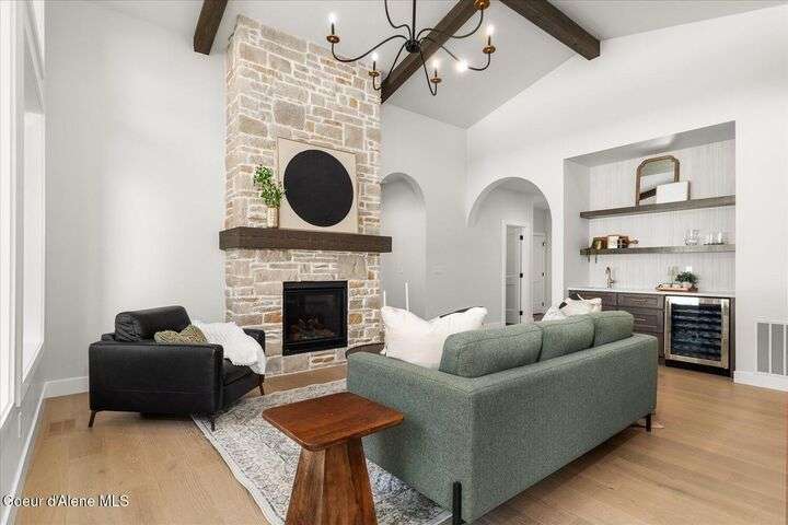 This stunning 2,672 sq ft new construction home offers 4 bedrooms, 2.5 baths, an office, and a bonus room, designed with exceptional attention to detail. Luxury finishes include engineered hardwood floors, tile in all baths, custom tile showers, and quartz countertops throughout. The vaulted living room features exposed rough-sawn timbers and a floor-to-ceiling stone gas fireplace. The chef's kitchen boasts a 36'' gas range, pot filler, walk-in pantry with built-in cabinetry, and a beverage bar with fridge. The vaulted primary suite impresses with vaulted ceiling and spa-like bath. Enjoy the outdoors on the vaulted covered patio or large front porch, both with tongue-and-groove ceilings. Fully fenced and landscaped front and rear yards complete this move-in ready dream home.