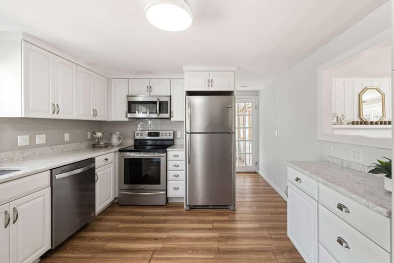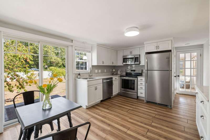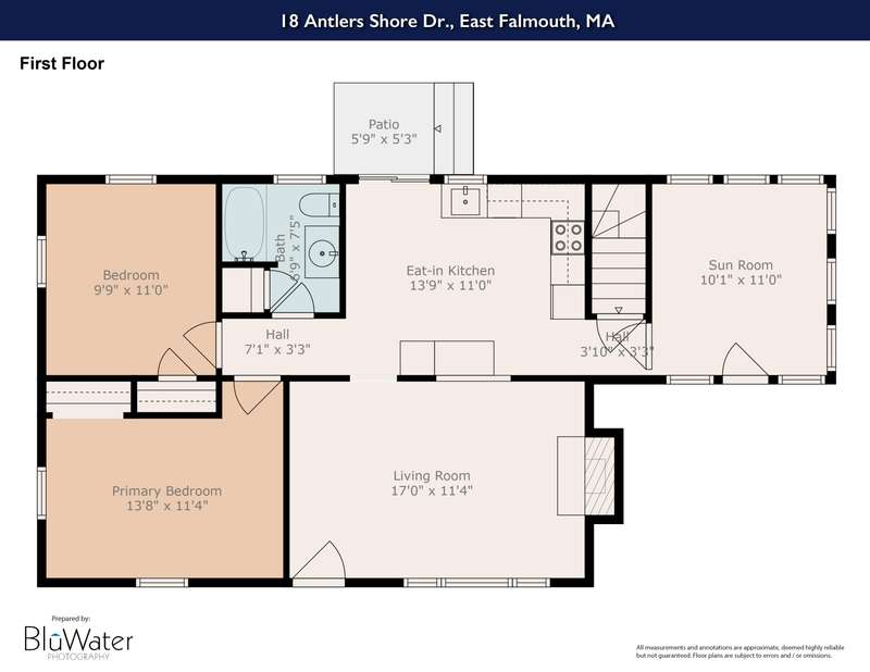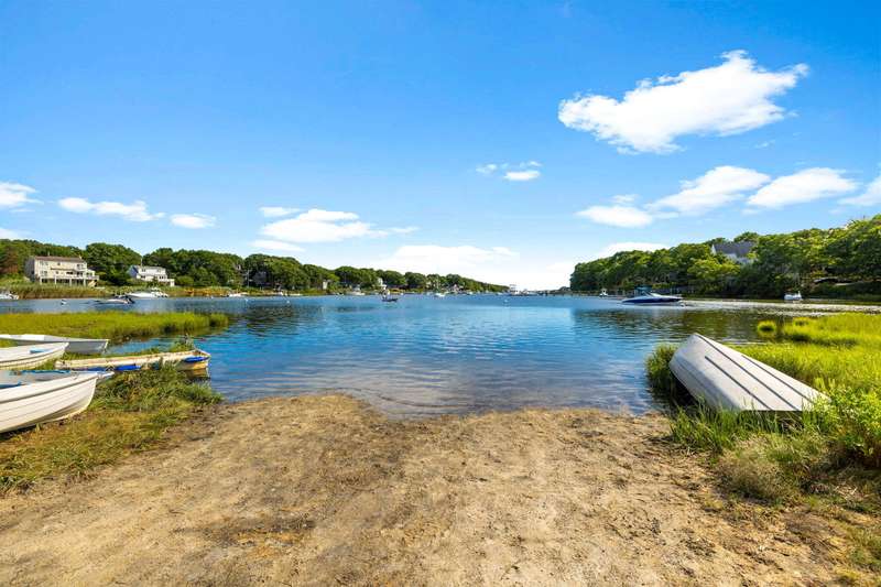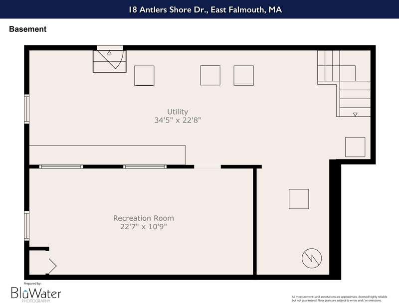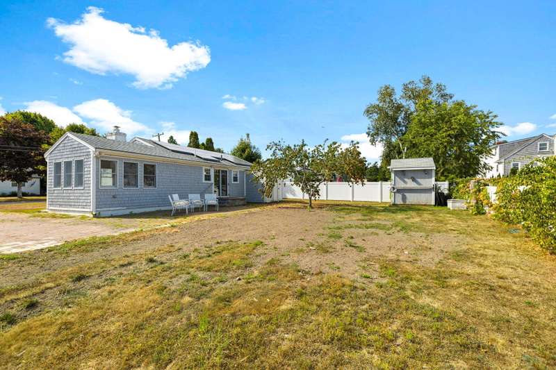 18 Antler Shore Drive is a charming and cozy ranch style home in the quiet neighborhood of the Blue Water Shores Community. The location is equal distance between downtown Falmouth and Mashpee Commons. At the end of the street is access to the Eel Pond saltwater peninsula with a neighborhood beach and a launching area for small boats. The home exudes natural light throughout with a quiet sunroom, living room with wood burning fireplace, kitchen with newer cabinets, stainless appliances and countertops. There are two bedrooms and a bathroom allowing for easy first floor living. The lower level has been partially finished for bonus space. Outside in the backyard is a beautiful peach tree with hardscaping for entertaining, outdoor shower and small storage shed. This home is ideal for first time home ownership, vacation/investment property or downsizing option.