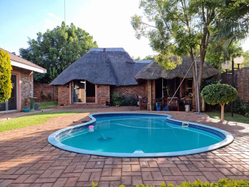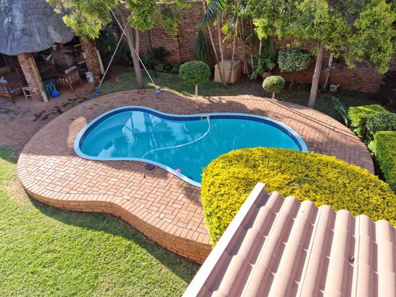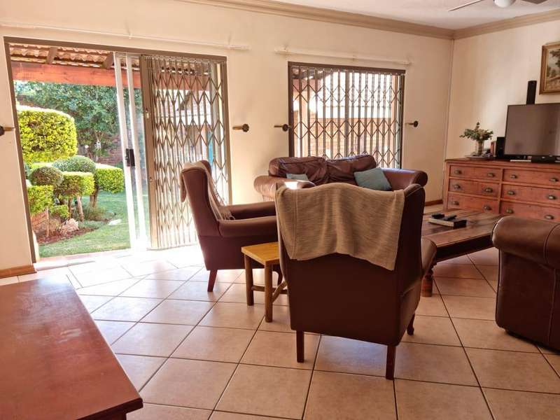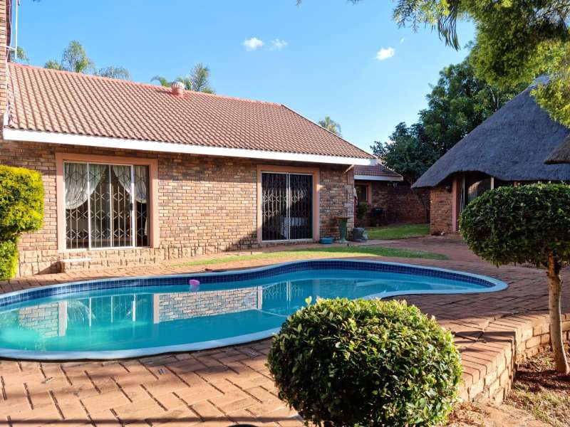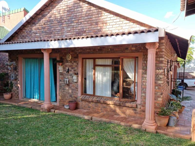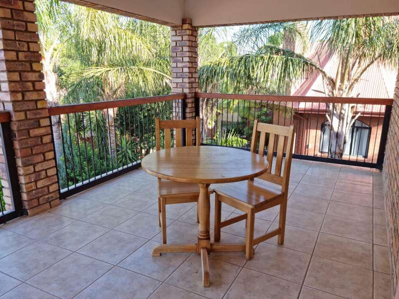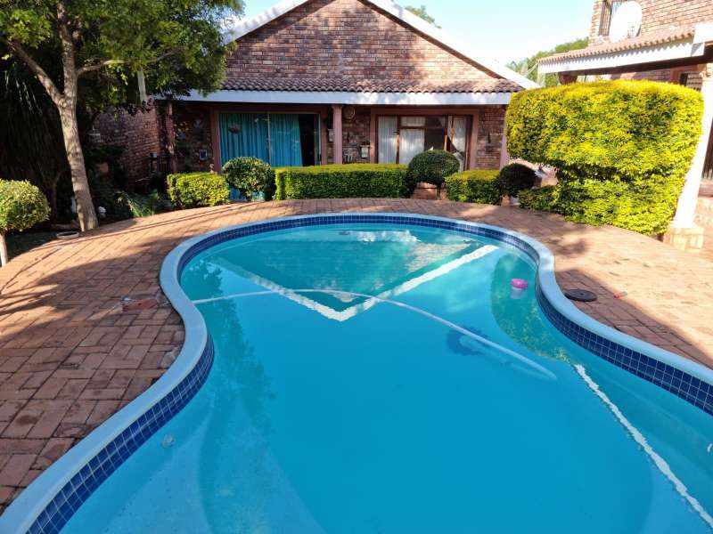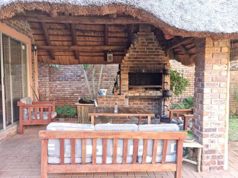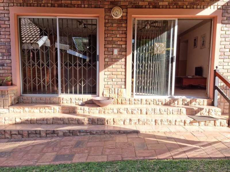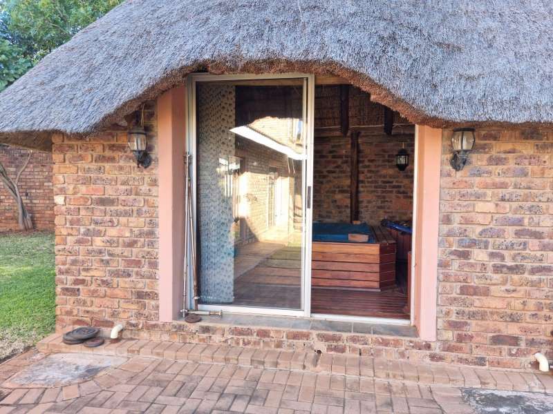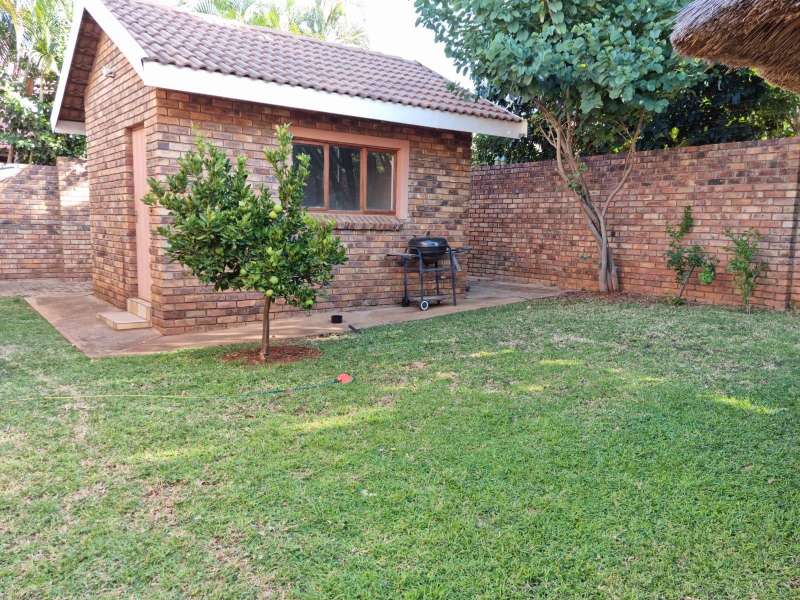 This house is one of eight units in a small upmarket secuity complex. Upon entering this 4 bedroom house, the study is on your left and the staircase leading to the main bedroom to the right. The huge main bedroom with it's laminated flooring, is overlooking the entertainment area and stunning pool below. It also has a beautiful balcony from where you can experience a bushveld sunrise. The main bedroom has a full bathroom and walk in cupboard as well as an aircon. The downstairs flooring is slate except for one carpeted bedroom. All the downstairs rooms and living areas have ceiling fans as well as sliding doors leading to the outside entertainment and pool area. The sliding doors are fitted with Trillidoors. The outside lapa and braai boasts a beautifull built in bar and jacuzi, each with a slliding door leading to the lapa. The stand-alone flatlet has 1 bedroom, lounge and kitchenette area. The bathroom consists of a toilet, basin and shower and is ideal for a elderly person or student. Phone me to arrange a viewing of this upmarket property.