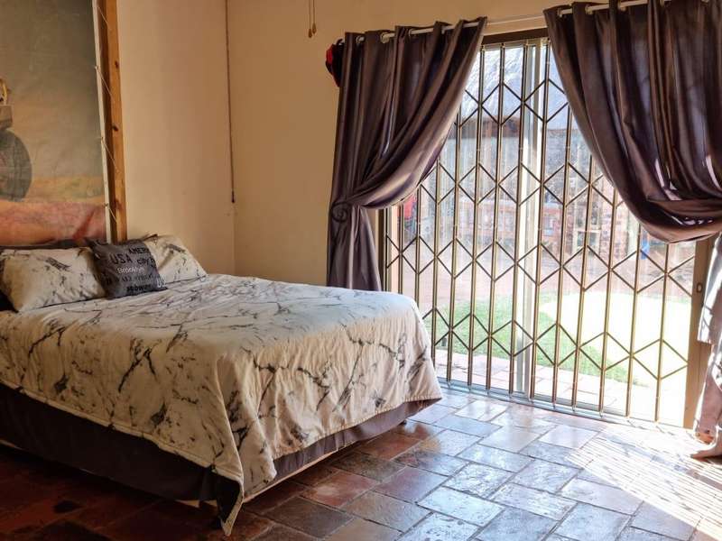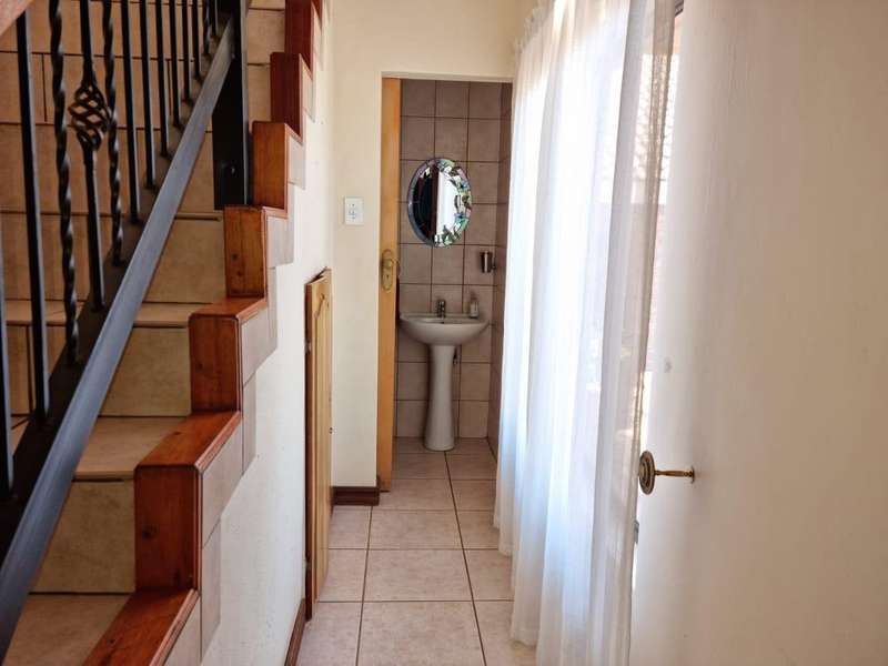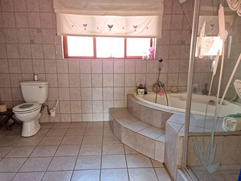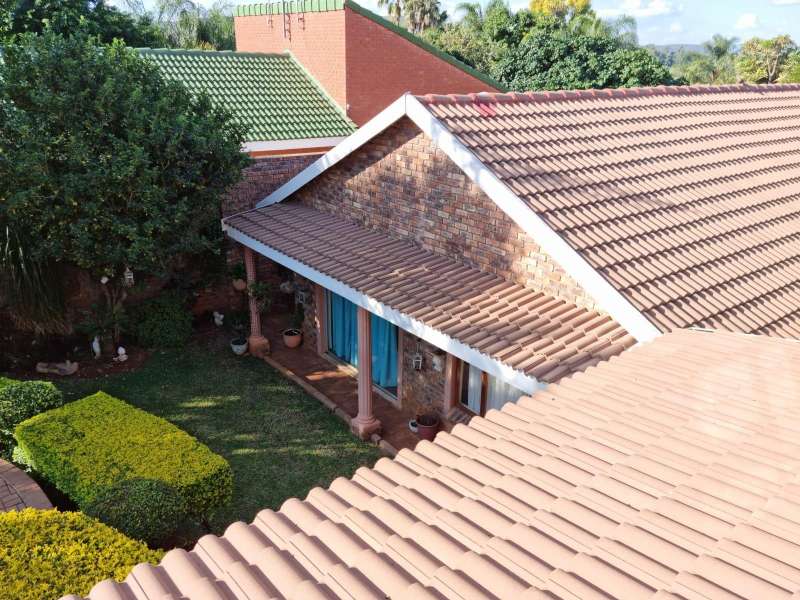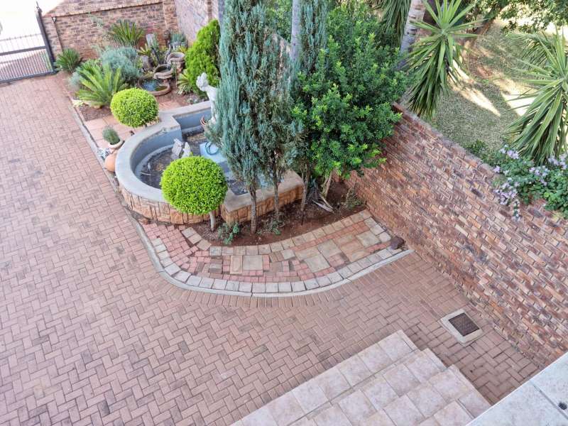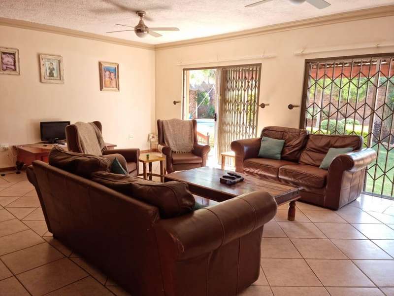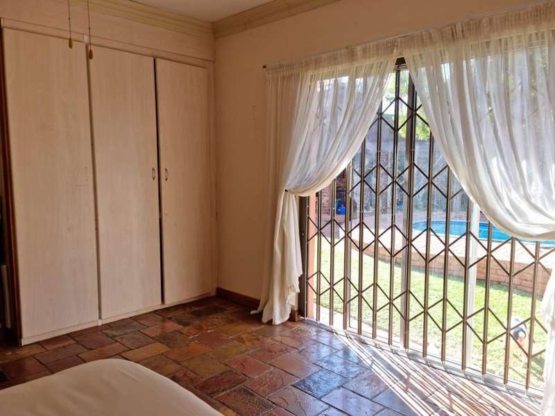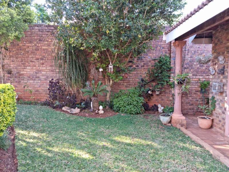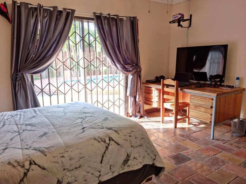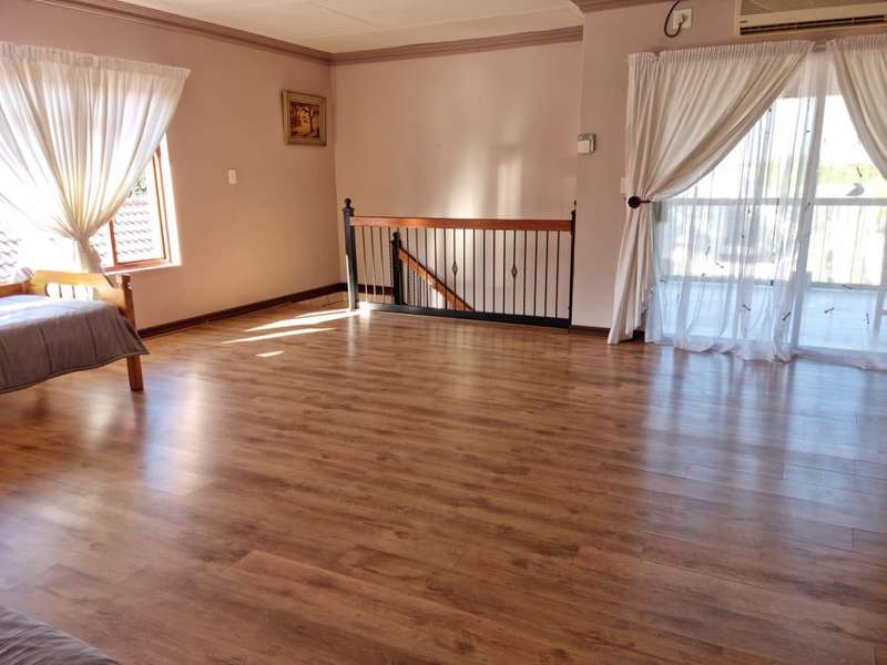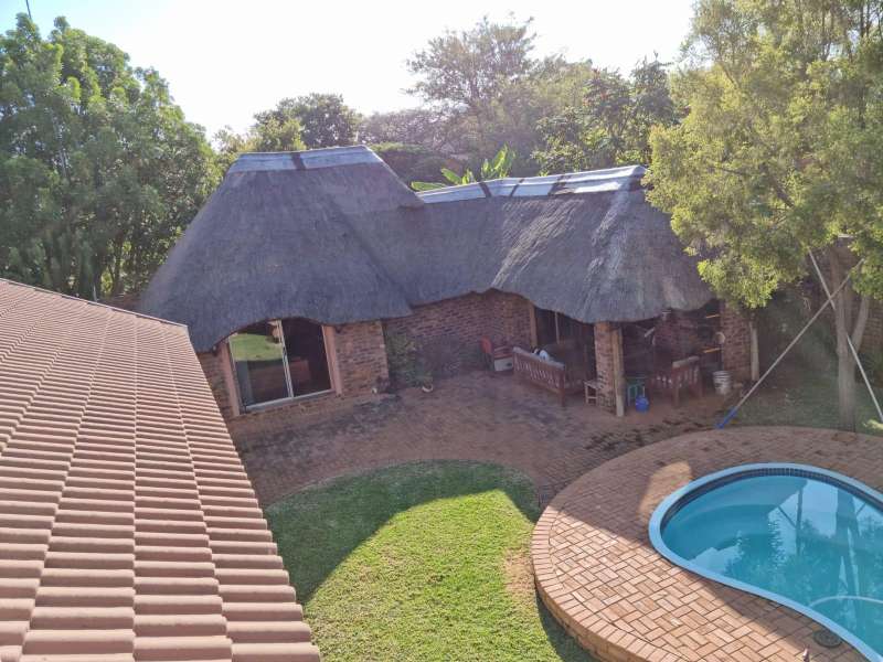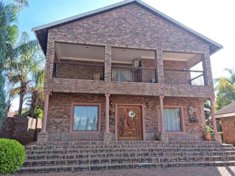 This house is one of eight units in a small upmarket secuity complex. Upon entering this 4 bedroom house, the study is on your left and the staircase leading to the main bedroom to the right. The huge main bedroom with it's laminated flooring, is overlooking the entertainment area and stunning pool below. It also has a beautiful balcony from where you can experience a bushveld sunrise. The main bedroom has a full bathroom and walk in cupboard as well as an aircon. The downstairs flooring is slate except for one carpeted bedroom. All the downstairs rooms and living areas have ceiling fans as well as sliding doors leading to the outside entertainment and pool area. The sliding doors are fitted with Trillidoors. The outside lapa and braai boasts a beautifull built in bar and jacuzi, each with a slliding door leading to the lapa. The stand-alone flatlet has 1 bedroom, lounge and kitchenette area. The bathroom consists of a toilet, basin and shower and is ideal for a elderly person or student. Phone me to arrange a viewing of this upmarket property.