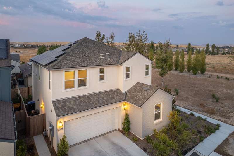 Owned SOLAR + premium LOT -- Relax on your porch and take in the endless views of nature from one of the best locations in the Poppy neighborhood. This Sunflower floor plan, set on a private corner lot with no front neighbors, offers both serenity and convenience--just one minute from the neighborhood hub and Axis restaurant. Enjoy the energy efficiency of owned solar and a home that feels like new, completely move-in ready. Step inside through a welcoming hallway that opens to a truly open-concept kitchen and living area. Downstairs, you'll also find an ideal guest bedroom with a full bath. Upstairs, an expansive, light-filled loft separates the spacious primary suite from the additional bedroom and laundry room, creating a layout designed for both comfort and privacy. With modern finishes, a premier location, and all the amenities of the exclusive Tesoro Viejo community, this home is a rare opportunity you won't want to miss.