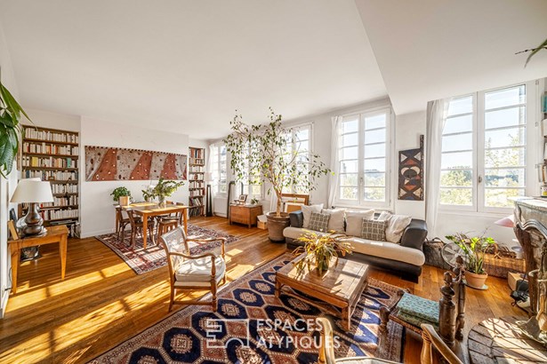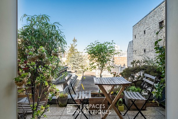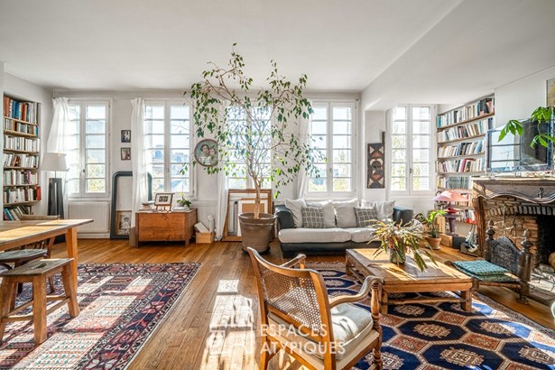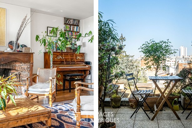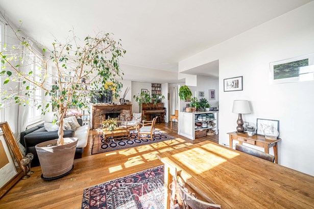 The warm and light-filled living area, illuminated by five large windows, opens onto a cozy lounge with a fireplace and an open-plan kitchen. This space extends onto a sunny 7.4 sqm terrace, ideal for enjoying the outdoors with no overlooking neighbors ? and even a distant view of the Eiffel Tower.
