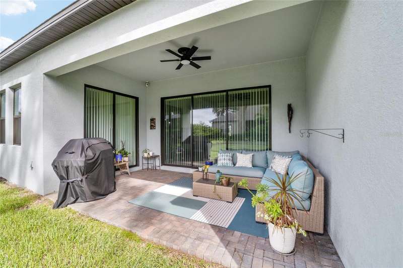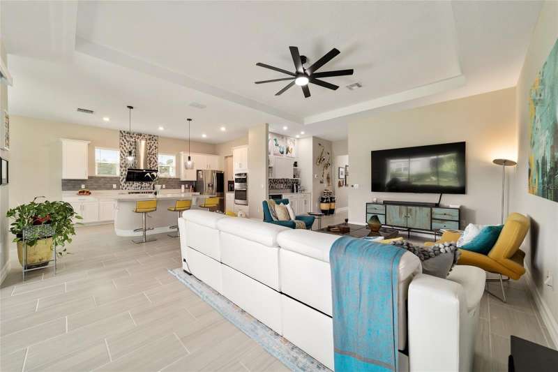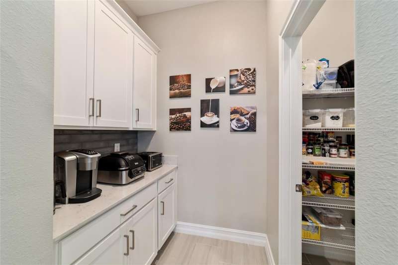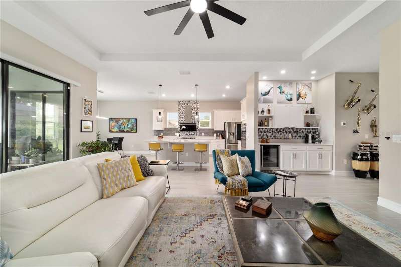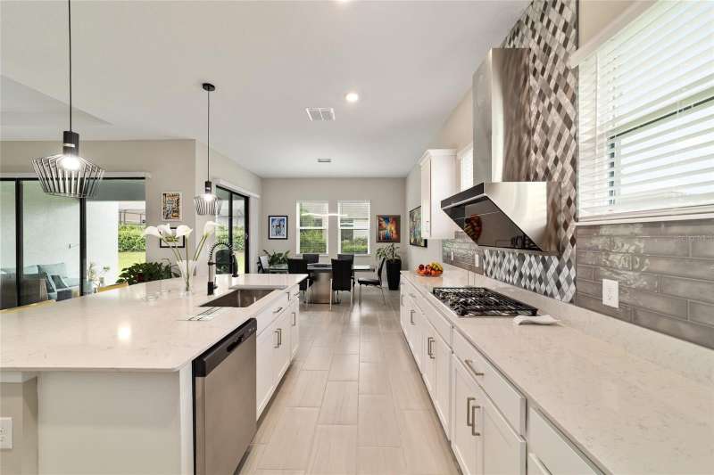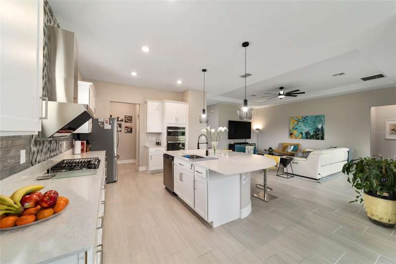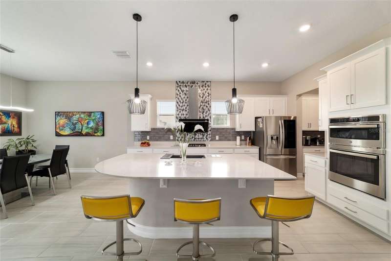 Welcome to your better than new, beautiful spacious Ocala home. This 3 car garage house built in 2022 and located in the desirable gated community of Bellechase is a must see. Situated on a corner lot just over 1/3 of an acre, this home offers a peaceful, nature inspired setting while being just minutes from Ocala’s shopping, dining, medical centers and downtown. Inside, you’ll love the bright open layout with tile floors throughout the main living areas and carpet in the bedrooms. The gourmet kitchen is truly the heart of the home, designed with a large island topped with quartz countertops. The custom tiled backsplash compliments the rare vented hood. It features a walk-in pantry and bonus butlers station with cabinetry, ideal for a coffee bar or prep station with matching tiled backsplash. The kitchen flows seamlessly into the family room and dining area, both with sliding doors that open to the covered patio, creating a natural extension of the living space. The split bedroom floor plan is perfect for family or guests, with two bedrooms sharing a full bath and another bedroom featuring its own private bath, making it the perfect guest suite. The spacious primary suite is a relaxing retreat. The onsuite features updated temperature-controlled faucets, quartz counters, a freestanding tub and a spacious walk-in shower. This home is filled with thoughtful upgrades throughout, including modern lighting, ceiling fans, extra cabinets and shelving. Enjoy the custom bar with LED accent lighting and wine fridge. This home boasts an efficient tankless hot water heater and wireless irrigation system. The 3 car garage features a durable true-grit floor finish with plenty of room for storage or hobbies. Outside, the nicely landscaped yard with upgraded lighting creates a welcoming backdrop for evenings spent outdoors. New gutters were added across the back of the home in October 2025. Living in Bellechase means enjoying beauty, privacy, and security in one of Ocala’s most sought after neighborhoods with sidewalks and walking paths throughout.