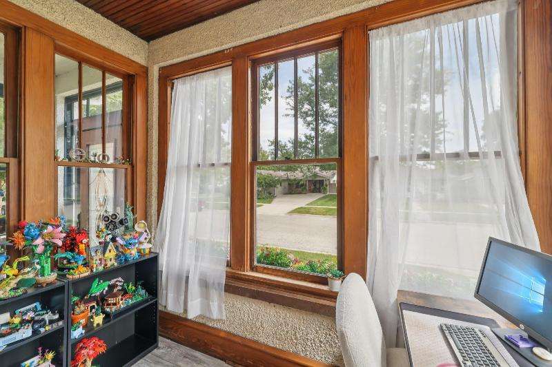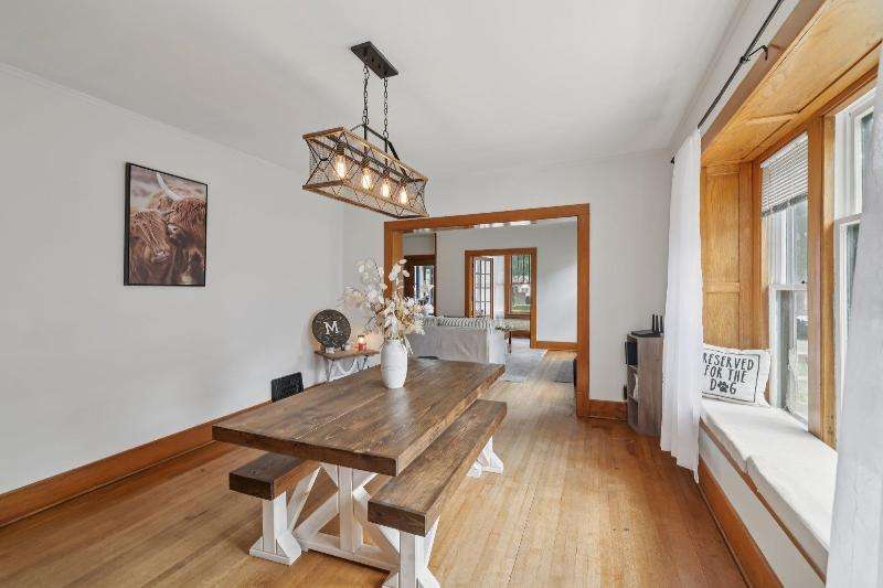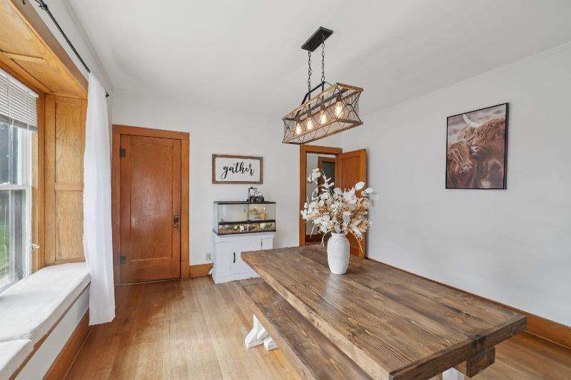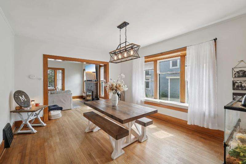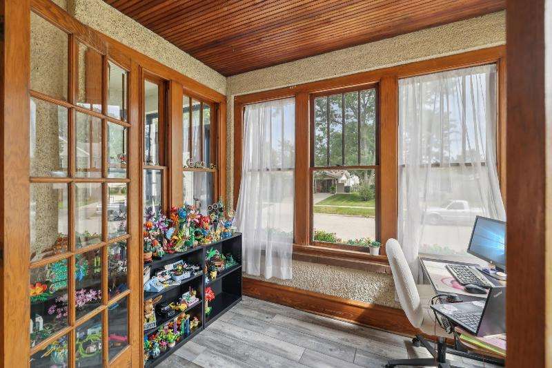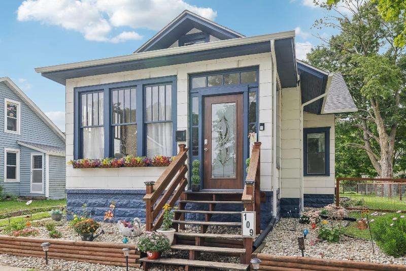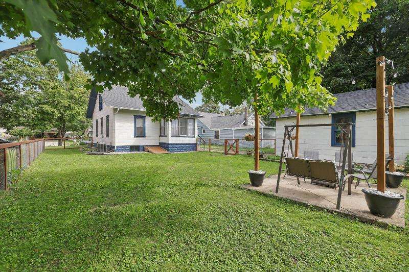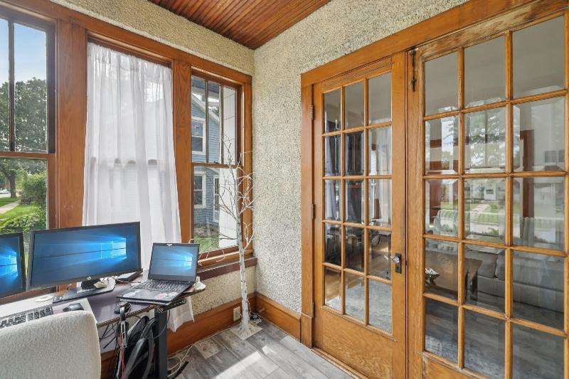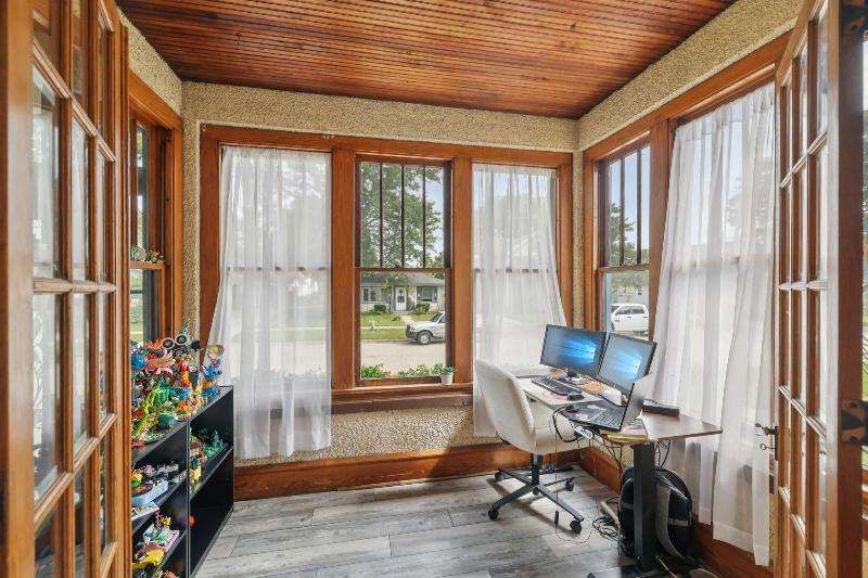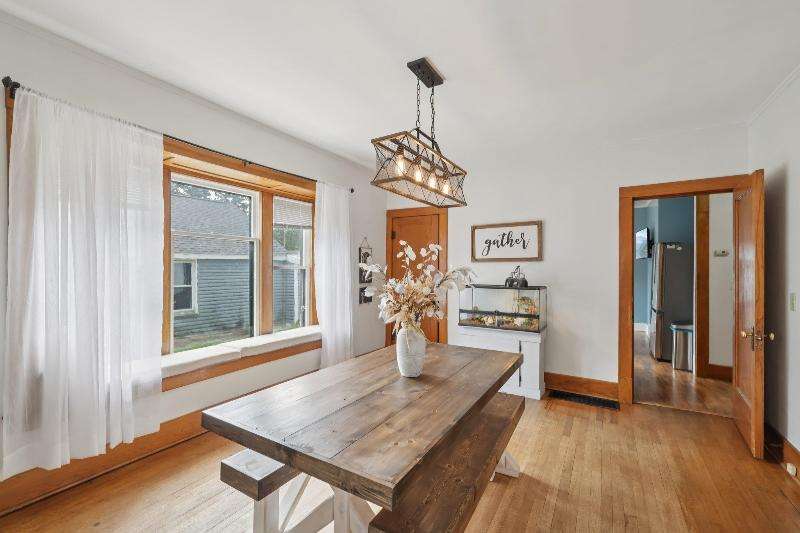 This charming bungalow in Evansville's Historic District blends historic character with modern updates. Original hardwood floors, rich woodwork, and 9 ft. ceilings highlight the main level. French doors open to a front sunroom filled with light, while the dining room features a window seat and space for gatherings. The updated kitchen includes white cabinetry, stainless appliances, and stylish finishes. Upstairs, the finished walk-up attic serves as the spacious primary bedroom with private bath and closet. Additional features include a back sunroom with windows, a front office/den, and a full basement with tall ceilings and plenty of storage. Outside, enjoy the fenced yard, vibrant landscaping, and excellent curb appeal--steps from downtown shops, parks, and schools.