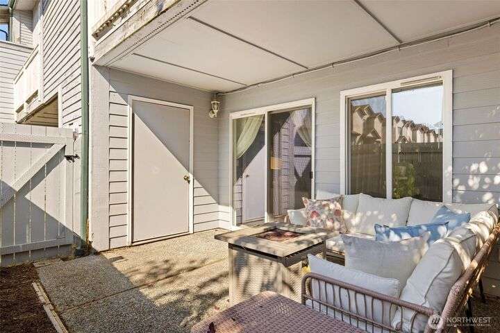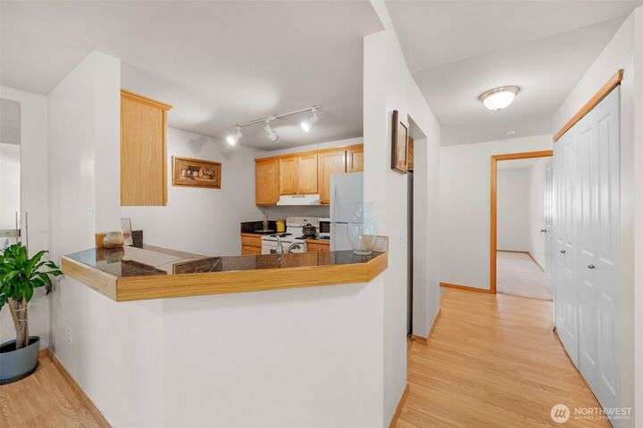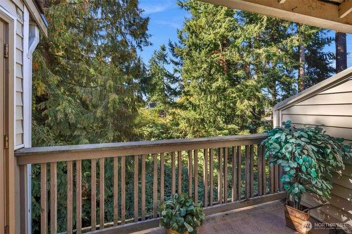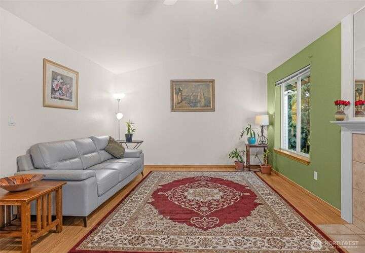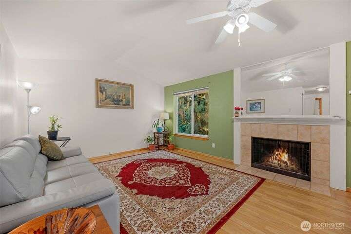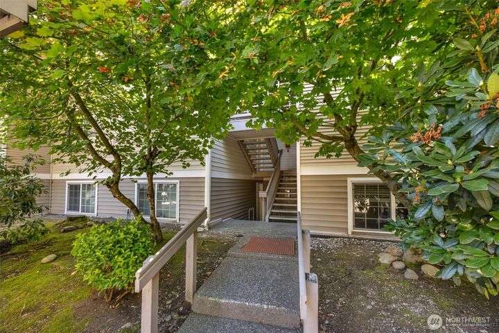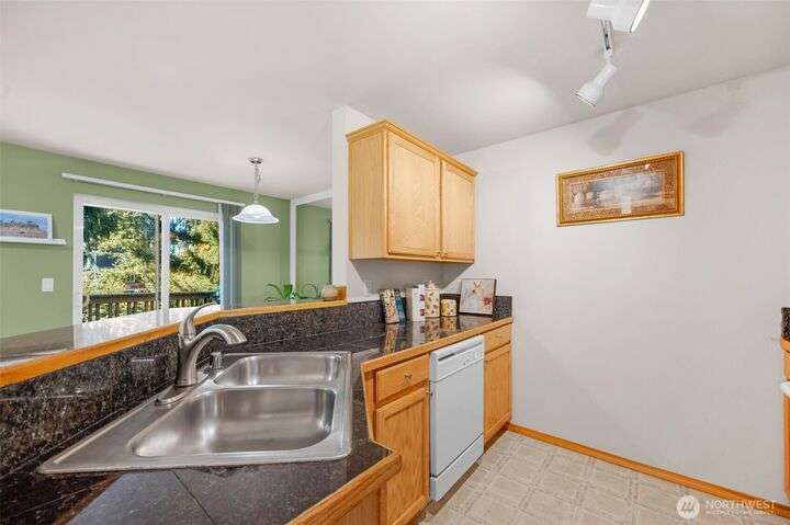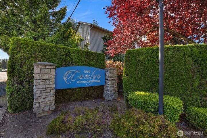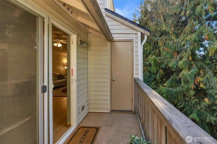 Welcome to this top-floor, bright, western-facing home, situated in the quietest and most private corner of this community. The open-concept design connects the kitchen, dining area, and living room for a spacious & inviting feel. The kitchen features granite tile counters, walnut cabinets, and a seating counter. The living room boasts a vaulted ceiling, and a fireplace provides comfort and style. Two generously sized bedrooms and a classy full bath. Updated flooring, newer HWT, and W&D. Enjoy sunsets from your deck. Big Storage closet. Carport Parking in front. Awesome location minutes to Sound Transit Station, I-5, Silver Lake parks & beaches, Interurban Trail, Boeing/Paine Field. No Rental Cap. Dogs/Cats OK. Dues include. W/S/G