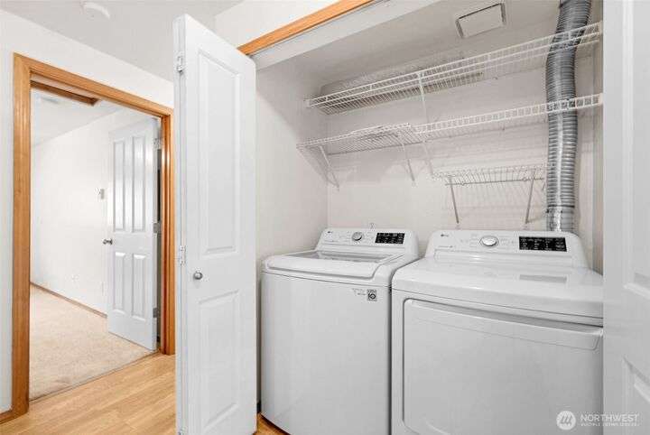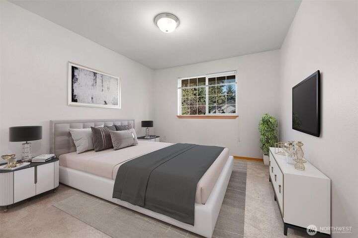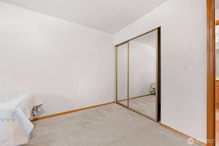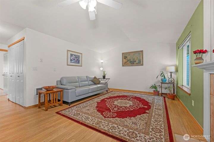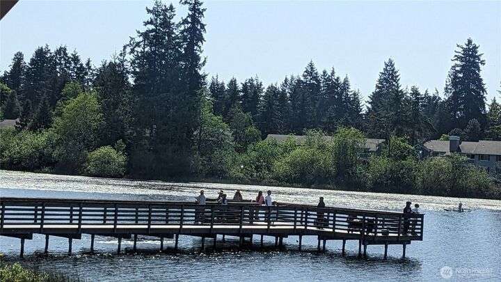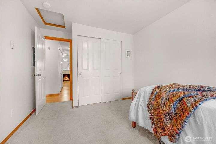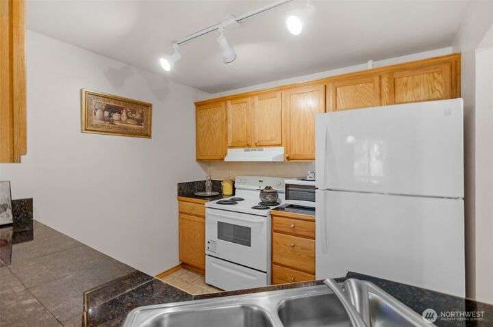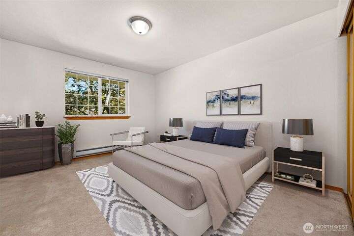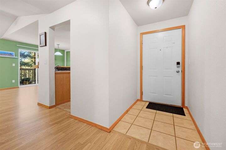 Welcome to this top-floor, bright, western-facing home, situated in the quietest and most private corner of this community. The open-concept design connects the kitchen, dining area, and living room for a spacious & inviting feel. The kitchen features granite tile counters, walnut cabinets, and a seating counter. The living room boasts a vaulted ceiling, and a fireplace provides comfort and style. Two generously sized bedrooms and a classy full bath. Updated flooring, newer HWT, and W&D. Enjoy sunsets from your deck. Big Storage closet. Carport Parking in front. Awesome location minutes to Sound Transit Station, I-5, Silver Lake parks & beaches, Interurban Trail, Boeing/Paine Field. No Rental Cap. Dogs/Cats OK. Dues include. W/S/G