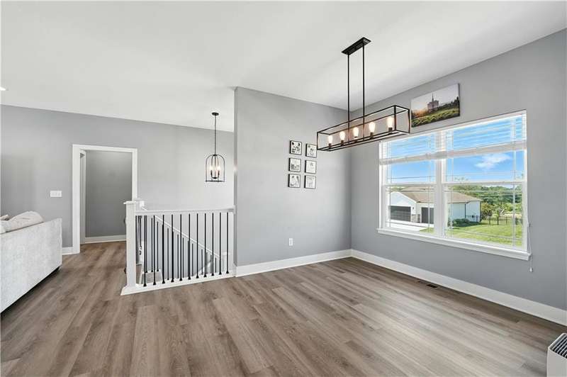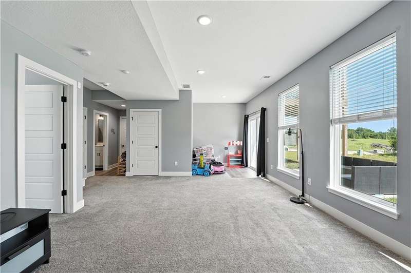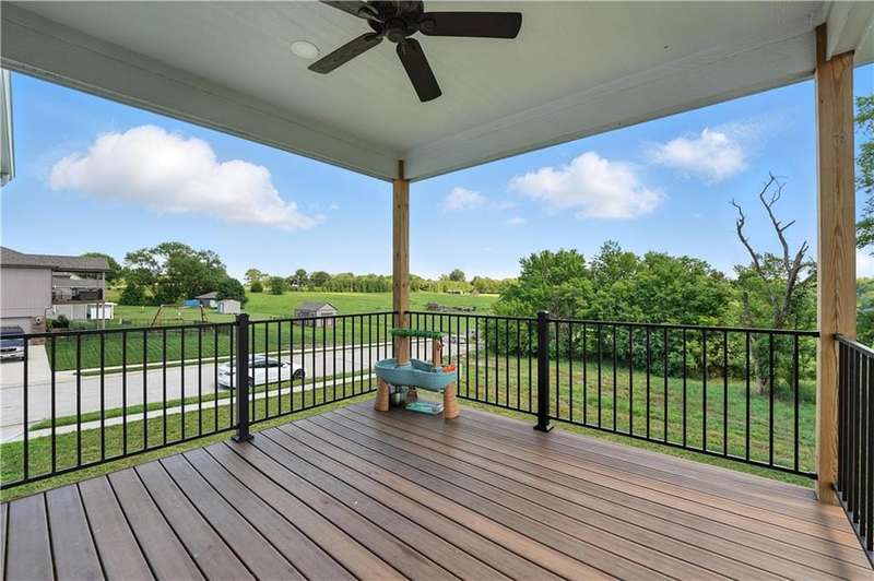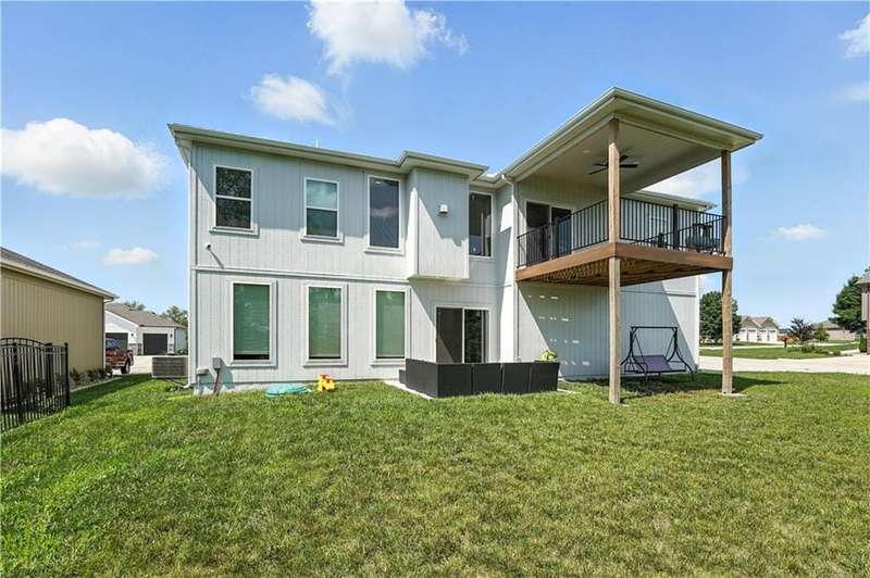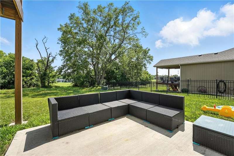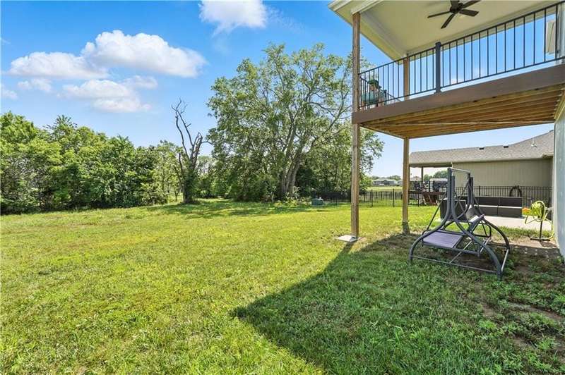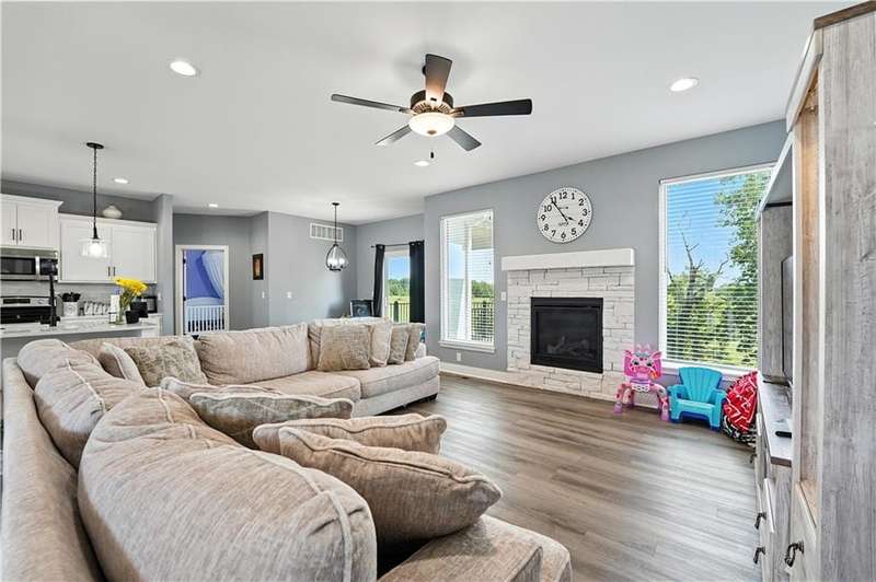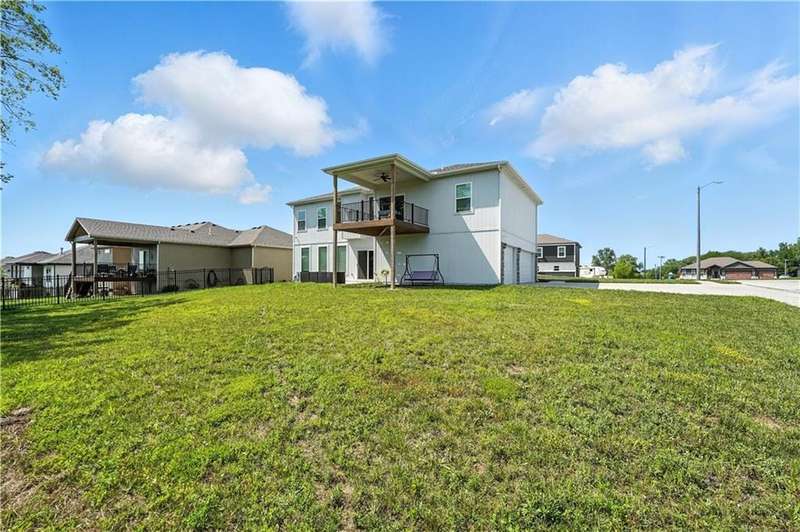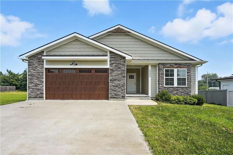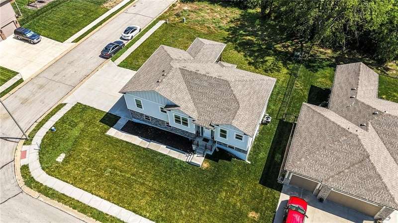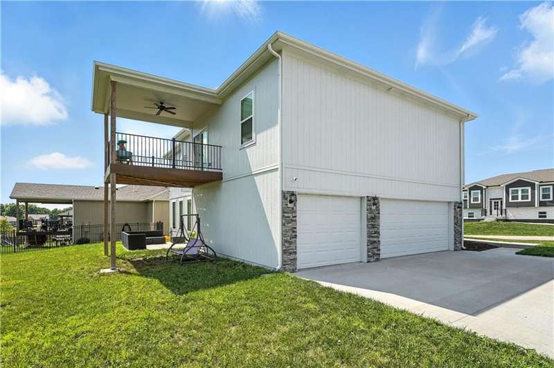 Welcome to this LIKE NEW raised ranch in Harrisonville's best neighborhood! Offering 4 bedrooms, 3 full baths, and a rare 3-car side-entry garageall on a spacious corner lot backing to peaceful green space. Built in 2021, this home features an open floor plan with over 2,000 finished square feet. The kitchen impresses with a large center island with bar seating, quartz countertops, custom soft-close cabinetry, tile backsplash, and a stylish barn sink. Enjoy natural light streaming through the floor-to-ceiling windows in the great room, which opens to a covered deck ideal for relaxing or entertaining. Off the kitchen, enjoy 2 dining areas and convenient laundry room with storage space. The primary bedrooms wows, featuring a tiled walk-in shower, jetted tub, double vanity, and a generous walk-in closet. Two additional bedrooms and another full bathroom are located on the main level, while the finished lower level includes a second living area, 4th bedroom/office, and a 3rd full bathplus walk-out access to the patio. Neighborhood walking trails and a serene community lake add to the appeal of Burris Ridge. Dont miss your chance to have modern conveniences with small-town charm!