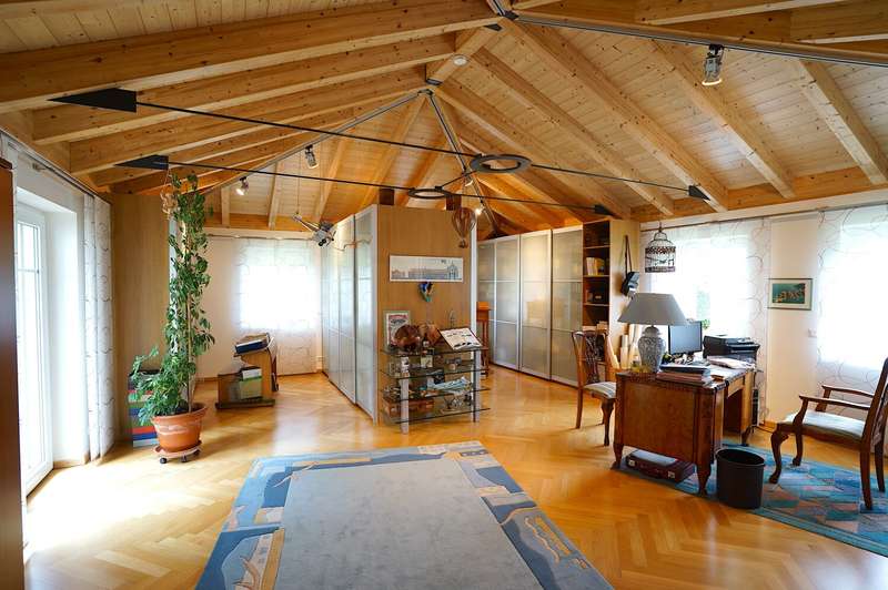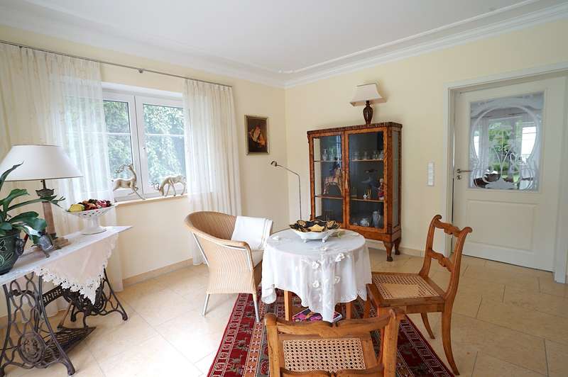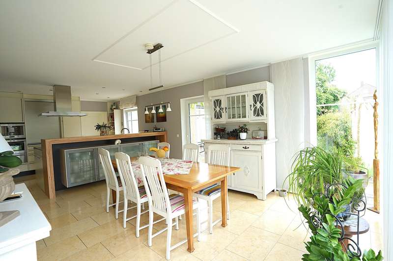 This prestigious villa from 2008 is situated on a generous plot of approx. 2,400 m² and offers plenty of space for individual living requirements with a living area of around 330 m². The property impresses with its modern architecture, high-quality construction and as-new condition. With a total of 10 rooms, including 4 - 5 separate bedrooms and 2 comfortable bathrooms, this house is ideal for families with high demands on space and living quality. The extension is ideal as an office or fitness area and is pre-equipped for use as a granny apartment. The spacious, open entrance area creates an inviting ambience as soon as you enter the house and stylishly connects the various living areas. High-quality marble and parquet flooring, underfloor heating and an energy-saving groundwater heat pump ensure a pleasant living climate all year round. The central living and dining area forms the heart of the house. Generous window areas offer plenty of natural light and a wonderful view of the green oasis. A wood-burning stove creates a cozy atmosphere on chilly days. The open-plan luxury kitchen, with adjoining pantry, is fully equipped and meets the highest standards of functionality and design. Here, both amateur chefs and guests will find plenty of space to enjoy and linger. The living rooms and bedrooms are characterized by flexible usage options and are complemented by the combination of high-quality materials and modern technology. There are also well thought-out technical features, such as electric shutters, underfloor heating throughout the house and exclusive fixtures in the hallway, dressing room and kitchen. The two bathrooms are equipped with sophisticated sanitary fittings and bathroom furniture and offer a high level of comfort. The west-facing balcony and several spacious terraces extend the living space outdoors and invite you to linger. The park-like grounds, with harmonious planting, offer numerous design options for leisure and relaxation. In the garden you will find a cozy and secluded retreat at any time of day. A particularly attractive aspect is the landscaped pond, which harmoniously complements the property and invites you to relax in the greenery. The spacious outdoor areas are ideal for social gatherings as well as quiet moments. Further advantages include the quiet and well-kept surroundings, the beautifully ingrown plot, which provides a high level of privacy. The luxurious and spacious kitchen as well as the high-quality fixtures and built-in furniture can be purchased for an additional € 60,000. The total price therefore amounts to € 2.55 million. The extensive plot has a total size of approx. 3,400 square meters, which is to be divided into two areas of approx. 2,400 square meters and 1,000 square meters. The plot of approx. 2,400 sqm is described in this offer. The other approx. 1,000 sqm are high-quality building land and this can also be acquired by agreement. This property offers discerning buyers an exceptional residential offer with plenty of open space and high-quality fittings. See for yourself and arrange a viewing appointment to get to know this special property in person.