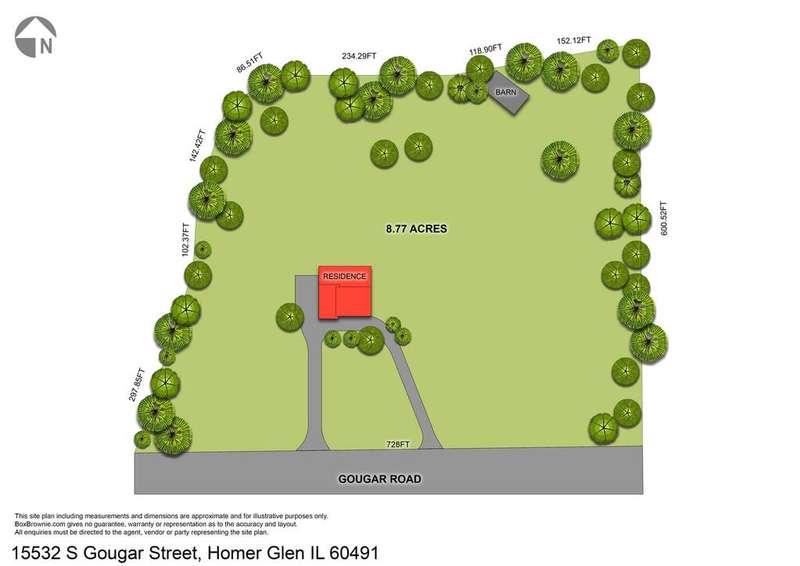 This stunning 3-story executive home, set on 8.37 acres, welcomes you with a beautiful entrance featuring a wooden staircase that leads to the second and third floors. The spacious living room flows seamlessly into the family room, offering ample space for entertaining or relaxing by the fireplace while enjoying the scenic view of nature and the deck, where deer often roam. The home includes 4 bedrooms and 2.5 bathrooms, with the potential to convert the 2.5-car garage into an additional bedroom, thanks to its large bay window. The well-appointed kitchen features a cozy breakfast area with a large fireplace and an island, making it the perfect gathering spot. In addition, there's a formal dining room that can comfortably fit a large family gathering or be converted into a home office, offering flexibility for your needs. The property also includes an unfinished basement with a mechanical room and a partially completed fireplace, providing a blank canvas for customization. A central vacuum system is available but hasn't been connected or used. The property features a 6-stall horse barn on the northwest corner. The owner previously had the property fenced and kept horses there, suggesting that a horse-riding business could be a viable option for this land. This includes equestrian training, horse rides, and similar services. While the barn requires extensive renovation, the potential for equestrian use adds another layer of opportunity. The home has recently updated systems, with a furnace and air conditioner replaced in 2021 and a new roof installed in 2018. Additionally, the property is served by an artisan spring water well. Currently zoned agricultural (A-1), the land offers great flexibility and potential. With 728 feet of commercial frontage along Gougar Rd, this property could be rezoned for commercial use or divided into smaller lots. Bring your renovation ideas or build your dream home on this beautiful property, abundant with wildlife and open green space. Rehabbers, investors, and builders-don't miss out! This property offers numerous possibilities, including rental income, a new business venture, a horse-riding enterprise, or mixed-use development with commercial frontage along Gougar Rd. It's ideally situated between two major interstate access points on IL-7/159th Street and IL-171/143rd Street, making it a prime opportunity for a variety of uses. Listed both as land and as a detached single-family residence. PLEASE NOTE: Do not walk the land without scheduling an appointment.