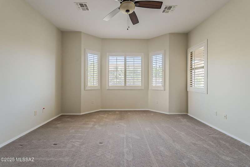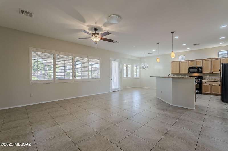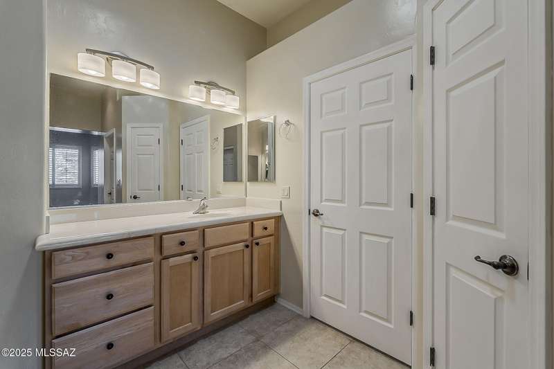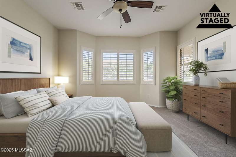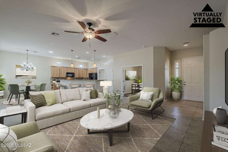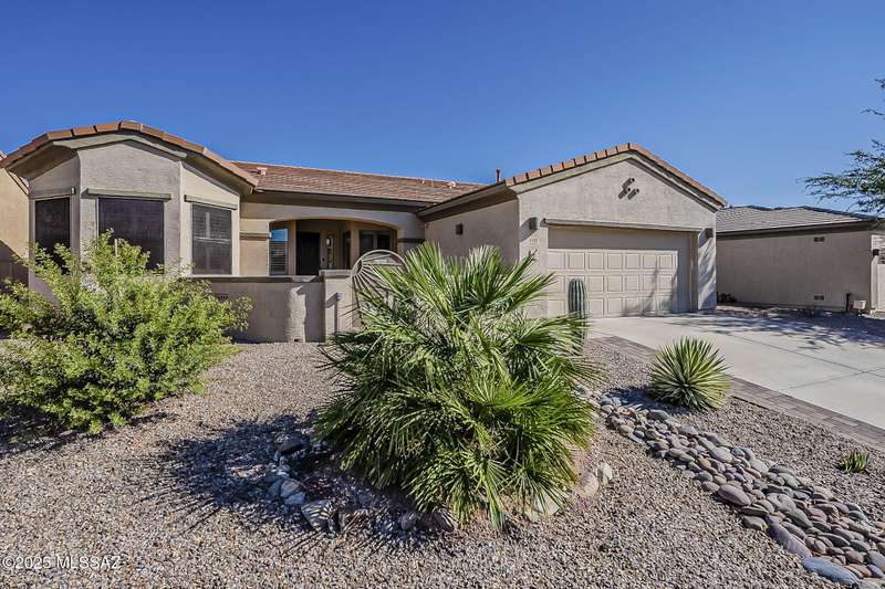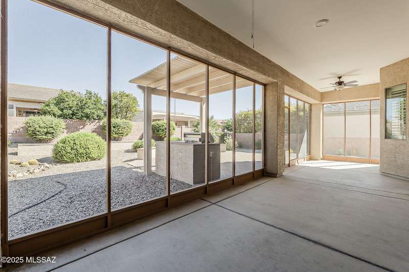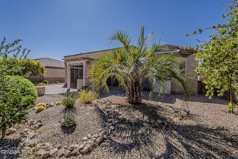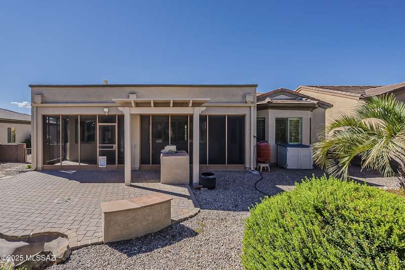 A paved courtyard welcomes you and visitors alike with gorgeous views of the Santa Rita Mountains. Step inside this meticulously cared for ''San Diego'' model and enjoy all the amenities that make this house feel like your very own ''Home Sweet Desert Home!'' Activities begin in the great room that features high ceilings, a breakfast bar, well equipped kitchen and shuttered windows. Spilling out into the screened porch, there is plenty of room to entertain or enjoy your solitude. The built in bar-b-que has a permanent pergola providing shelter from the sun, as well as storage for all your bar-b-que utensils and accoutrements. Built in benches are perfect for visiting by a fire-pit with the soothing sound of the waterfall and pond. The 2 bedrooms are ample sized with plenty of closet space