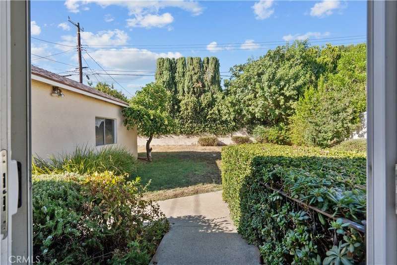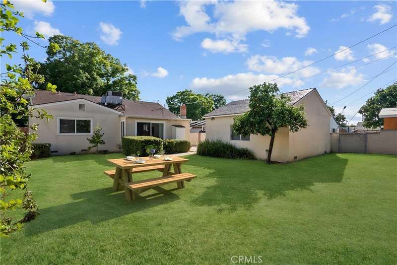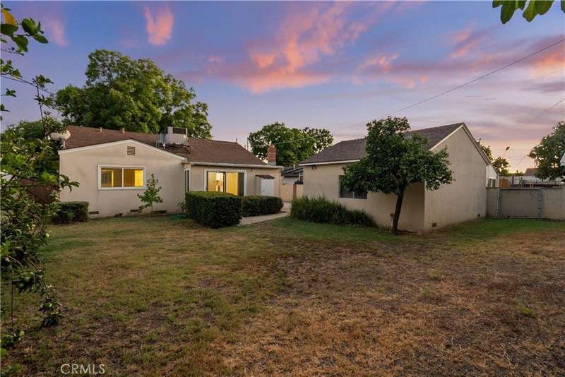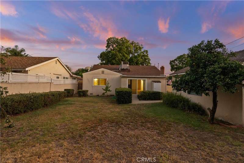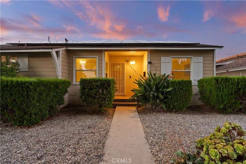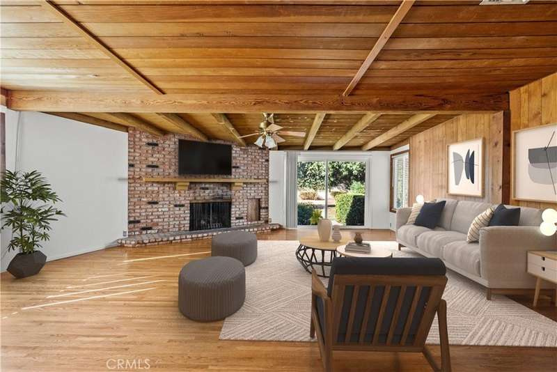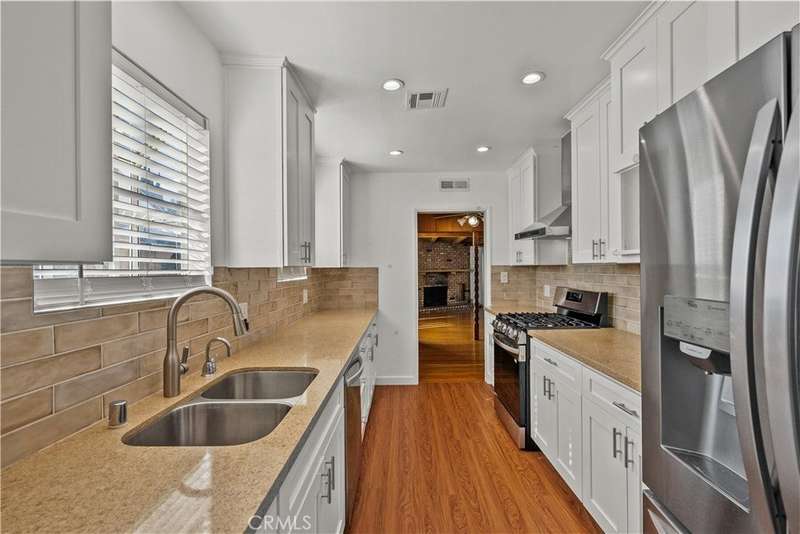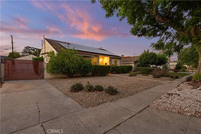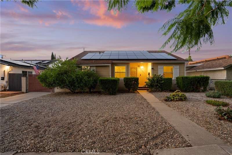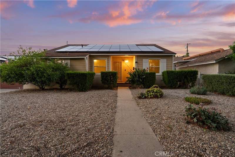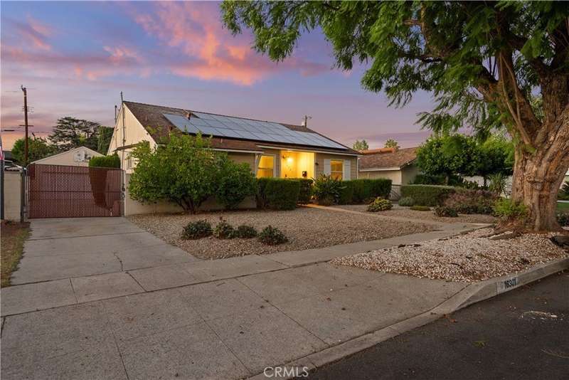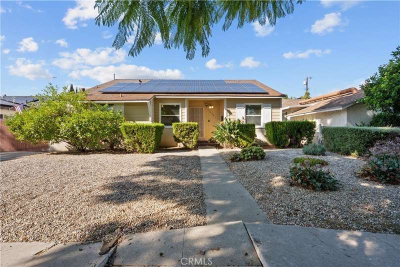 Tucked away on a quiet, tree-lined street in the sought-after Granada Hills neighborhood, this delightful mid-century home offers the perfect combination of vintage character and modern upgrades. Surrounded by a friendly, well-kept community, this home is ideal for comfortable family living. A welcoming front porch leads into a warm and inviting interior featuring hardwood floors, abundant natural light, and timeless architectural details throughout. With three bedrooms and two bathrooms, this home provides generous space for both relaxing and entertaining. The heart of the home is the remodeled cook’s kitchen, showcasing recessed lighting, crisp white shaker cabinets, quartz countertops, and a classic subway tile backsplash. Quality appliances include a gas range with vent hood, dishwasher, and refrigerator. Just off the kitchen is a functional laundry room with storage and access to the side yard. The cozy living room connects seamlessly to a dedicated dining area, accented by hardwood flooring and a ceiling fan light fixture—perfect for daily meals or festive gatherings. A spacious family room features wood-beamed ceilings, a brick fireplace, and sliding doors that lead to a private backyard, blending indoor comfort with outdoor living. The primary bedroom offers hardwood floors, dual closets, and an en-suite bathroom with a tiled stall shower and separate vanity. Two additional bedrooms are bright and well-sized, each with ceiling fans, hardwood floors, and ample closet space. A full hallway bathroom with a tiled shower-over-tub and a vanity serves these rooms. Step outside to the private backyard with a sprawling lawn and mature greenery—an ideal space for entertaining, play, or peaceful retreat. The extended concrete driveway and detached two-car garage offer abundant parking and storage. Thoughtful upgrades include central air and heat, dual-pane windows, and mostly copper plumbing. The large backyard with detached garage provides excellent potential for a freestanding Accessory Dwelling Unit (ADU).Conveniently located near schools, shopping, dining, and freeway access, this move-in ready gem combines classic style with today’s comforts—ready for you to call home.