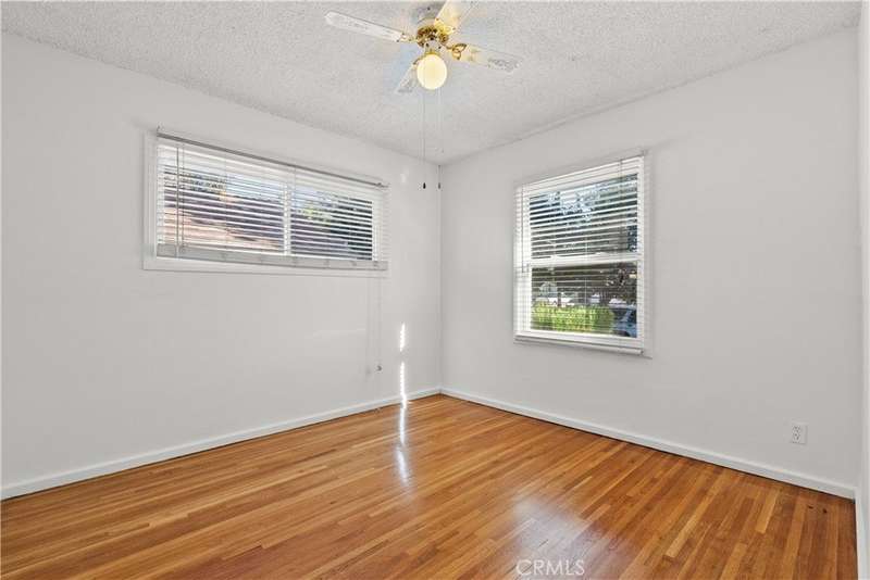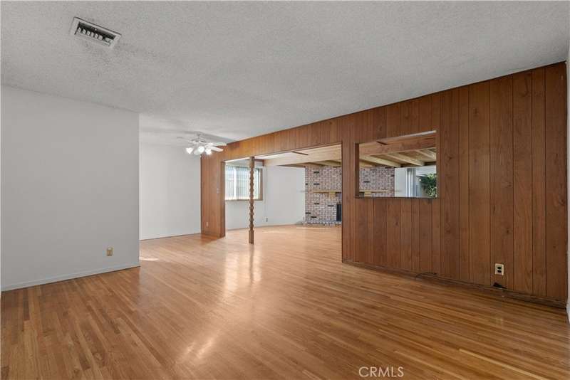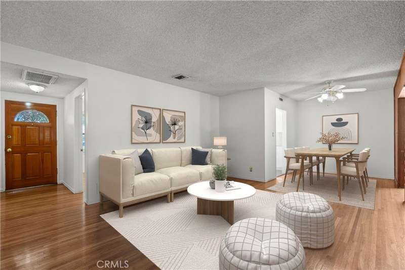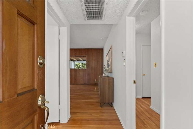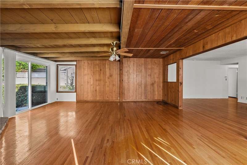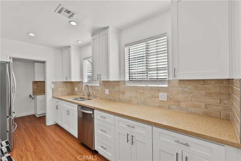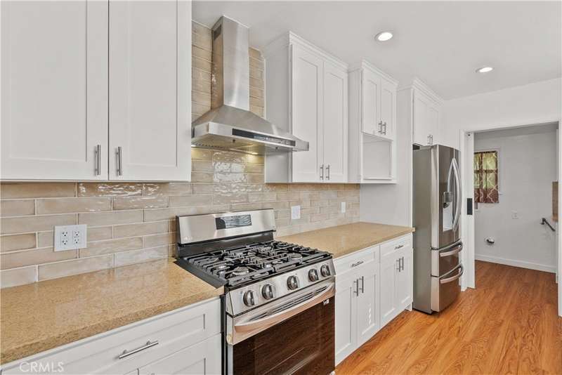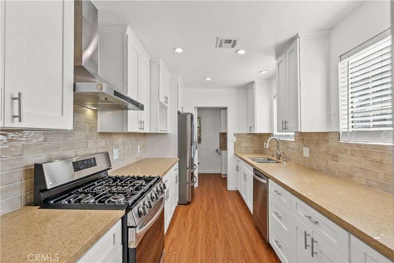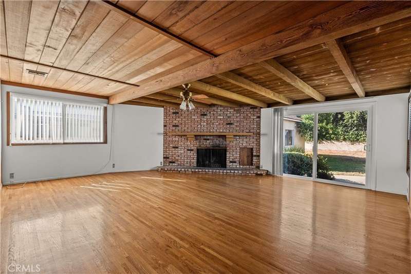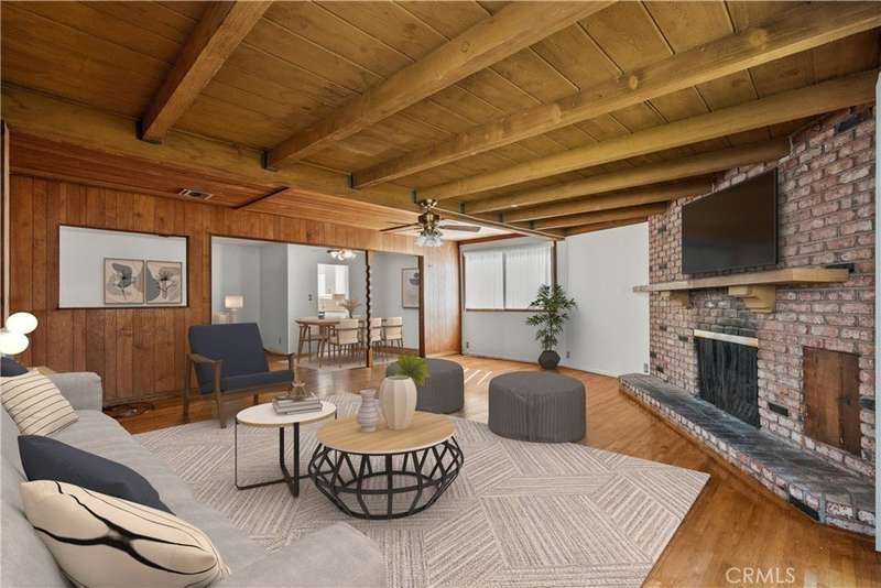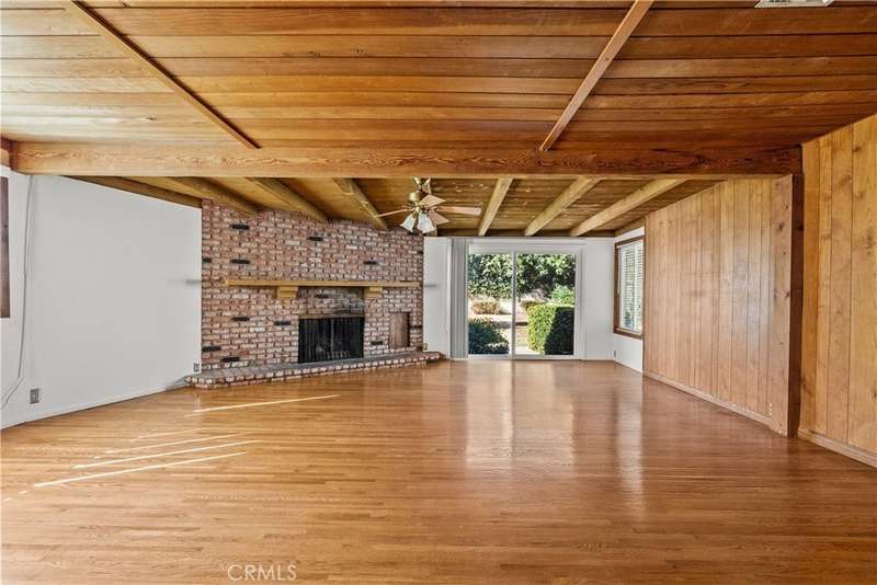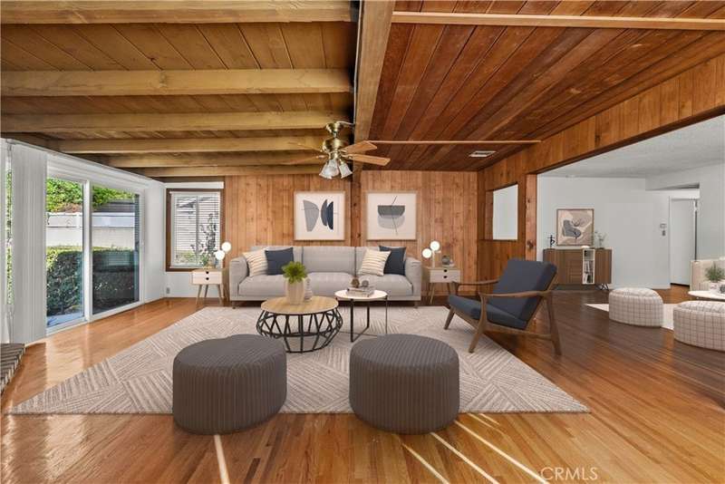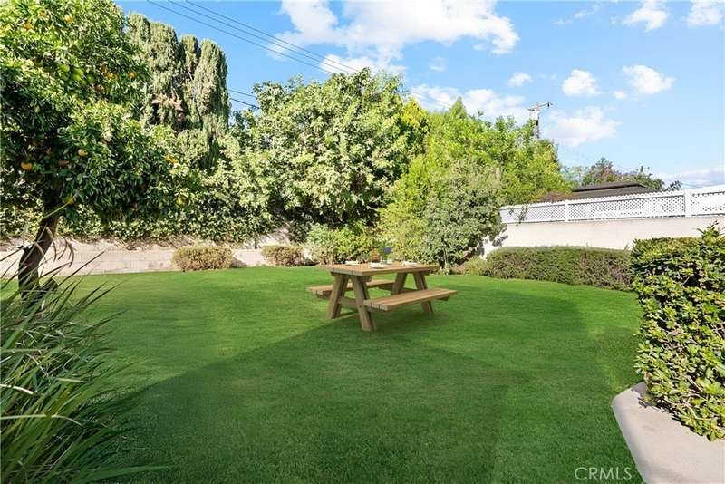 Tucked away on a quiet, tree-lined street in the sought-after Granada Hills neighborhood, this delightful mid-century home offers the perfect combination of vintage character and modern upgrades. Surrounded by a friendly, well-kept community, this home is ideal for comfortable family living. A welcoming front porch leads into a warm and inviting interior featuring hardwood floors, abundant natural light, and timeless architectural details throughout. With three bedrooms and two bathrooms, this home provides generous space for both relaxing and entertaining. The heart of the home is the remodeled cook’s kitchen, showcasing recessed lighting, crisp white shaker cabinets, quartz countertops, and a classic subway tile backsplash. Quality appliances include a gas range with vent hood, dishwasher, and refrigerator. Just off the kitchen is a functional laundry room with storage and access to the side yard. The cozy living room connects seamlessly to a dedicated dining area, accented by hardwood flooring and a ceiling fan light fixture—perfect for daily meals or festive gatherings. A spacious family room features wood-beamed ceilings, a brick fireplace, and sliding doors that lead to a private backyard, blending indoor comfort with outdoor living. The primary bedroom offers hardwood floors, dual closets, and an en-suite bathroom with a tiled stall shower and separate vanity. Two additional bedrooms are bright and well-sized, each with ceiling fans, hardwood floors, and ample closet space. A full hallway bathroom with a tiled shower-over-tub and a vanity serves these rooms. Step outside to the private backyard with a sprawling lawn and mature greenery—an ideal space for entertaining, play, or peaceful retreat. The extended concrete driveway and detached two-car garage offer abundant parking and storage. Thoughtful upgrades include central air and heat, dual-pane windows, and mostly copper plumbing. The large backyard with detached garage provides excellent potential for a freestanding Accessory Dwelling Unit (ADU).Conveniently located near schools, shopping, dining, and freeway access, this move-in ready gem combines classic style with today’s comforts—ready for you to call home.