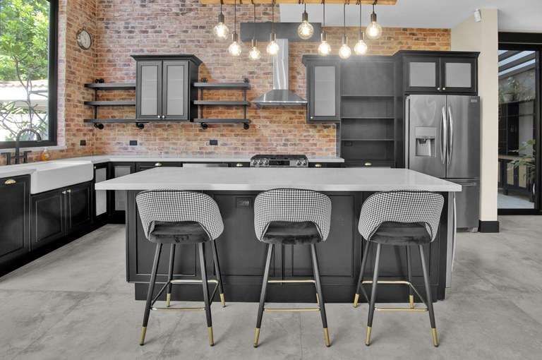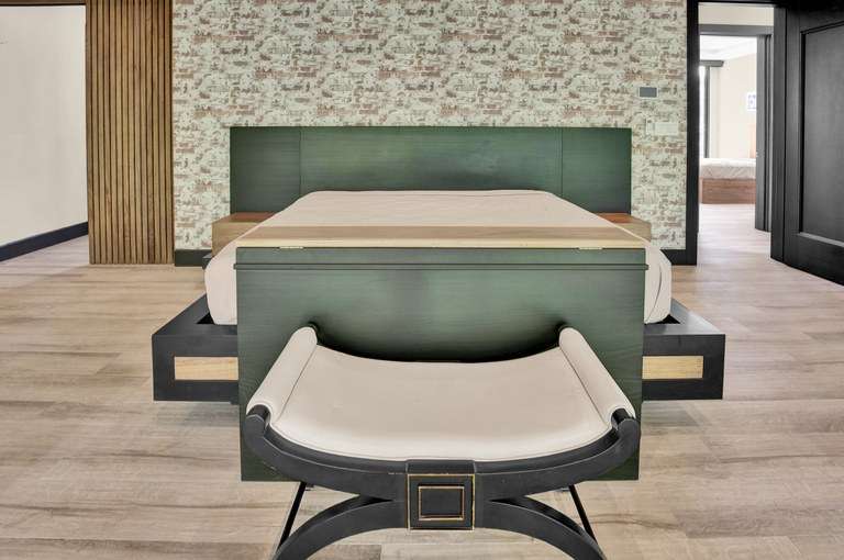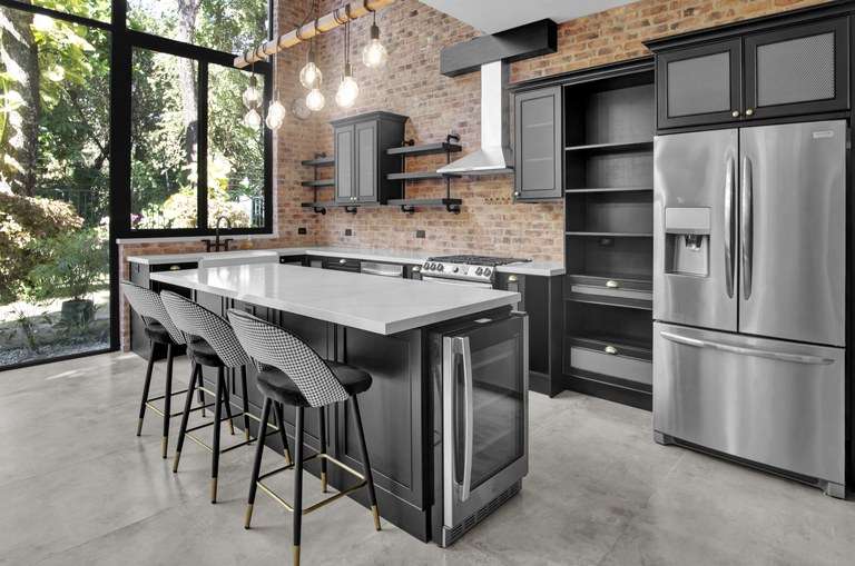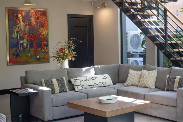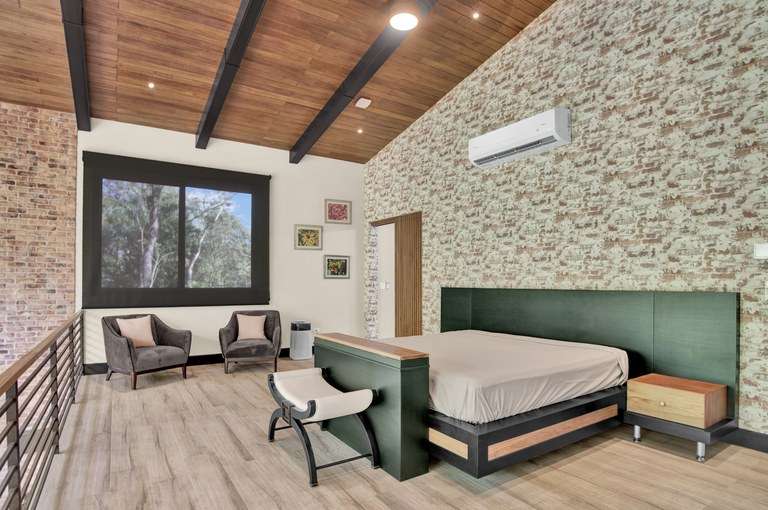- Loft-style architecture with wood accents