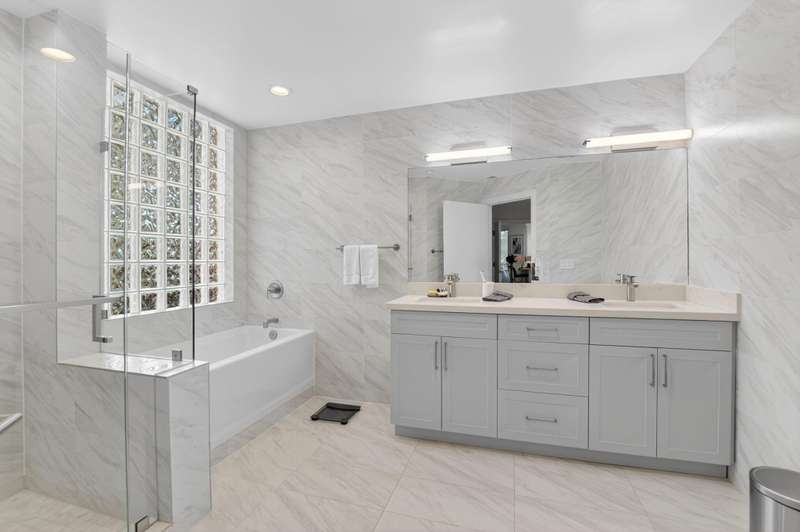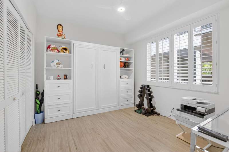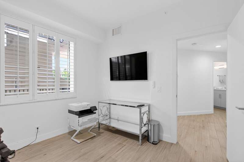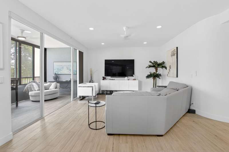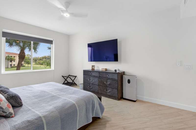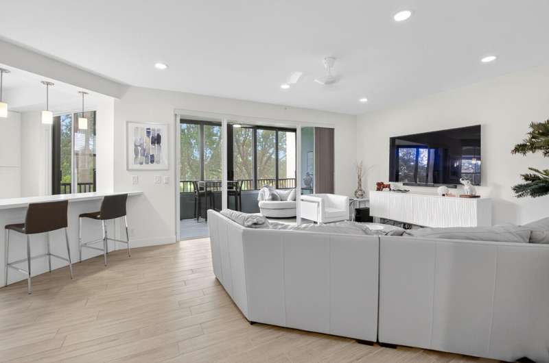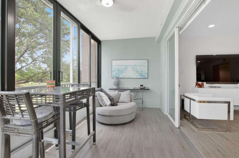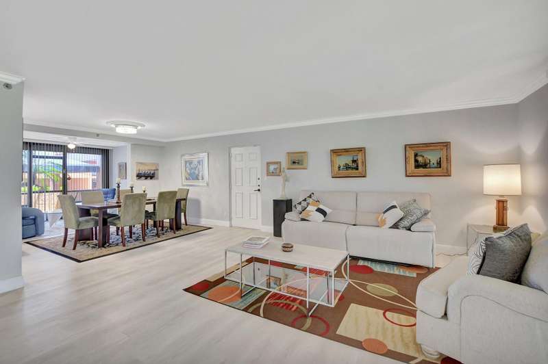 Exquisitely renovated 3/2 condo with designer finishes throughout. Elegant ''wood-look'' tile floors flow seamlessly through spacious living areas. Gourmet kitchen features white cabinetry, quartz counters, glass tile backsplash, and premium stainless appliances. Impact glass windows throughout! Enclosed patio offers serene garden and lake views. Lavish master suite with dual closets and spa-inspired bath. Both bathrooms fully updated with upscale finishes. Smooth ceilings, designer fans, full laundry room, Murphy bed in 3rd bedroom, 2024 A/C and 2023 water heater and so much more!!!. Move-in ready! Community has 2 pools, 2 tennis courts and a small clubhouse. One assigned covered parking space.