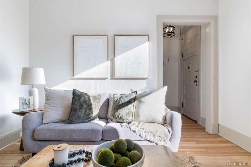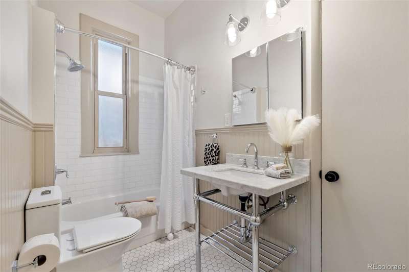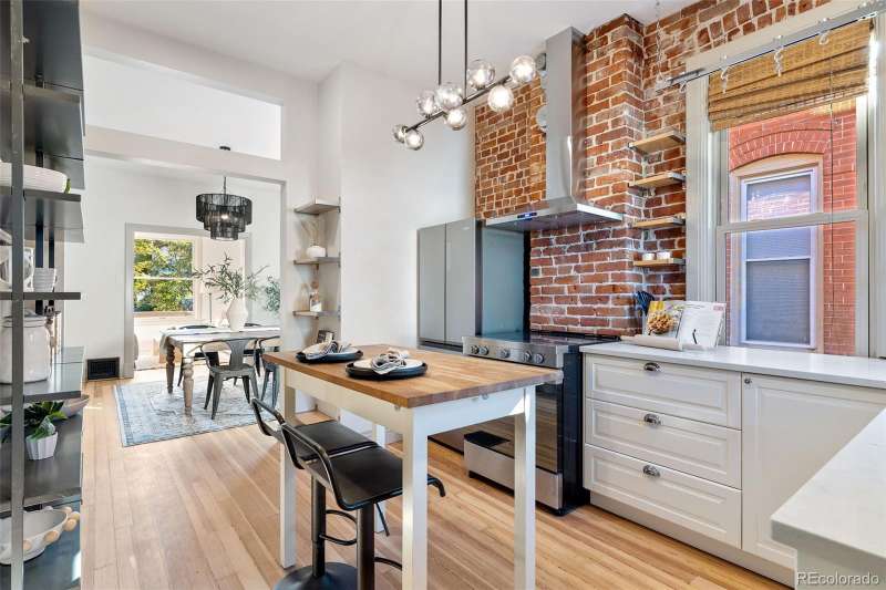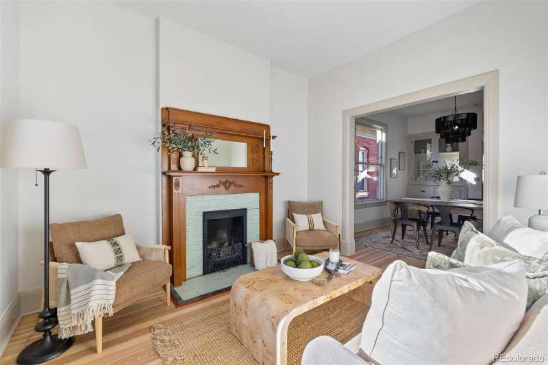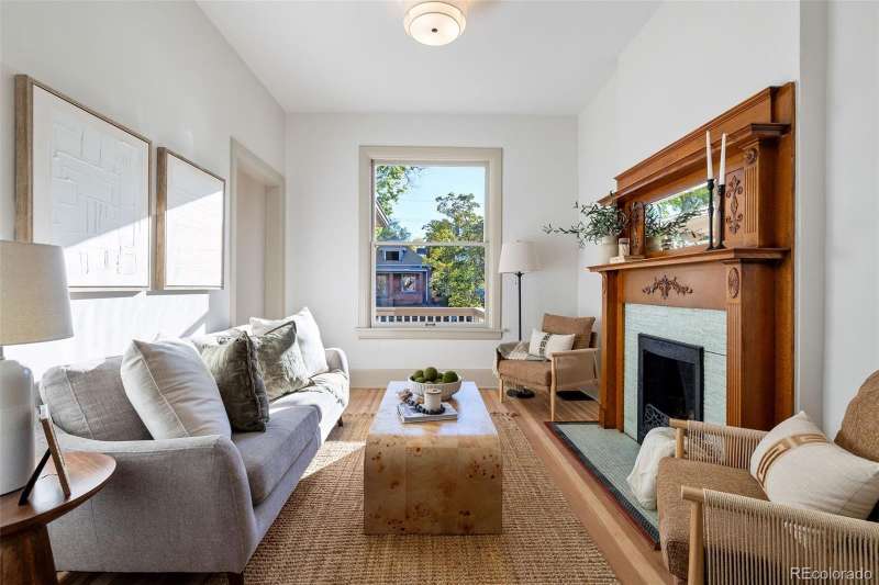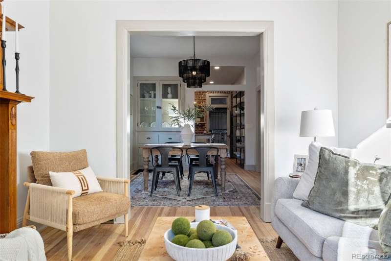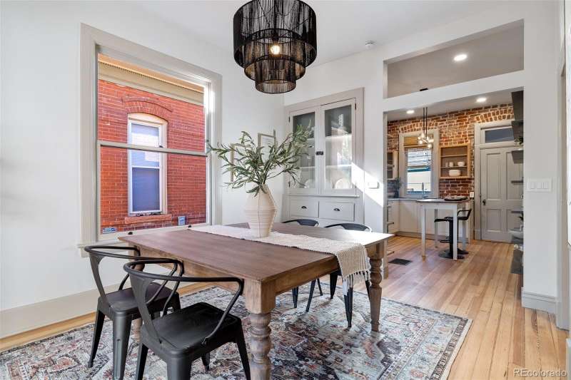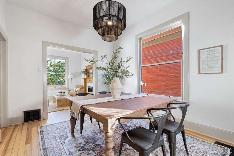 Beaming with natural light, this enchanting 1895 residence has been thoughtfully updated with a wonderful blend of historic character and modern convenience. Brilliant finishes include wood floors, high ceilings, exposed brick, all new lighting (inside and out), and large windows allowing abundant sunlight inside. Enter the classic home from the covered front porch to a welcoming living room with exquisite fireplace, open to a generous dining room with handsome built-in hutch and newer gourmet kitchen beyond, featuring white cabinetry, open shelving, quartz countertops, plus new range and refrigerator. The primary bedroom includes a spacious walk-in closet, and the new full bath is beautifully accented by lovely beadboard wainscoting, subway tile, and penny tile flooring. A second bedroom, laundry and mud room are also located on the main floor, and the lower level offers ample storage space and mechanical room. Impeccably maintained and upgraded throughout, this red brick charmer is complete with private back yard including large patio with firepit, and oversized two-car garage. Positioned perfectly on a delightful treed street, just blocks from Washington Park, and near all of the retail shops and restaurants residing in Downtown Denver and Cherry Creek.