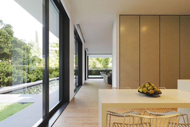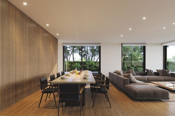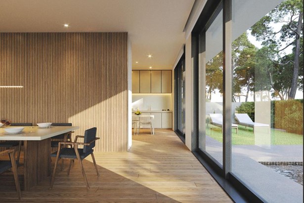 The ground floor has access to the garden (185m2) with a swimming pool from every space and consists of a kitchen with two entrances, a WC and room with its own bathroom that could be used as a service room or office space.