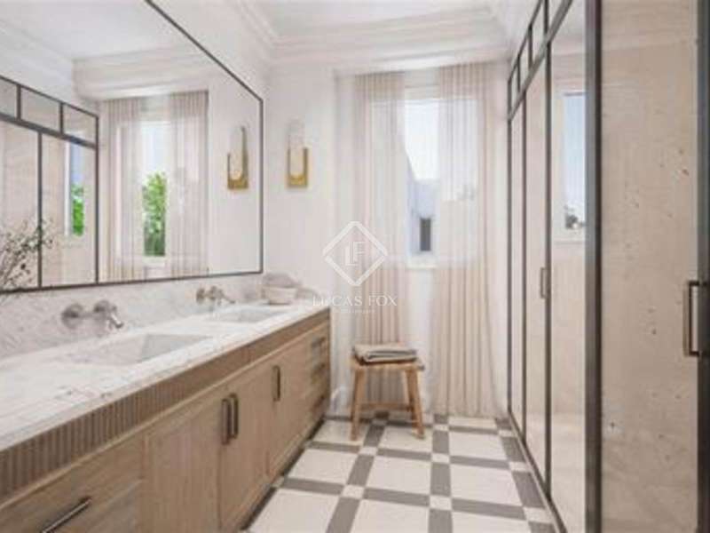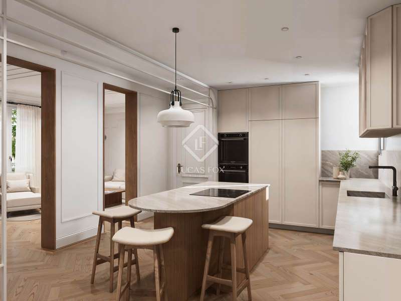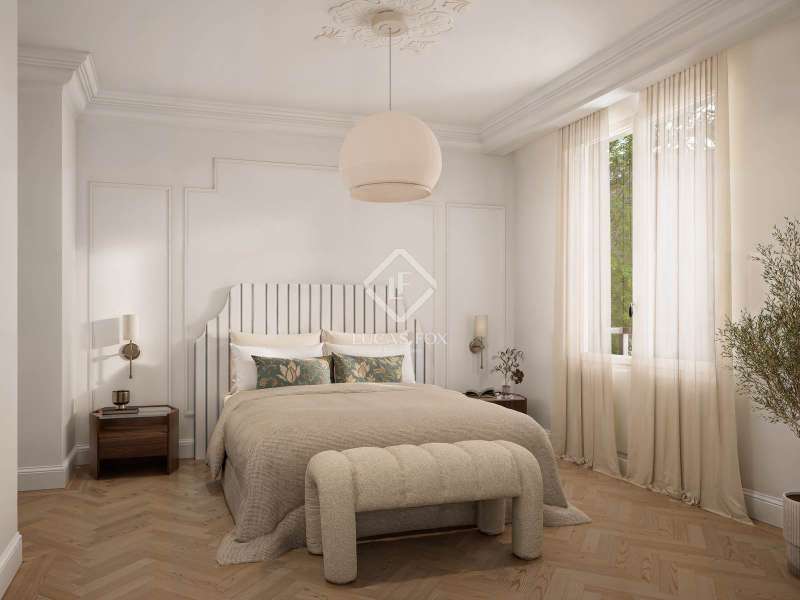 Lucas Fox presents this elegant 208 m² property located on the fifth floor of a classic building on General Oráa Street, in the heart of the Salamanca neighbourhood . The building features a concierge , an original elevator, a stately entrance, a parking space, and a storage room. Currently undergoing a complete renovation by Mónica Diago's studio, the project reinterprets the classic Madrid apartment with a contemporary, bright, and balanced style. The day area offers a spacious social space with a living room, dining room , and open-plan kitchen with a central island and high-end appliances . Large balconies and a corner bay window guarantee unobstructed views and abundant natural light. The private area consists of three double bedrooms with en-suite bathroom and built-in wardrobes. The main bedroom includes a dressing room, a designer headboard, and an additional room opening onto a bright courtyard, which could be used as a private living room or a fourth bedroom. The renovation incorporates fine materials and exclusive details: Hungarian oak floors, custom woodwork and moldings, wooden windows, restored shutters, and thoughtful lighting. With a garage, storage room , and a prime location, this property combines character, design, and functionality in one of Madrid's most distinguished and well-connected areas.