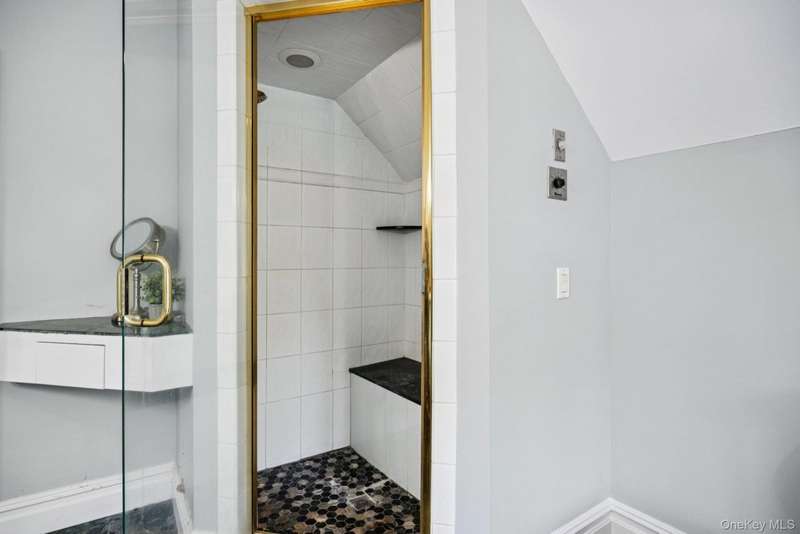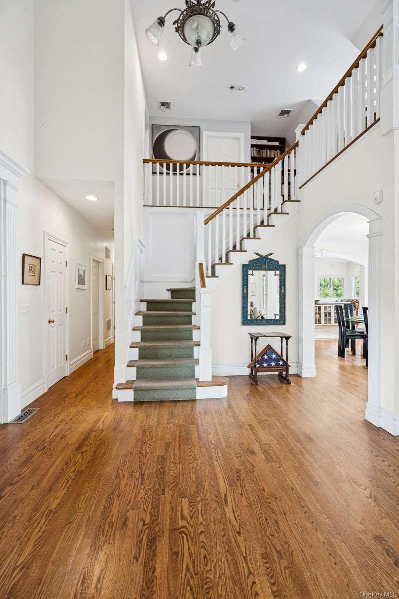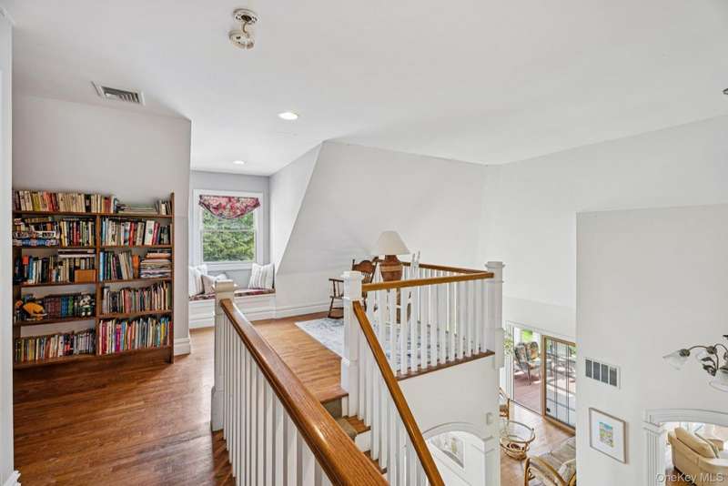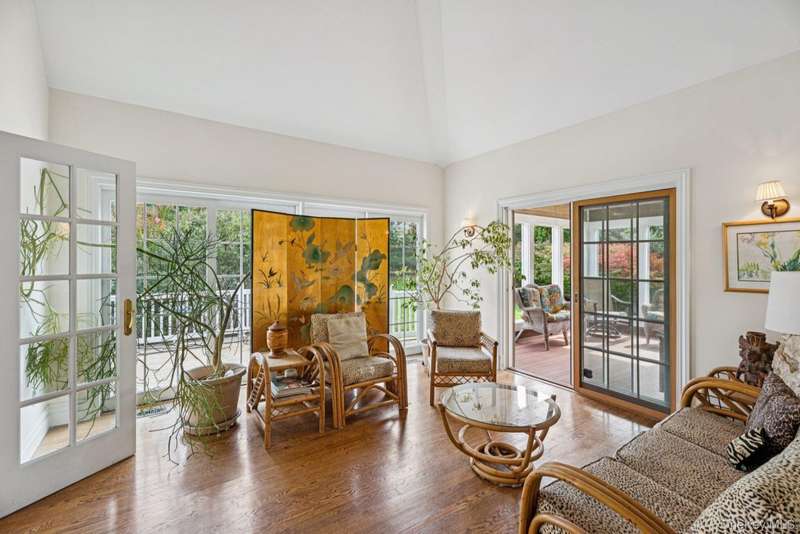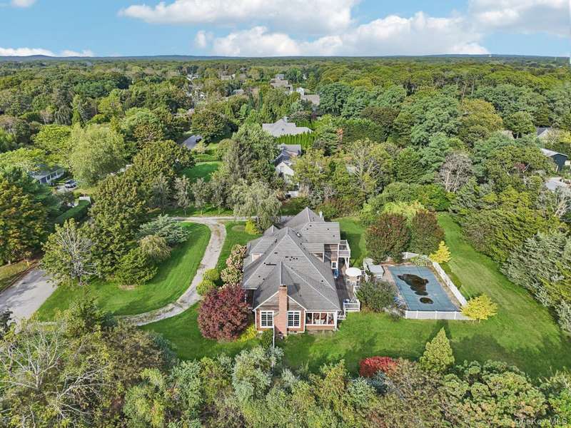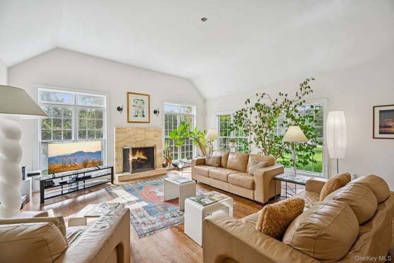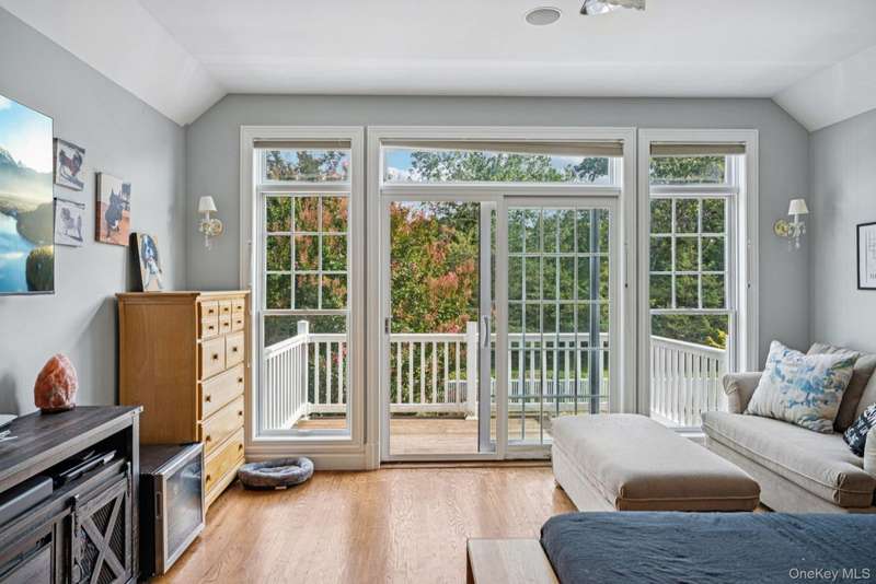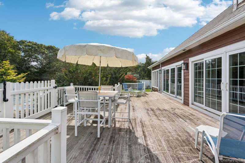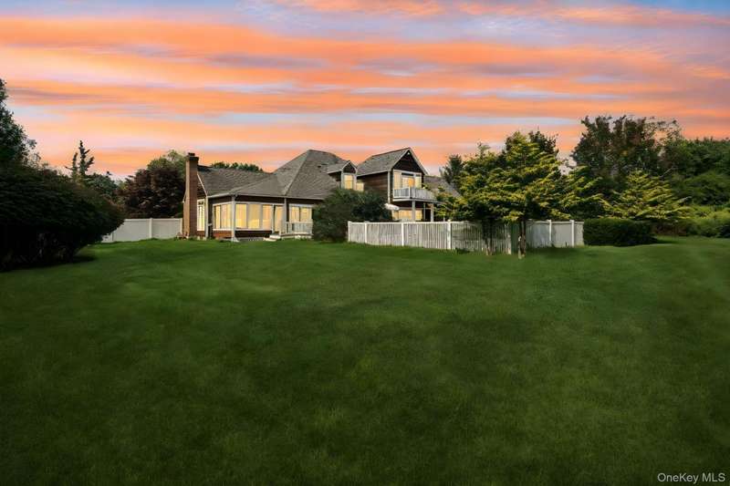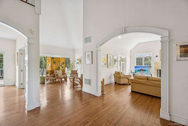 Experience the perfect harmony of sophistication and comfort in this captivating post-modern residence, where every detail has been artfully curated to elevate East End living. Comfortably set on 1.4 acres, this 3,500-square-foot home combines architectural artistry with refined amenities.Hardwood oak floors extend throughout, complemented by soaring cathedral ceilings and recessed lighting that create a luminous, welcoming ambiance. Floor-to-ceiling Pella windows bathe the interiors in natural light, while expansive sliders dissolve the boundary between indoor and outdoor living. French doors provide both privacy and elegance as they open gracefully into the formal dining area, where timeless ceiling details further enhance the atmosphere of refinement.A rare focal point, the living room fireplace is encased in imported marble, striking a balance between uniqueness and grandeur. Arched passages add architectural artistry, while an additional entertainment space - complete with a surround-sound system - invites vibrancy and rhythm, allowing music and life to flow effortlessly throughout the open design. Each room is further distinguished by custom crown and base moldings, a showcase of craftsmanship at its finest.The first level presents three spacious bedrooms and two full baths, blending comfort with thoughtful design. A dedicated laundry/mudroom, complete with newer washer and dryer, enhances convenience alongside a central vacuum, a two-car attached garage, and a full walk-out basement. The chef's kitchen is both functional and striking, featuring black granite countertops, a center island, and custom cabinetry. Outfitted with a Viking stove, double oven, and new Samsung stainless steel appliances, it offers the perfect stage for culinary mastery. A sunlit breakfast nook encased in Pella windows provides a serene spot to begin the day, while the formal dining room sets an elevated stage for gatherings of every scale.Upstairs, a built-in library inspires culture and contentment, while a welcoming primary suite offers a private balcony and an additional sitting area. The ensuite bath is a true sanctuary of wellness, featuring a double vanity, an Aquatic jetted soaking tub, and an E-Steam sauna/shower designed to promote relaxation and rejuvenation. An additional upstairs bedroom provides versatility - ideal as a nursery, guest room, or private office - ensuring the home adapts gracefully to evolving lifestyles.While a classic mahogany front porch offers a gracious welcome, the backyard unfolds into a