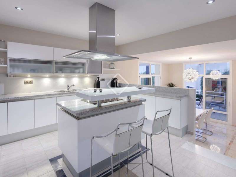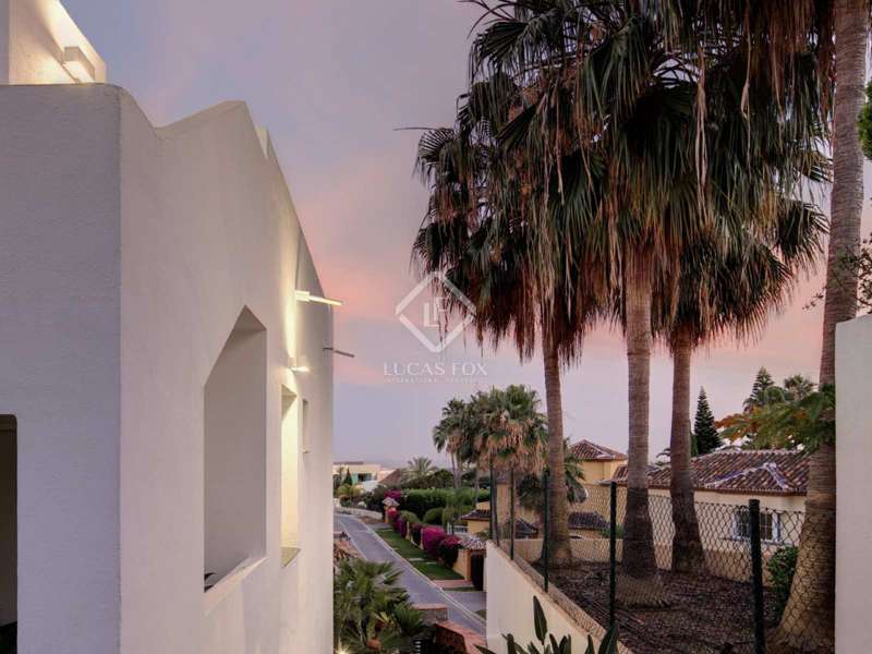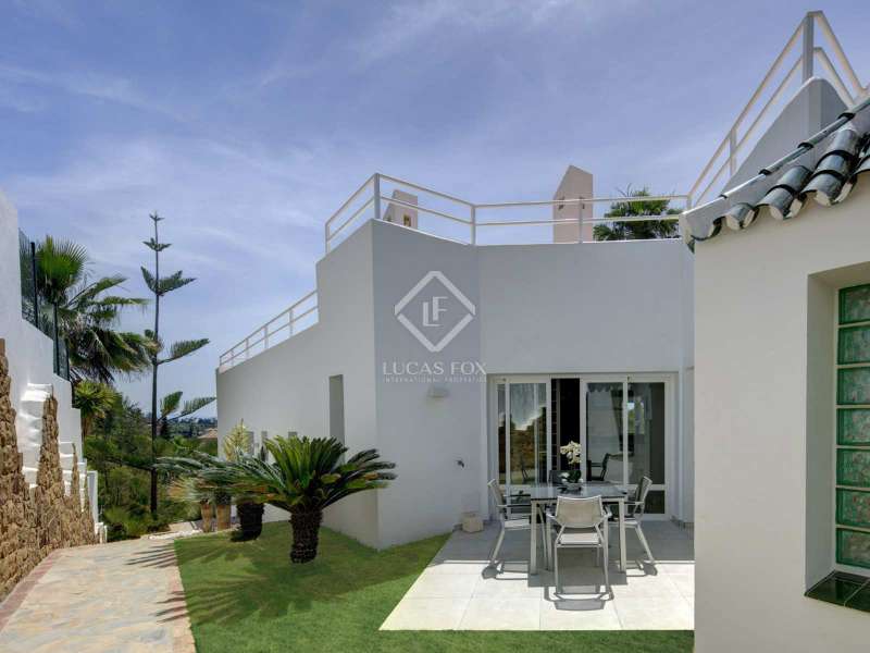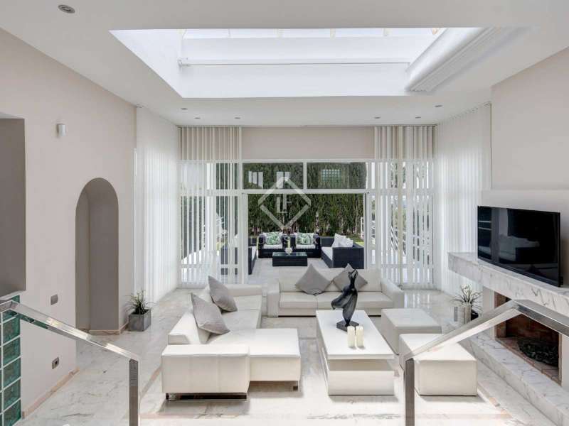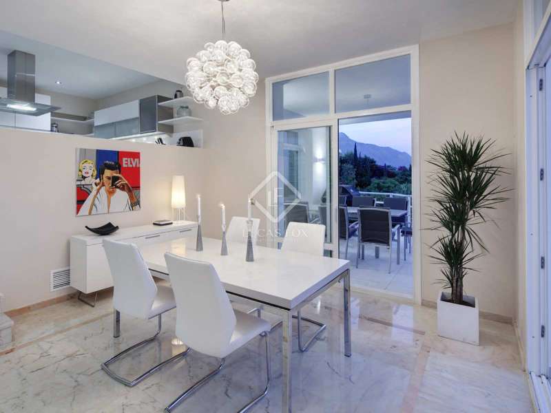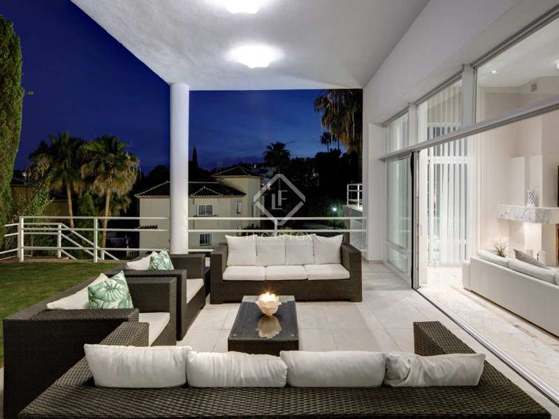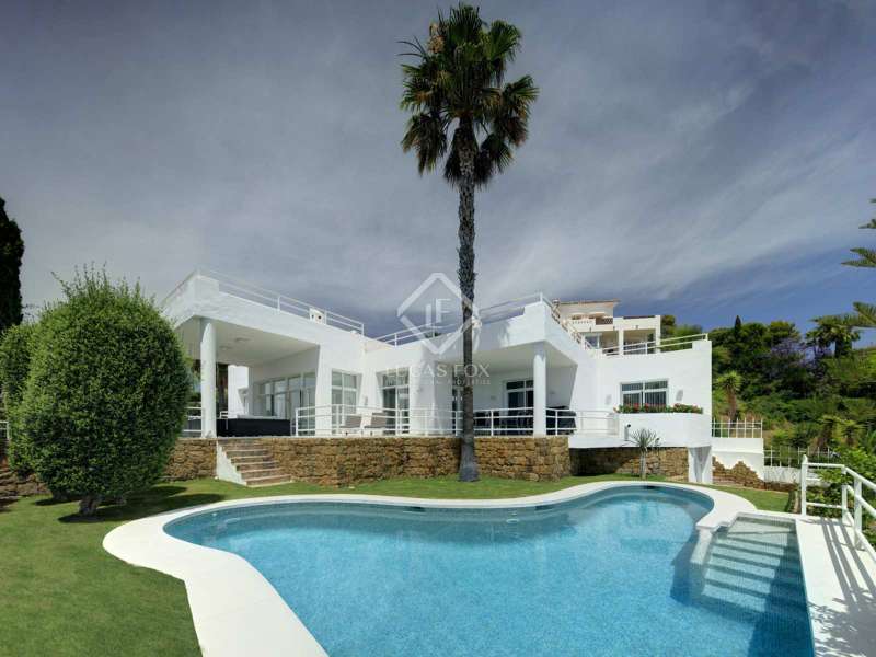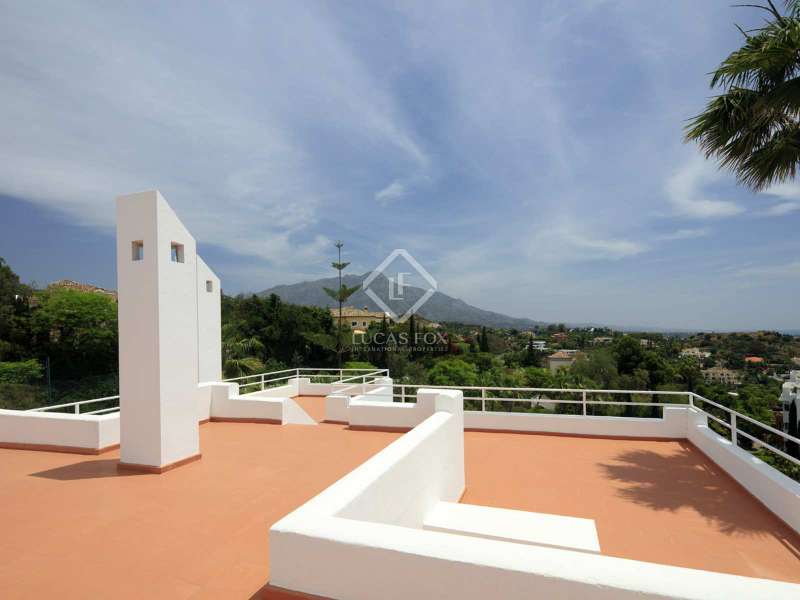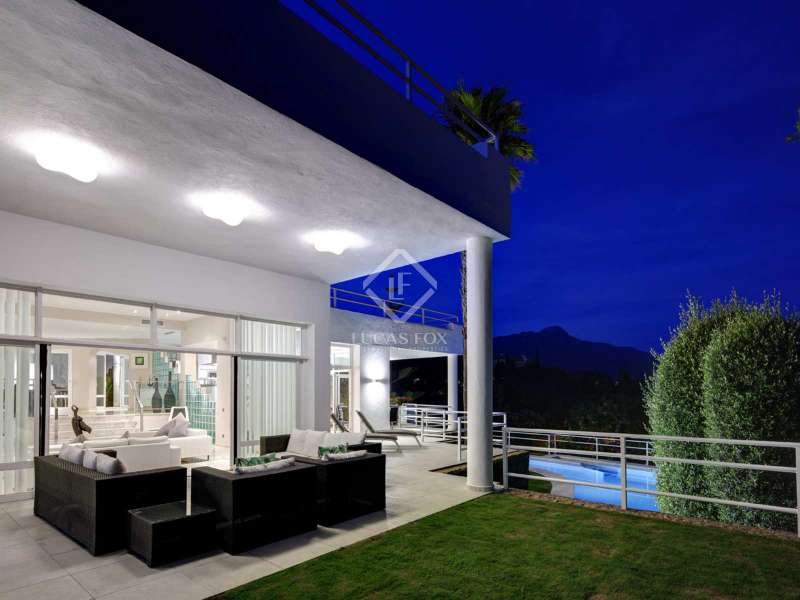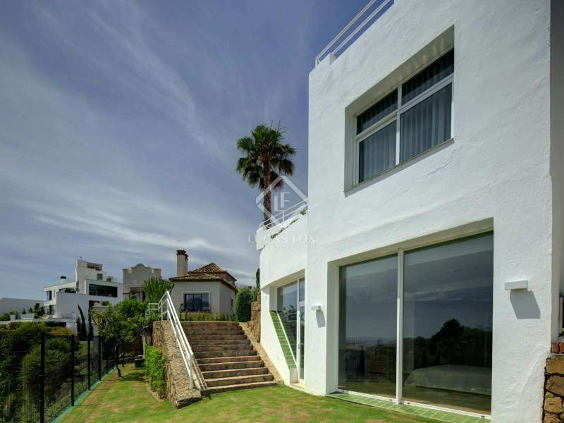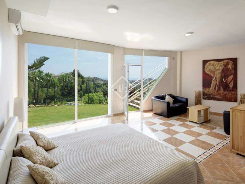 The attractive south facing "Villa Belle Vue" was built in 2006 and designed by the famous architects Bardrich & Tobal, known for their fantastic design of the luxury Kempinski Hotel. The villa is set within the botanical surroundings of La Quinta Golf and Country Club, within walking distance of a 5 star luxury hotel. Located in one of the most sought after residential areas of Marbella, this contemporary style villa is set in the hills around the iconic La Concha mountain in the Golf Valley, close to Puerto Banus, overlooking the Mediterranean Sea and the coast of Africa. The property features a Portuguese marble entrance hall leading to a contemporary living room divided into two levels, full of natural light and with stunning panoramic views from all angles. The lower living room features a designer skylight, chrome balustrades, different lighting designs and a large fireplace. To the left of the living room is a fully equipped kitchen with centre island and views to the separate dining room, which opens onto one of the many terraces surrounding the house and enjoys all-day sunshine. The 4 bedrooms with private bathrooms are distributed on this floor, located on both sides of the living and dining room; the separate guest accommodation with private bathroom is located in the lower garden area, is spacious and has independent access. There is a 3-car garage and two individual laundry rooms located on the lower level, with direct access via stairs from the main entrance hall. The property has an additional space of more than 120 m² which could be converted into a gym and sauna, wine cellar or billiard room.
