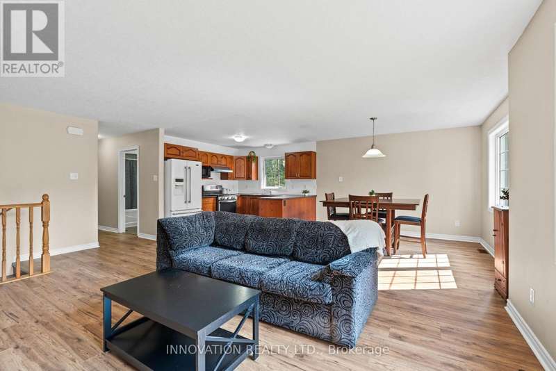 Peace and tranquility on nearly four acres of Montague beauty! This high-ranch home has FIVE bedrooms, including two primary suites, making it perfect for larger families, multigenerational living, or working from home. Walk in to a breezeway with direct access to the attached garage and back yard. The open main level features a large living room, dining room and kitchen, all bathed in natural light. Freshly painted with new laminate flooring throughout, there are three spacious bedrooms, including a primary with 4-piece en-suite, and another 4-piece main bath. On the lower level is another large primary suite with walk-in closet and 4-piece en-suite, a huge rec room, and a fifth bedroom. Lower level also has a wood burning stove to keep the house cozy and warm all winter. Outside you'll find your own private wilderness with gardens, forest, and plenty of space for recreation. Get on the ATV and snowmobile for year-round fun. There is a fire pit for socializing any time of year, a play structure for the kids, and even a three-storey tree house! Nestled between Carleton Place and Smiths Falls and with an easy commute to Stittsville, Kanata, and Ottawa, you can have your private rural retreat within reach of the city. (id:6509)