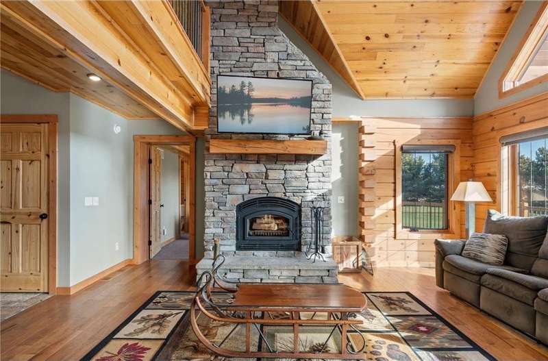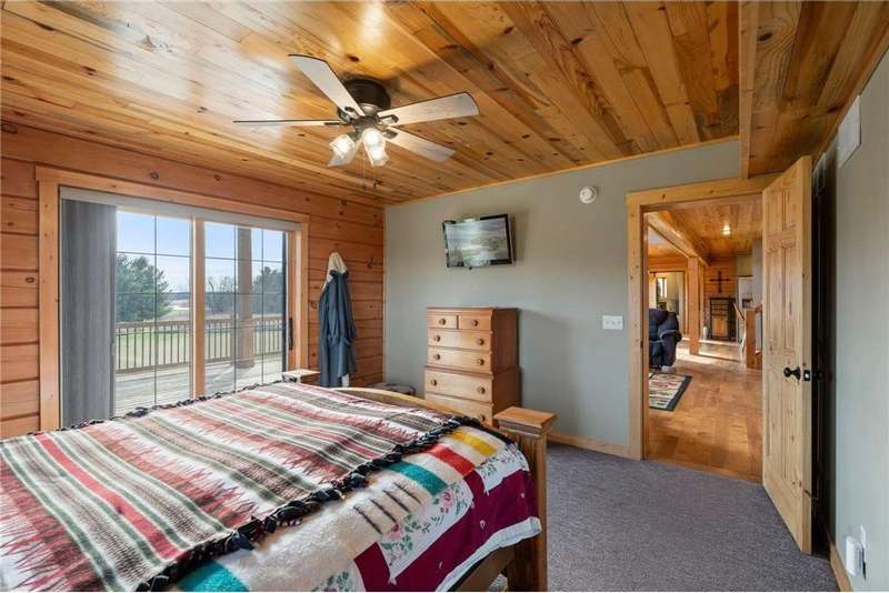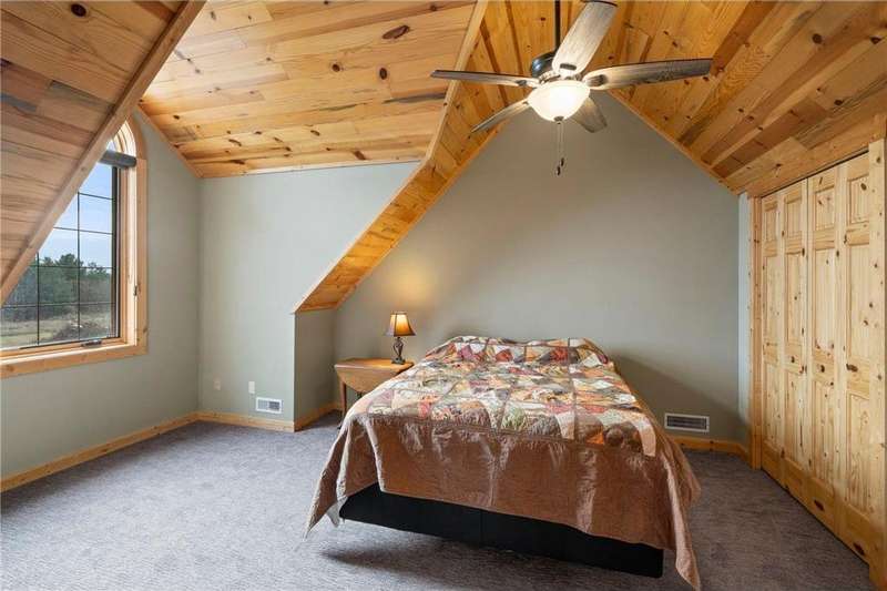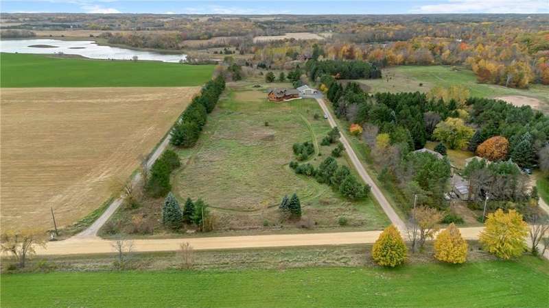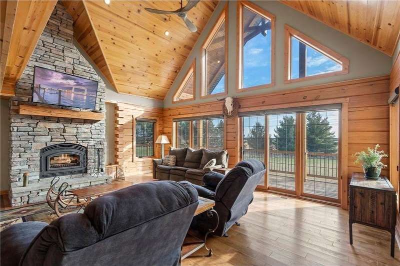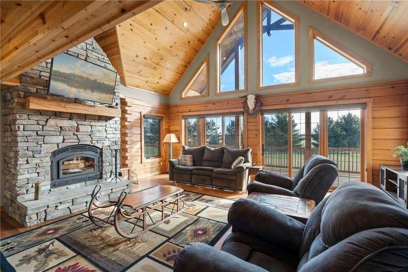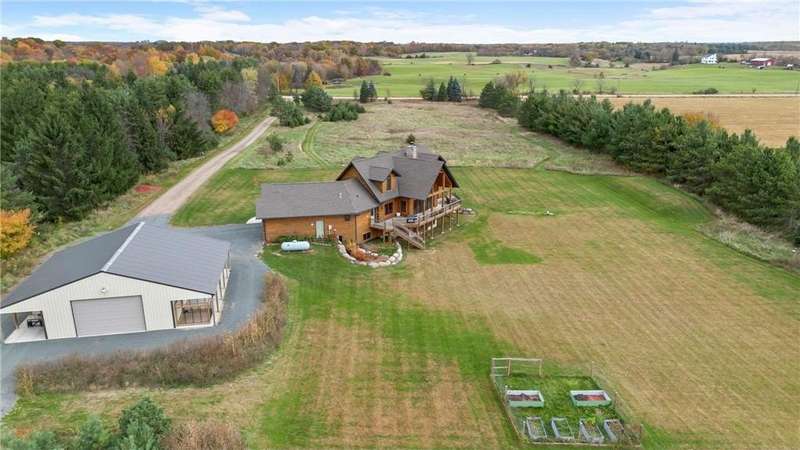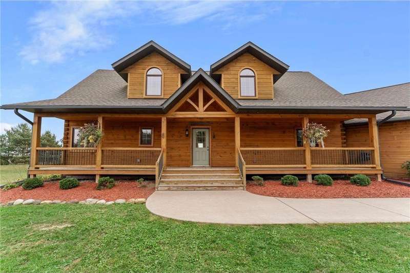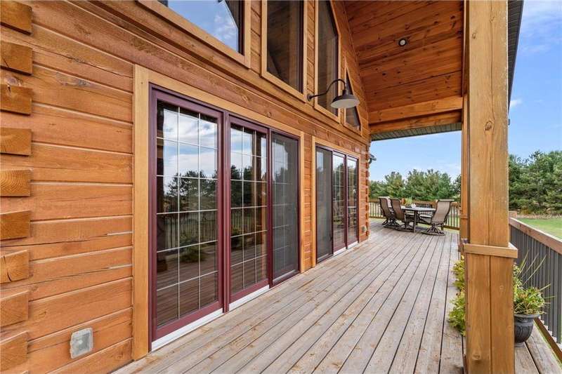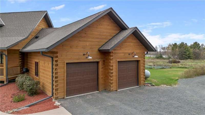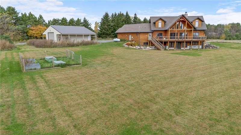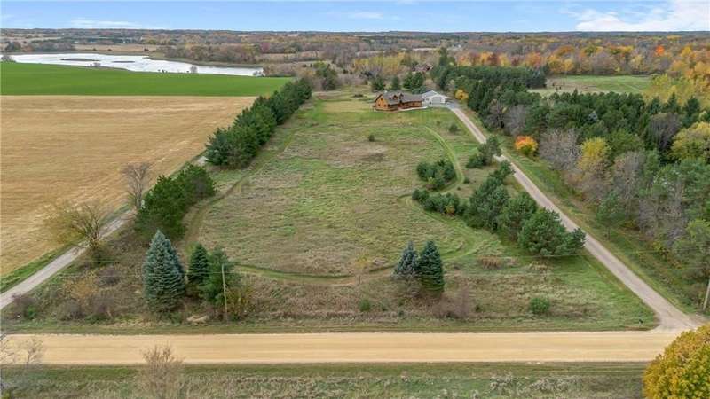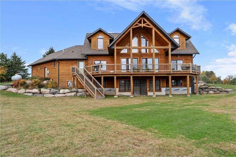 Welcome to your private log home retreat in Lindstrom! Nestled on 9.5 acres of rolling land with beautiful views and peaceful walking trails, this one-owner home offers the perfect blend of rustic charm and modern comfort. The open-concept main level features soaring ceilings, a spacious kitchen, and a cozy living area-perfect for gatherings. Enjoy a main floor bedroom and bath for convenience, plus a workspace with stunning views of the property. Upstairs, you'll find two additional bedrooms. Step outside to take in the natural setting, explore the trails, or relax on the deck or porch. Newly built pole building that is 50x40 with overhangs and 40x30 enclosed. Dog kennel attached to pole building stays with the property. Come check it out. No sign on property.