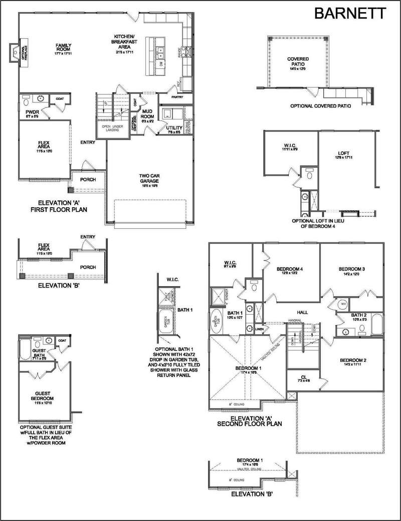The Barnett offers a family-friendly first floor layout with a large family room opening to a spacious kitchen and breakfast area with island and walk-in pantry. A mudroom with optional drop zone and separate utility room with folding counter connects the garage to the kitchen. A flex area off the entry can be utilized as a formal sitting area, home office, or optional guest bedroom with full bath. The first floor includes a coat closet and powder room, conveniently located off the entry hall. Upstairs are the primary suite and three bedrooms, or two bedrooms and a large loft. The primary suite includes a spacious bath with double bowl vanities, separate shower, garden tub, and large walk-in closet. Upstairs bedrooms share a bath accessed by a semi-private hall.