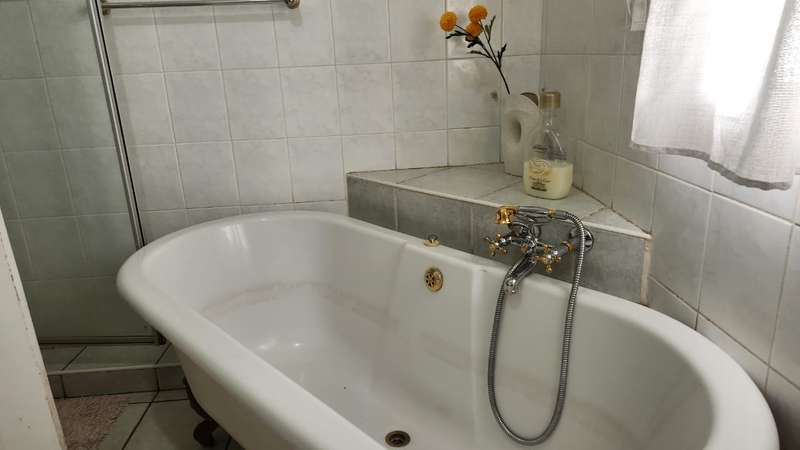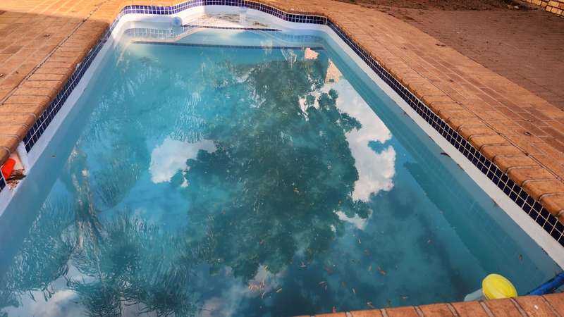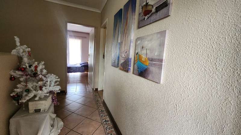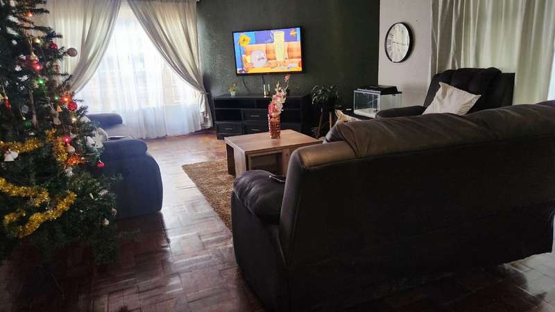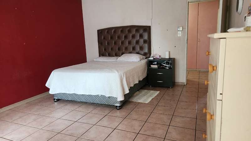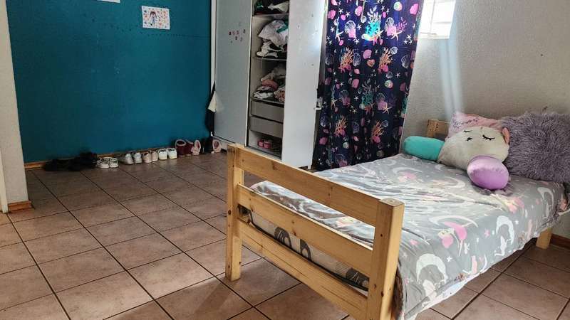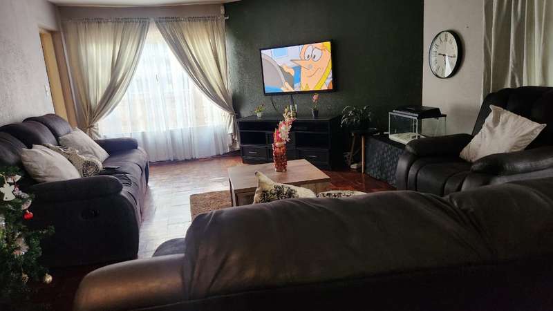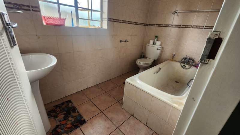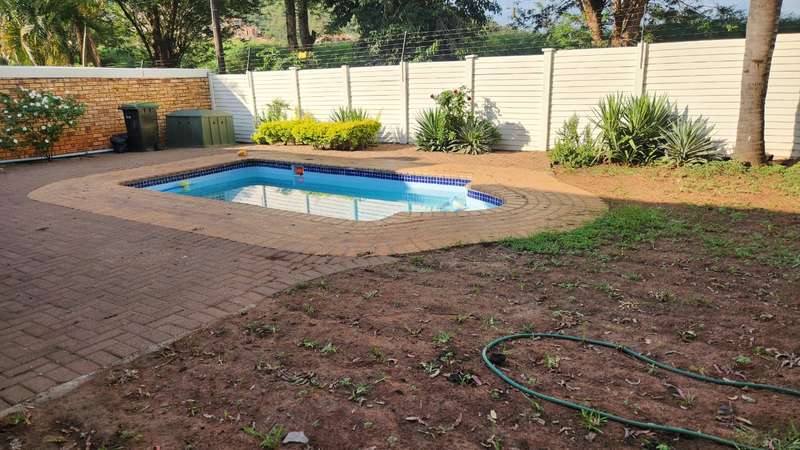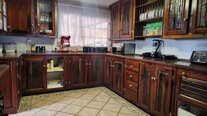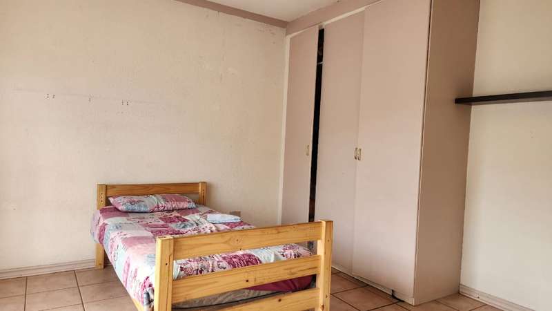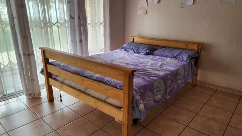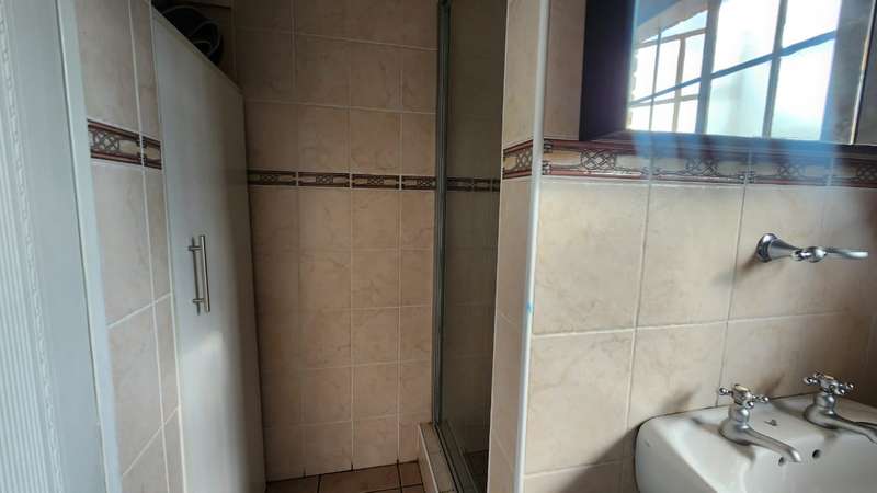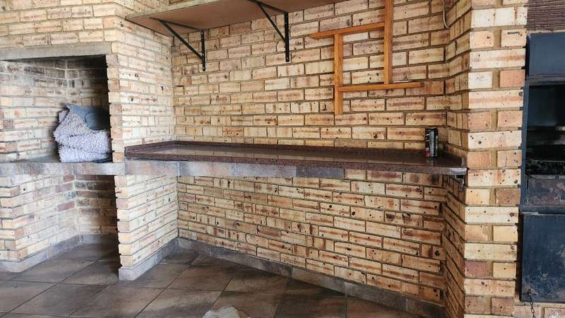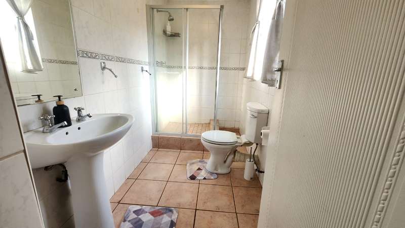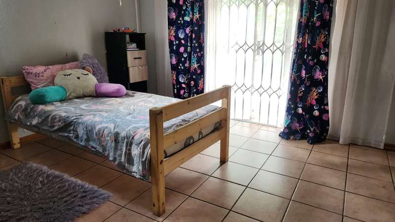 A spacious 5-bedroom, 3-bathroom house is available for rent in Safari Gardens, Rustenburg, for R22,000 per month. The home features generously sized, tiled bedrooms with built-in cupboards; one bedroom includes an air conditioner and private balcony, while four have ceiling fans. The traditional kitchen boasts granite countertops and ample storage, complemented by a separate scullery.