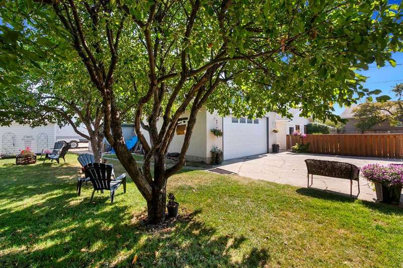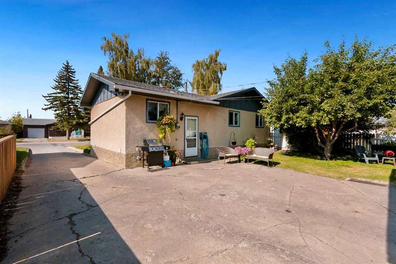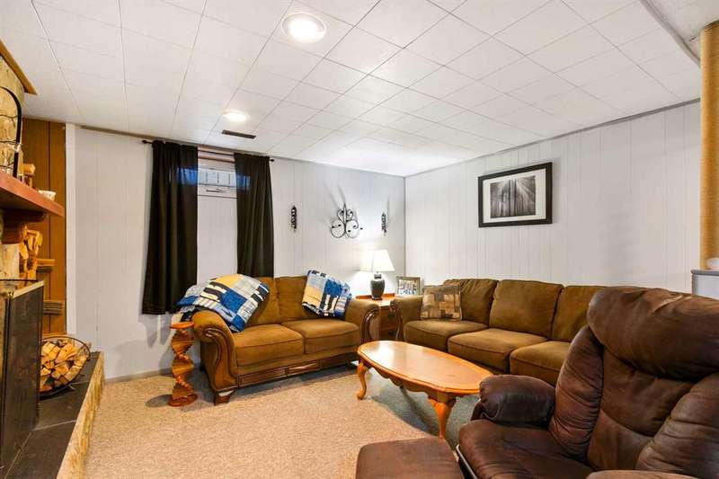 This well-maintained bungalow offers just over 1,090 sq.ft. on the main level with a full finished basement, giving you nearly 2,200 sq.ft. of total living space. Built in 1969, the home has been updated over the years with newer shingles, an upgraded electrical panel, some replaced main-floor windows, and refreshed flooring — with most of the upstairs now finished in durable tile. The main level features a bright living room, a large dining space, and a practical kitchen with adjoining pantry. Three comfortable bedrooms and a full bathroom complete the layout, making it ideal for families or downsizers alike. The finished lower level provides plenty of flexible space for relaxing or entertaining, with a cozy stone wood-burning fireplace, wet bar, second bathroom, laundry, and extra storage. It’s perfectly set up for family movie nights, games, or hobbies. Outside, the property shines with versatile parking and mature landscaping. A concrete driveway pad at the front leads to a 24x24 oversized double detached garage with workshop space. From the alley, there’s even room to park a 30’ camper behind the garage. In total, you’ll find space for 5+ vehicles. The lot also offers a private courtyard, fire pit, shed, and a couple of mature trees for shade and character. Located just 2 blocks off Highway 27 and north of Tim Hortons, this property combines convenience with comfort. With practical upgrades already completed and abundant living space inside and out, this bungalow is a great opportunity in Olds.