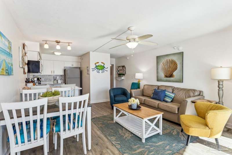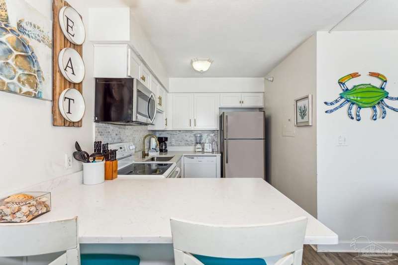 Come see this furnished ready to use 1 bedroom, 1 bath with BUNKS in the hallway and a sleeper sofa located right on the Gulf in Perdido Key. The master bedroom has a king bed as well and the unit could sleep 6 if needed. Seeing the breathtaking view of the Gulf from your balcony, this unit is perfect as an investment or for your family to make vacation memories to come! This cute beachy unit has new luxury vinyl flooring throughout, new HVAC units in 2021, and has quartz countertops and tile backsplash in the kitchen and new smart TVs. New front door and frame and building has just been painted, updated, etc. Enjoy the views from the 3rd floor. There is a pool and fitness room and this complex is conveniently located to restaurants, shops, bike/walk path, and more. Unit is on a vacation rental program. Rental projection ranges from $29K to 43K.