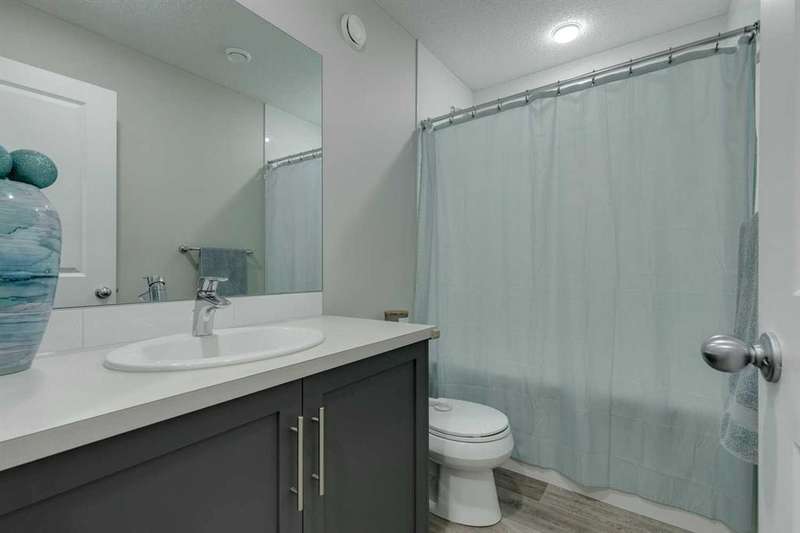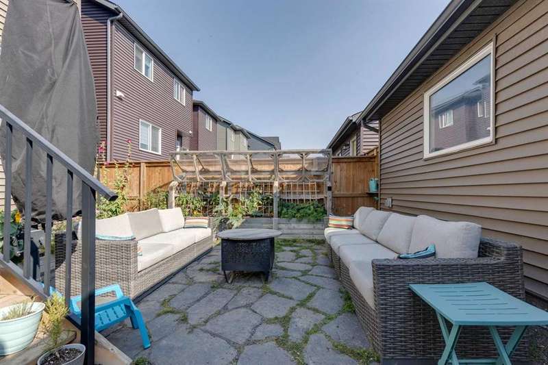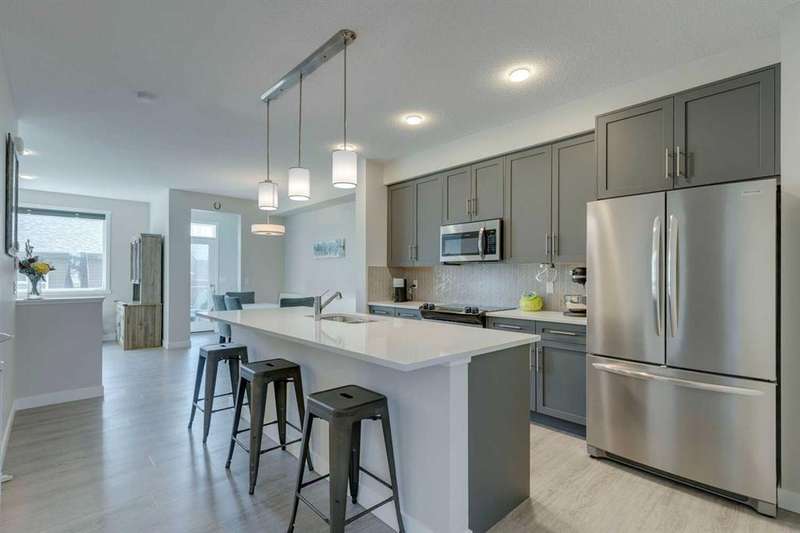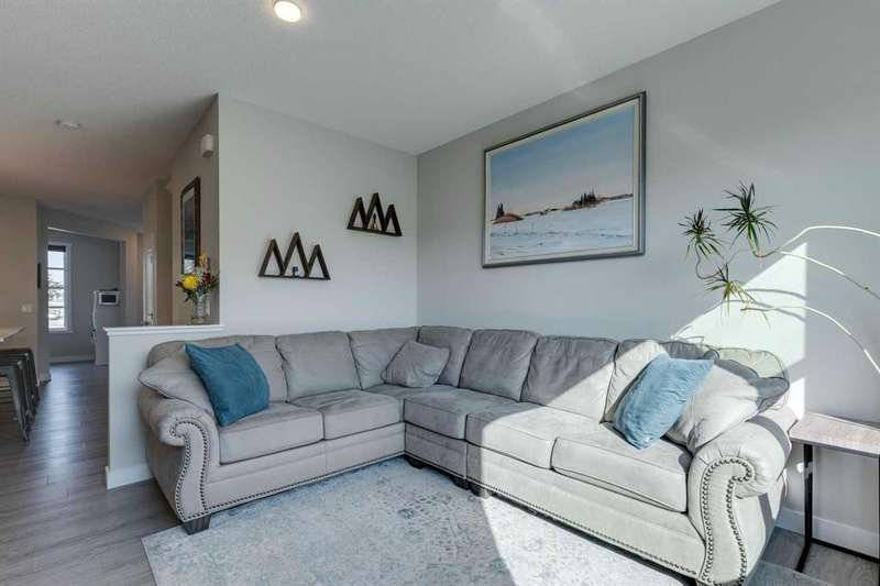 Carrington - 201 Carringvue Way NW: Welcome to this beautifully finished, fully developed 2-storey home in the family-friendly community of Carrington. Built by Homes by Avi, this home offers over 2,200 sq ft of living space with a total of 4 bedrooms, 3.5 bathrooms, and a detached double garage. The open-concept main floor is bright and inviting with luxury vinyl plank throughout. At the heart of the home is a stylish kitchen featuring quartz countertops, a herringbone backsplash, stainless steel appliances, and a central island that flows into the dining area with custom built-in bench seating. The living room is filled with natural light from large south-facing windows, while a spacious den and a 2-piece powder room complete the level. Upstairs, you will find the primary suite with a Juliet balcony, a walk-in closet, and a 3-piece ensuite with a walk-in glass shower. Two additional bedrooms, a 4-piece bathroom, and a convenient laundry room provide plenty of space for family living. The lower level was developed by the builder and offers even more living space with a large family room, a games area, a fourth bedroom, a 4-piece bathroom, and convenient under-stair storage. Outside the sunny south-facing backyard is fully landscaped with a deck with a gas line, a stone patio, planter boxes, and a double garage accessed from the paved lane. Recent updates to the home include new shingles and siding (2025) and central A/C (2024). Located in Carrington, a vibrant newer community with parks, playgrounds, pathways, Carrington Pond, a skatepark, and a basketball court - all while offering quick access to Stoney Trail, Deerfoot Trail, CrossIron Mills, and the airport. This turnkey home is ready for you to move in - book a showing today.