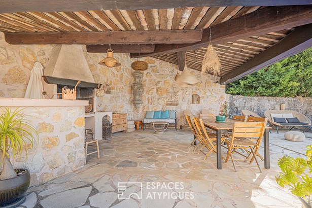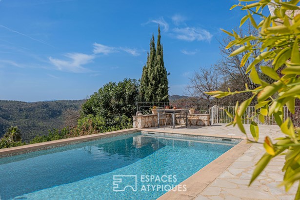 Located in a calm and peaceful setting, on the heights of Tourrettes-sur-Loup, this air-conditioned house, bathed in light, seduces with its generous volumes and its unique ambiance. On the garden level, the spacious entrance leads to a fitted kitchen, open to the dining room, as well as to a living room that opens directly onto the pool area and the pool house.