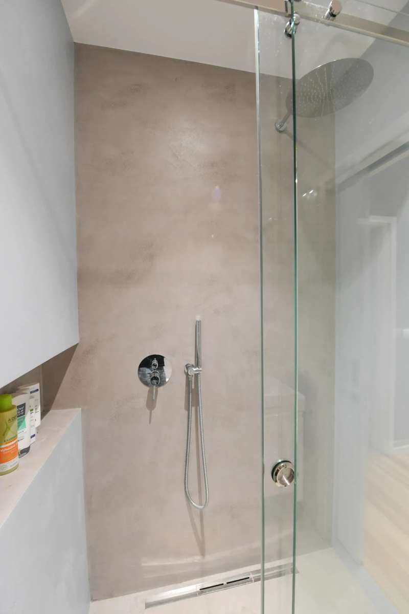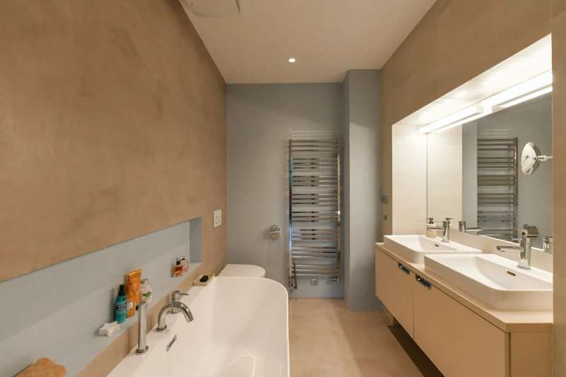 Both bathrooms feature durable concrete finishes on the walls and floors, which are easy to maintain.