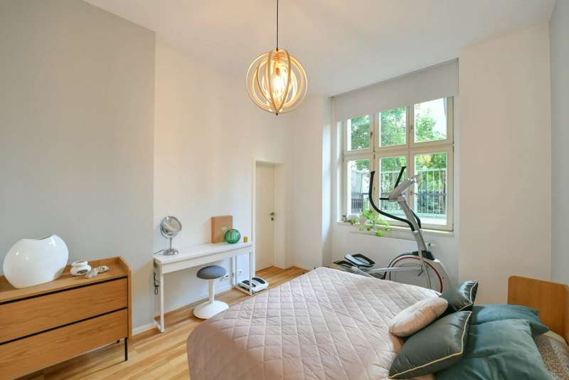 The high ceilings (reaching up to 3,1 meters) add a sense of airiness to the space, underscored by south-facing windows offering a view of the greenery within the courtyard.