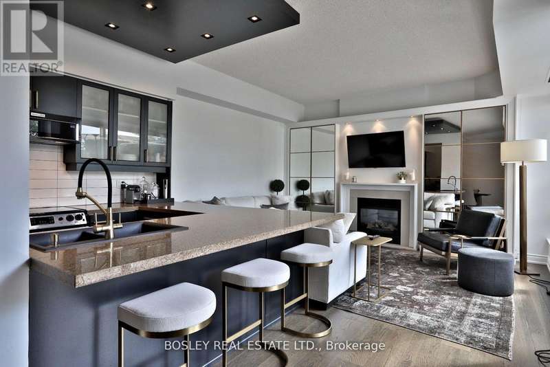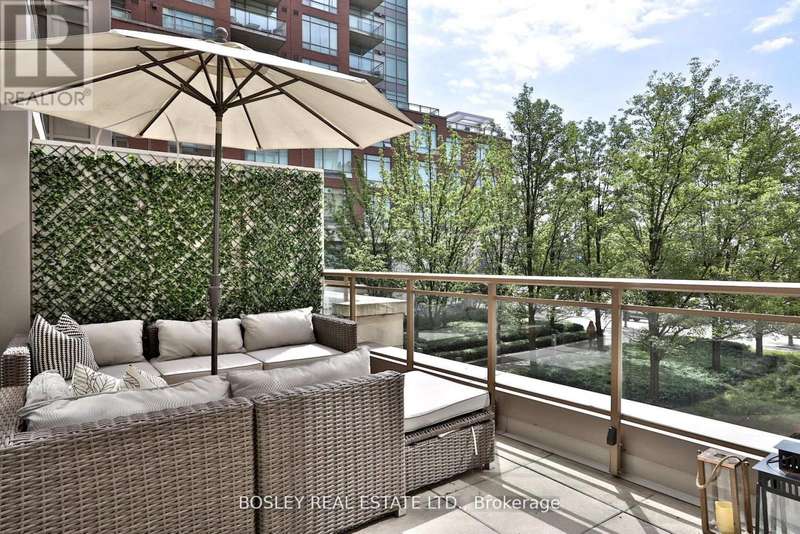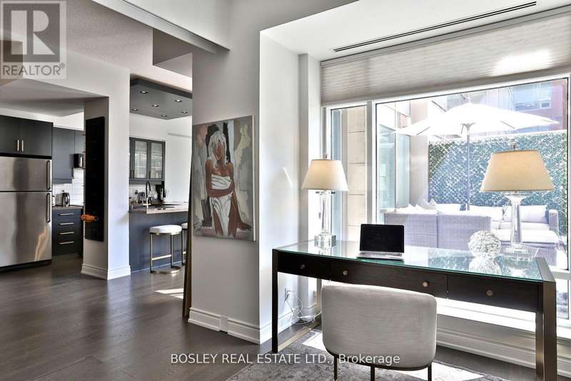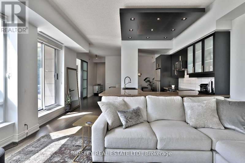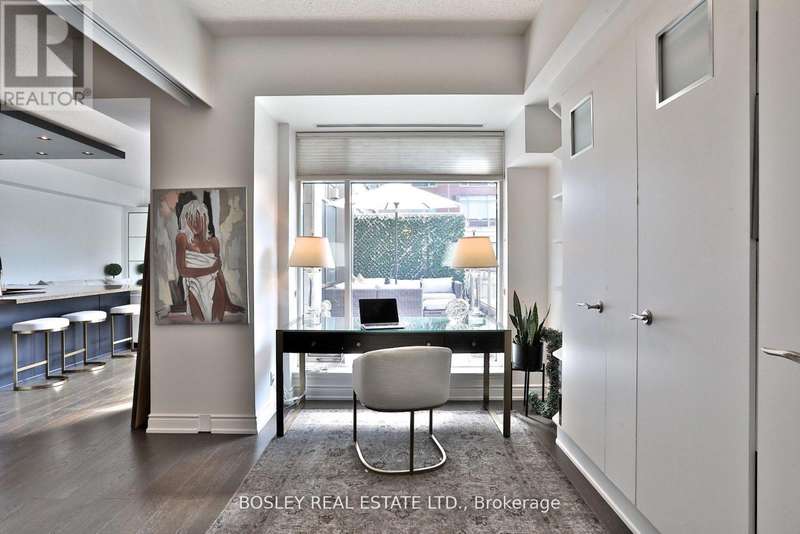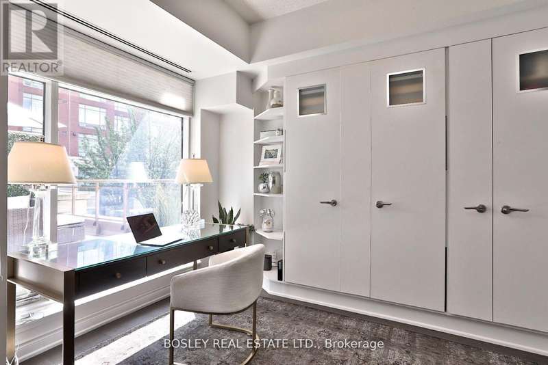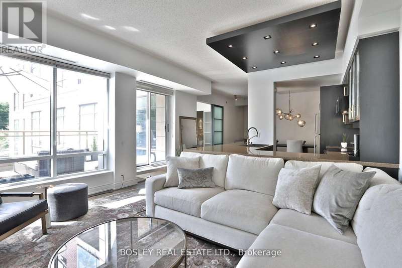 Sophisticated living at 500 Queens Quay. Situated just steps from the Lake and overlooking the Music Garden, Suite 208W is a generously-sized unit offering the best of city living, with easy access to transit, financial district, and the island airport. This well-appointed home features 10 foot ceilings and hardwood floors throughout. Open concept living space offers a great floor plan. The kitchen is a cook's delight with stone counters, breakfast bar, and walk-out to expansive 170 sq foot south facing terrace for warm weather entertaining. Spacious living room has a gas fireplace for cozy winter nights, built-in storage, and floor to ceiling windows overlooking the lake and large terrace. Large dining area with plenty of space for a dinner party. Custom California Closets organization throughout - tons of storage! Principal bedroom features built-ins, walk-in closet, and 4 piece ensuite. 2nd bedroom or den has Murphy bed for dual use. A great opportunity for the stylish urbanite!