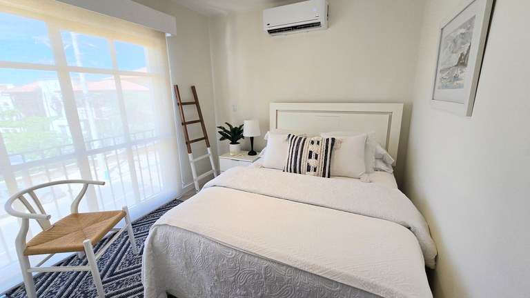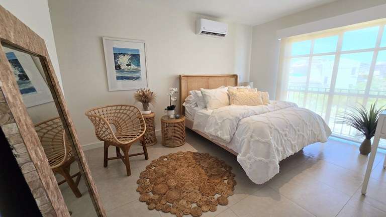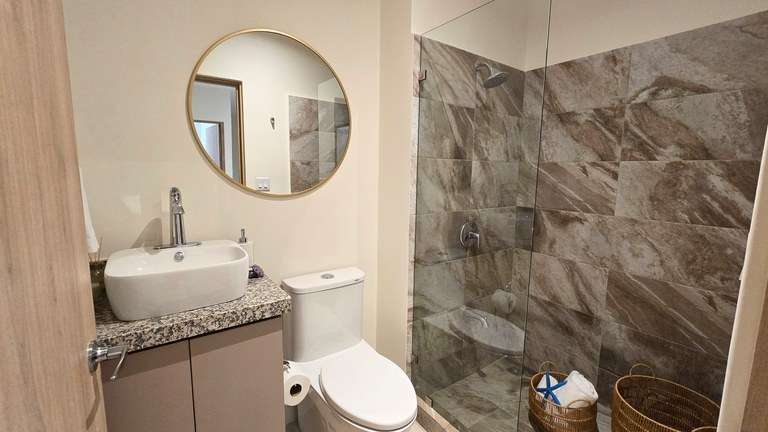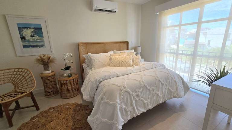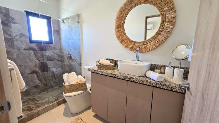 Upstairs, you'll find two spacious bedrooms, each designed to provide peace and privacy. The layout maximizes natural light and captures the gentle breezes that flow through Las Catalinas. From the second level, enjoy partial ocean views—a perfect backdrop to wake up to each day or unwind in the evening.