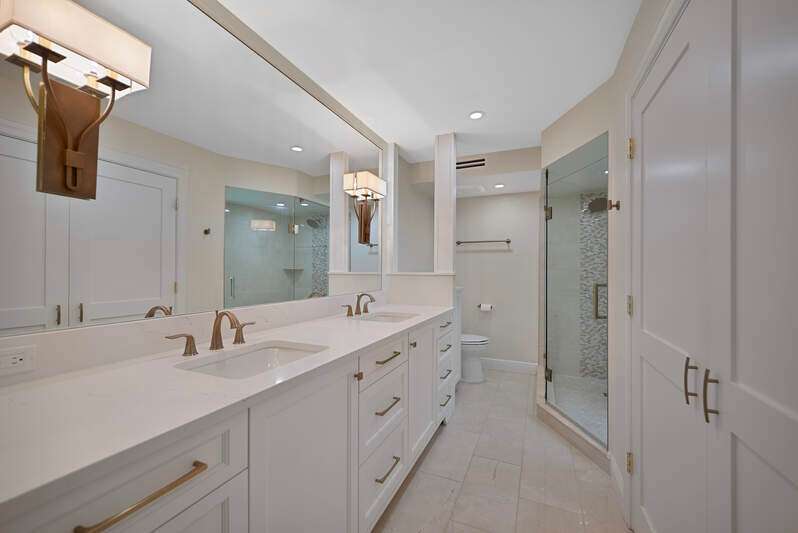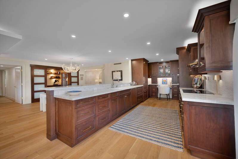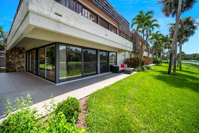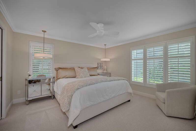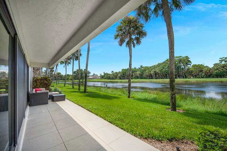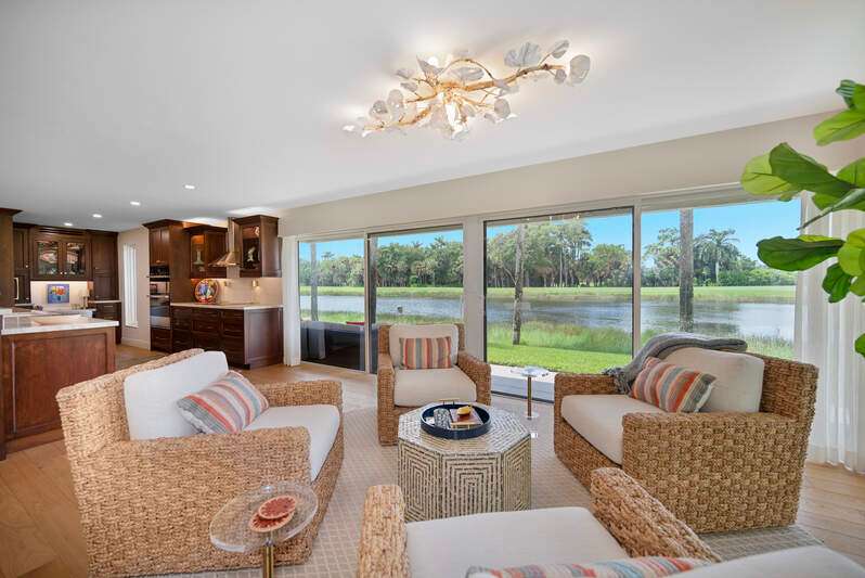 Welcome to this contemporary first-floor end unit with expansive lake-to-golf course views overlooking Wilderness's 18th green. Completely redesigned, this home epitomizes luxury living with its meticulous attention to detail. Seamlessly combines modern elegance, comfort, and warmth. Luxuriate in the exquisite French oak flooring, upscale designer lighting from Serena and Lily in the dining area and an Ed Koehler fixture in the sitting area, neutral-toned countertops, and custom cabinetry in every room, adorning this home with comfort in every detail. The open layout is flooded with natural light from over 40 feet of wrap-around sliders, seamlessly connecting two distinct living areas with the spacious dining room and kitchen. The chef's kitchen has custom cabinets, under-counter lighting, and high-end appliances, raised cabinetry, modern backsplash, and extra storage, including a walk-in pantry, creating an ideal space for culinary creativity. The third bedroom has been converted into a comfortable office with custom glass barn doors, a built-in desk, grasscloth wallpaper, and floating shelves. The elegantly redesigned bathroom showcases double sinks, a frameless shower enclosure, and upscale light fixtures. The patio provides a serene lakefront retreat with generous space for dining and entertaining. Step outside to enjoy covered parking, a golf cart, and a generously sized golf cart garage that provides ample additional storage. Residents have exclusive access to the newly constructed state-of-the-art 5-star Clubhouse and practice facility, making this property a golfer's paradise. A golf cart and dedicated cart garage are included, conveniently located next to your assigned covered parking. Set within a stunning 200-acre gated community, you'll enjoy beautifully landscaped grounds and mature trees lining the roads. This community offers unlimited golf on an 18-hole Arthur Hills course, as well as five inviting pools, four tennis courts, bocce, croquet, and a dog park. This condo is a true gem, just minutes from the vibrant shopping and dining of 5th Avenue and Old Naples. Purchase of a Wilderness Country Club membership is required and immediately available, offering you an effortless transition into this luxurious lifestyle. Don't miss your chance to make this stunning condo your new home!