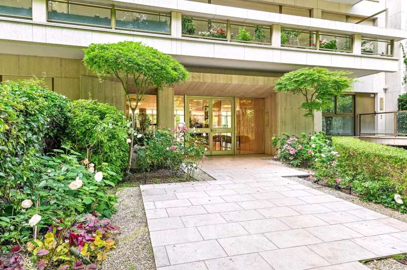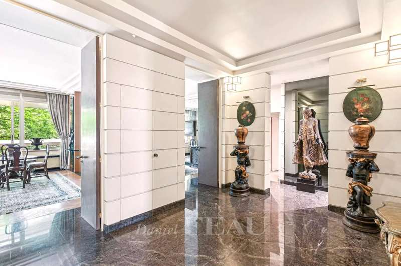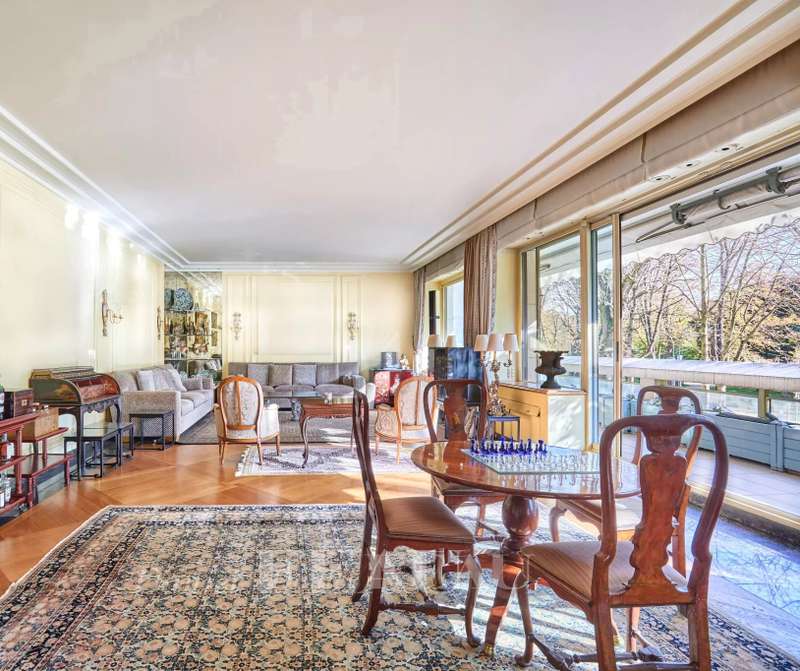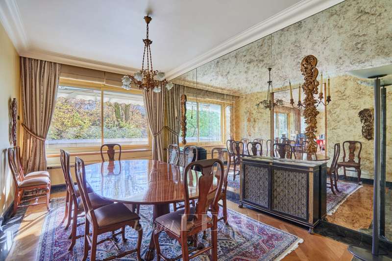 Avenue Raphaël, by Ranelagh Gardens. This apartment featuring 3.40 metre high ceilings and benefiting from an excellent floor plan is on the 1st floor of a fine mid 20th century building. An entrance hall leads to a spacious living/reception room and dining room opening onto a peaceful 30 sqm balcony enjoying an open view, an equipped kitchen and pantry with a terrace overlooking the building’s gardens, a master suite with a bathroom and dressing room enjoying a view of Ranelagh gardens, two further suites to the rear also overlooking a garden, and a fourth bedroom with mains plumbing. With ample fitted storage space as well as a cellar. The building’s garden is equipped with play areas. A parking space and a maid’s bedroom may be acquired at extra cost.