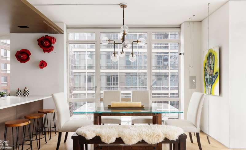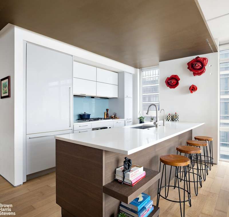 Step into the expansive living room, where floor-to-ceiling windows flood the space with natural light and showcase iconic city views. A separate dining area provides the perfect setting for entertaining, while the galley kitchen boasts sleek finishes, premium appliances, and a spacious breakfast bar for additional seating and prep space.