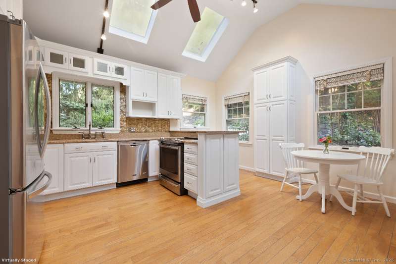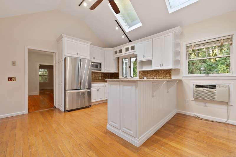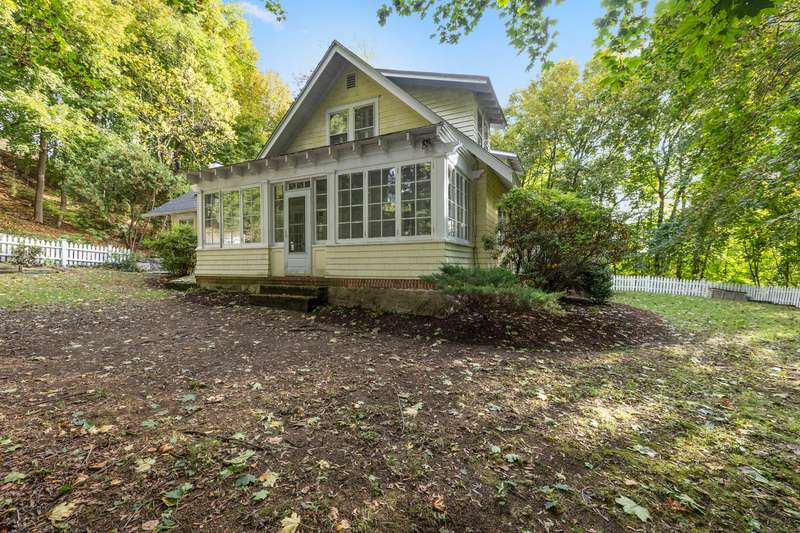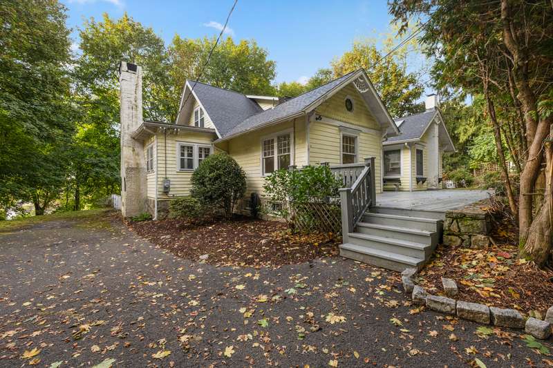 Welcome home to this 1920's Storybook Cape with Cottage brimming with character and charm-ideally located in the desirable Lower East Rocks neighborhood. A spacious front deck leads into the skylit foyer and updated eat-in kitchen featuring granite counters, stainless steel appliances, vaulted ceiling and multiple skylights. The cozy living room with fireplace and French doors opens to a private yard, while the formal dining room with French doors leads to a delightful screened in porch. The spacious family room with stone fireplace, two full baths (one updated), and a bedroom complete the main level. Upstairs, you'll find two additional bedrooms and an updated full bath, all with lovely treetop views and hardwood floors throughout the main house. Freshly painted interior and a new roof on main house & cottage add to the appeal. The unfinished basement has great storage. BONUS: Cottage (approx. 548 sq ft) offers 1 bedroom, living room, EIK and private deck offering great income potenti