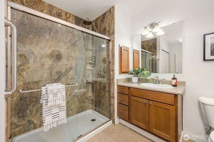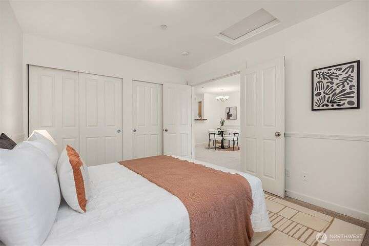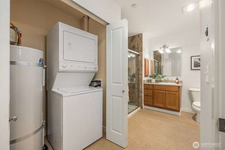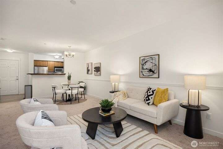 Top-floor tranquility in the heart of Bainbridge Island! This quiet, light-filled 1-bed condo enjoys a premium location—just minutes from shopping, dining, transit, and the ferry. With only one shared wall, you’ll love the added peace and privacy. Thoughtful updates include fresh interior paint, new carpet, and laminate flooring in the kitchen. The open layout offers comfortable flow between living, dining, and cooking spaces. Soaring ceilings and large windows invite in natural light, while the top-floor setting provides a sense of retreat. Dedicated parking is included and pets are welcome. Enjoy secure entry, elevator access, and nearby walking trails. Ideal for commuting, investing, or simply enjoying the island lifestyle.