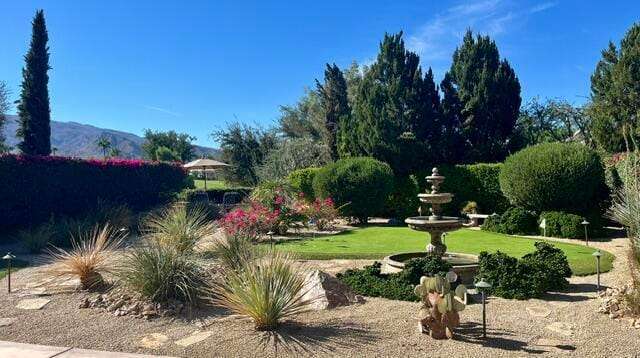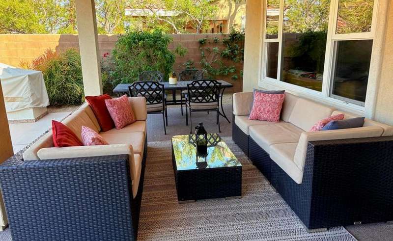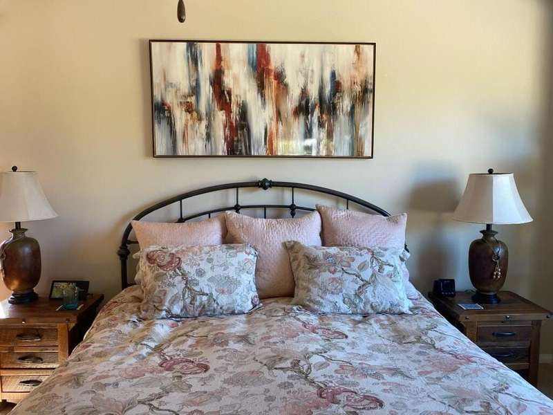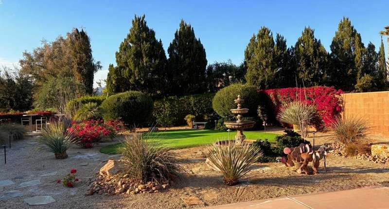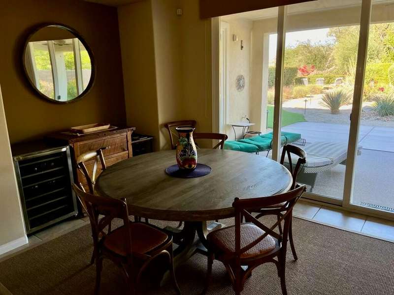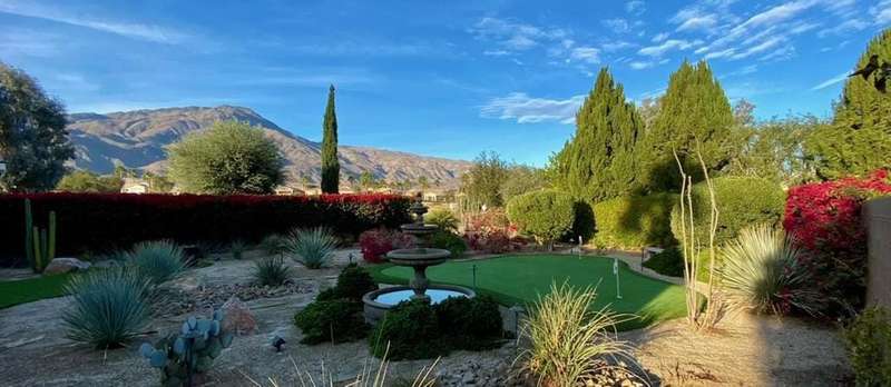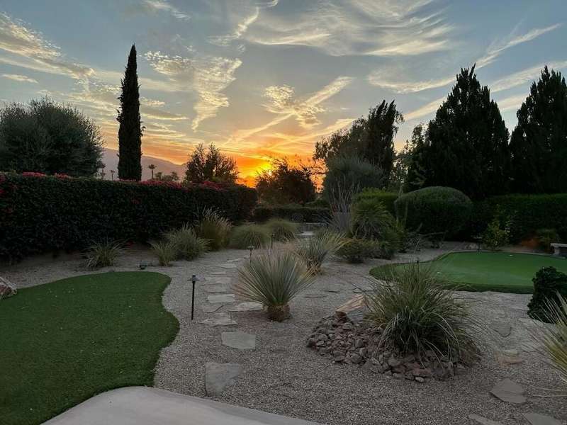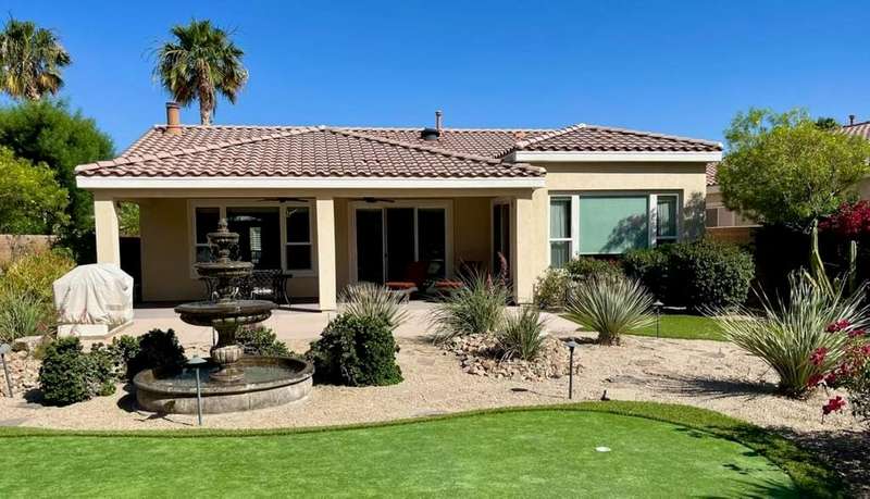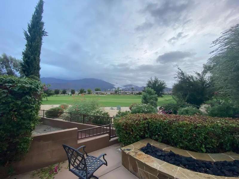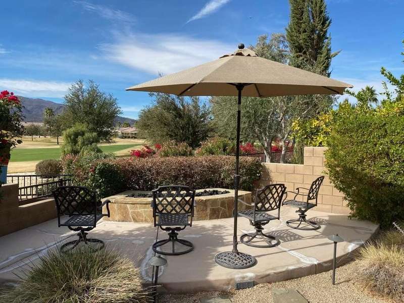 RENTED 1-01-2026 thru 4-30-26Available all other months. This beautiful Oasis Plan offers two bedrooms two baths. Nicely decorated. Large kitchen fully stoked. The beautiful backyard has its own putting green. You have views of the golf course and gorgeous Santa Rosa mountains. Many evenings can be enjoyed setting by the Firepit and watch the sunset. Located on a large lot and walking distance to the club house. The clubhouse has a full gym, indoor running track. Trilogy is a 55 and older communitywith pickleball courts, full tennis courts, bocce ball, Library, mini theater, 18 hole golf course.