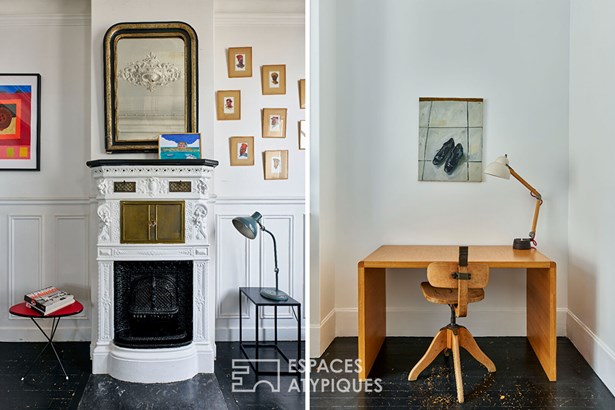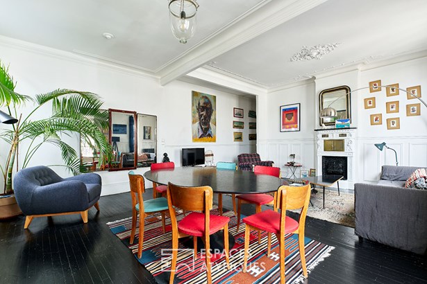 Beyond this, the vast living room of over 33 sqm impresses with its generous proportions, abundant natural light, and period details: moldings, original parquet flooring, and two facing fireplaces-one marble, the other Prussian-style which lend the space a unique and welcoming atmosphere.