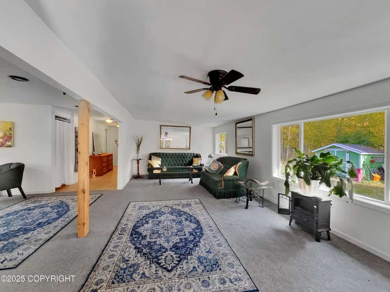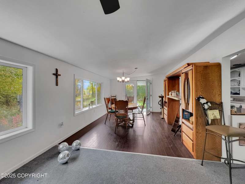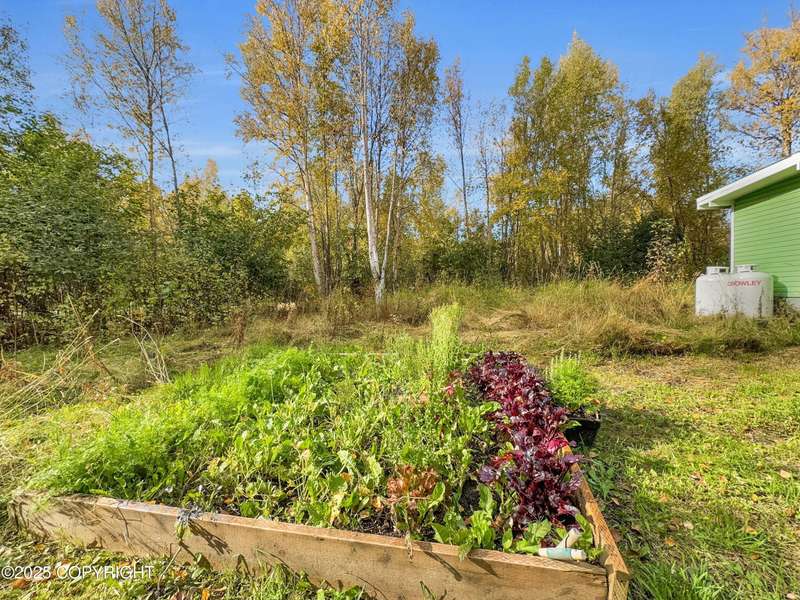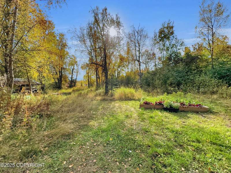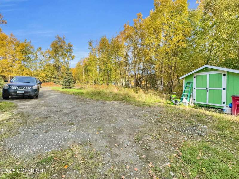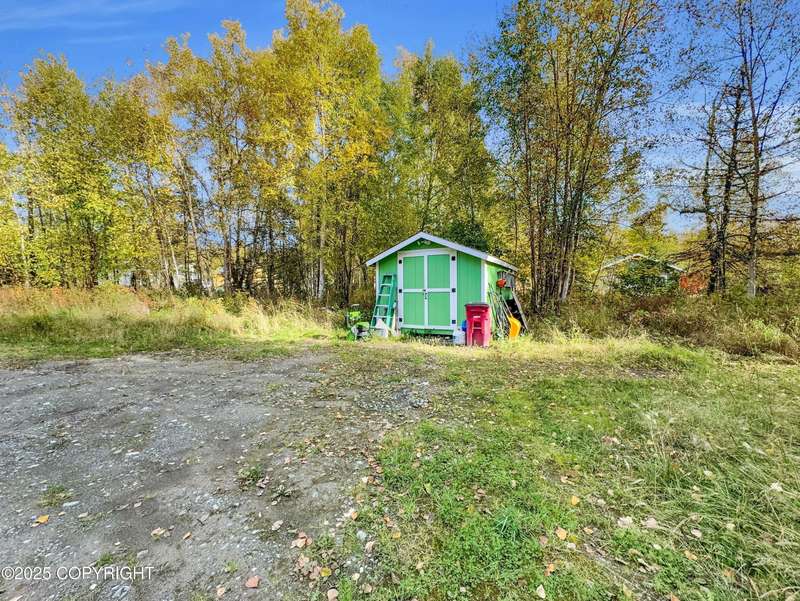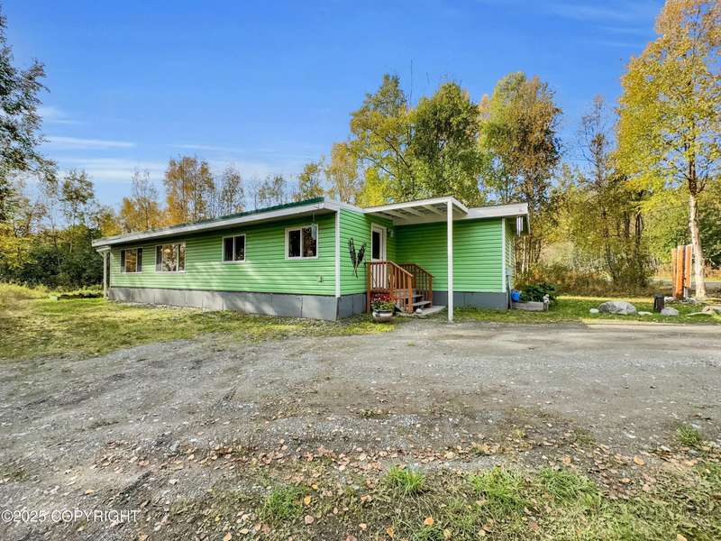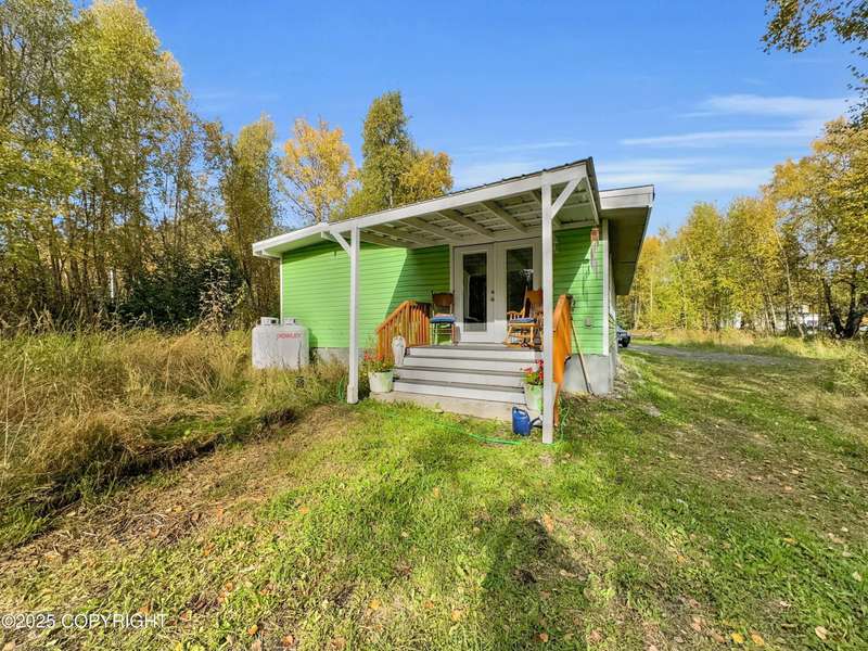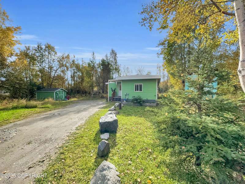 Freshly painted and move-in ready, this cozy 2-bedroom, 1-bath manufactured home sits on a full acre and combines comfort with convenience. The arctic entry provides plenty of storage for all your Alaskan winter gear. The spacious living and dining area filled with natural light, creating a warm and welcoming atmosphere. Step outside to your own private retreat the sunny backyard feels like a secluded getaway in the woods, perfect for relaxing on the back porch with coffee and a good book, growing your own fresh vegetables or entertaining. Leaving plenty of space on the property to add a garage or shop. Enjoy the privacy of a wooded setting while still being in a great commute location and just minutes from shopping and local amenities. Seller has recently repainted, and installed new carpet in living area and LVP in bathroom, kitchen and bedroom. Added electricity to the shed, painted the whole exterior with shed to match, added covered front and back porch. Cash sale, possible owner finance with very large down.