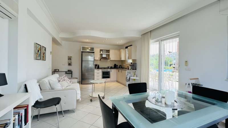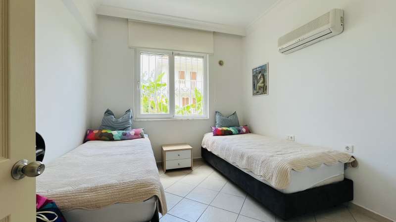 This apartment for sale in Kemer Antalya consists of 2 bedrooms, 1 living room, an open plan kitchen, 1 bathroom, 1 toilet and 2 balconies. The apartment has a total usage area of 80 m² and is fully furnished. Furnishings are included in the sale price. The apartment also has electric underfloor heating.