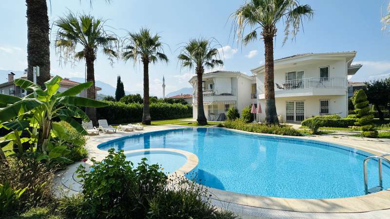 The site area is 1315 m², with 2 blocks and 8 apartments in total. The apartment for sale is on the 1st floor. The complex has a swimming pool, barbecue area, and beautiful mountain views.