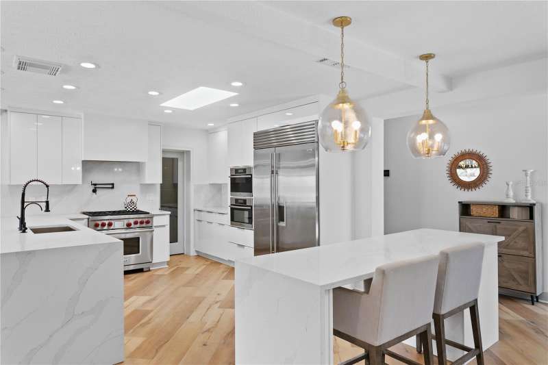 Under contract-accepting backup offers. Welcome to your dream oasis in the coveted BEACH PARK neighborhood of South Tampa! This prime spot puts you just minutes from Tampa International Airport and the vibrant downtown scene, featuring Amalie Arena, the Straz Center, and the Riverwalk. For sports enthusiasts, Raymond James Stadium, home of the Tampa Bay Buccaneers, is also nearby. Plus, the beautiful shores of Clearwater Beach are just a short drive away. This beautifully remodeled SINGLE-STORY pool residence features 5 bedrooms and 4 luxurious bathrooms. Constructed with durable block and elevated at 11 feet, it has experienced NO STORM DAMAGE and sits on an expansive QUARTER-ACRE LOT, ensuring unparalleled privacy. Step inside to elegant luxury flooring and an open living concept filled with natural light from expansive windows sliders and skylights. The inviting main living area boasts a gas fireplace, perfect for cozy gatherings. Culinary enthusiasts will love the chef’s kitchen, equipped with top-of-the-line SUBZERO, WOLF, and Miele appliances, including a six-burner gas range and a butler’s pantry with exquisite QUARTZ countertops. A versatile family room and an additional bedroom that can serve as an office offer added flexibility. The spacious principal suite features stunning courtyard views, vaulted ceilings, and a luxurious bathroom with a custom double vanity, soaking tub, and walk-in shower. The laundry room includes a dedicated dog bathing station for your furry friends.Step outside to the inviting POOL area, complete with a HEATER for year-round enjoyment, and an extensive outdoor space ideal for entertaining. Modern conveniences include SMART HOME FEATURES, a two-car garage EQUIPPED FOR ELECTRIC VEHICLES, and ample parking space. Experience the best of both worlds—serene suburban living and convenient access to the vibrant lifestyle Tampa has to offer!