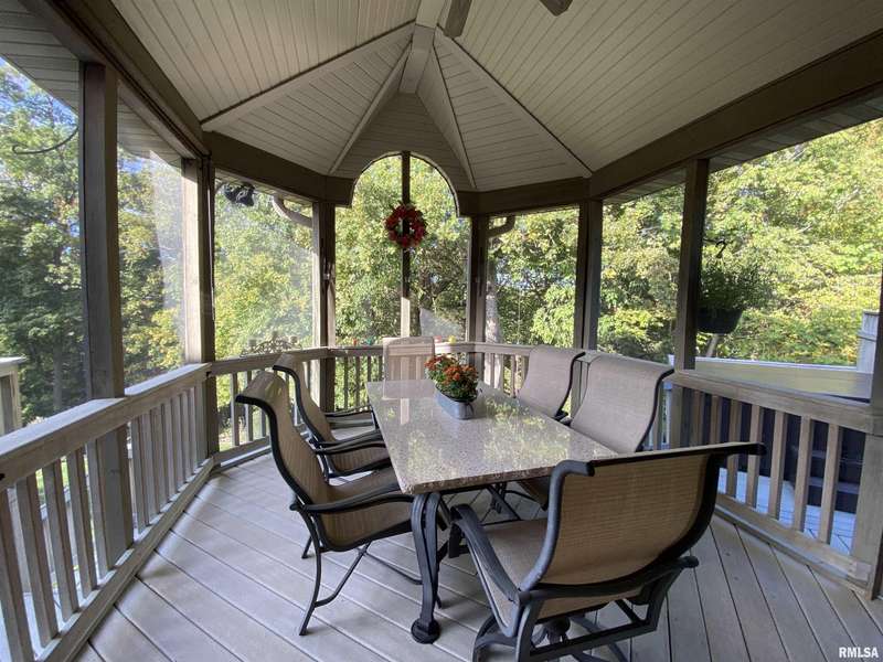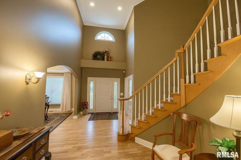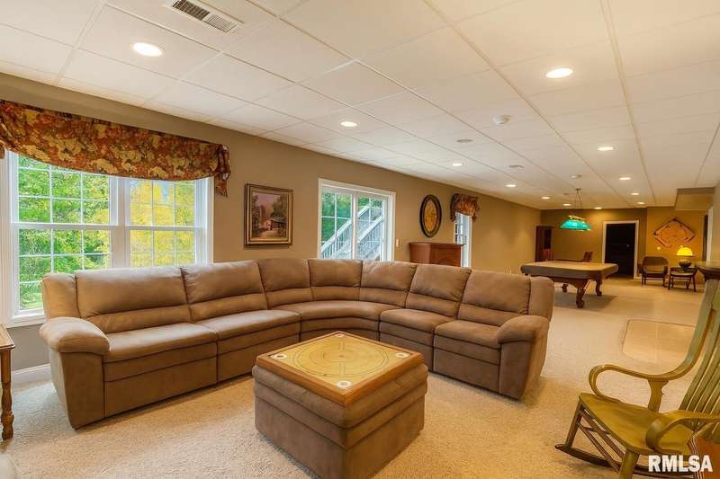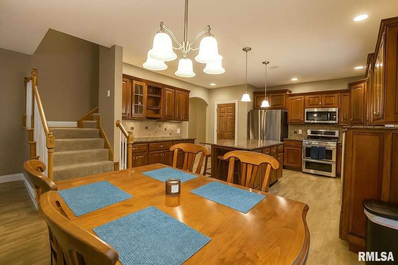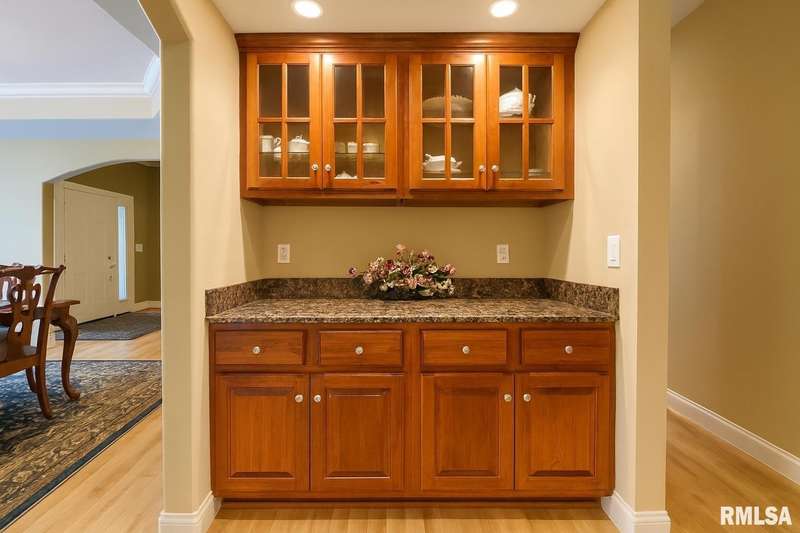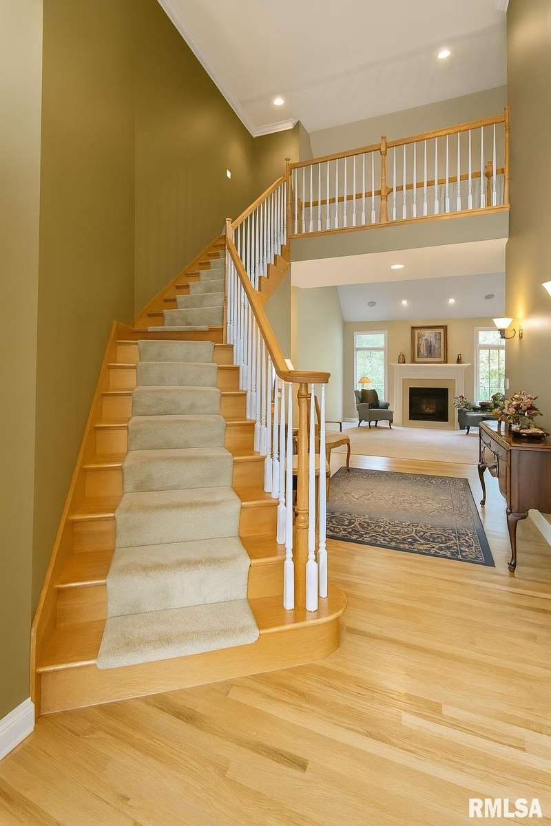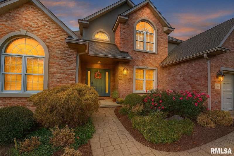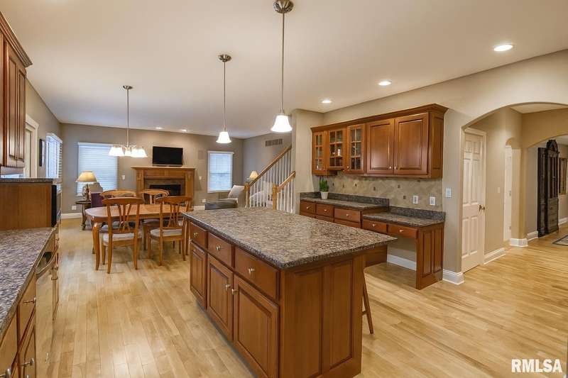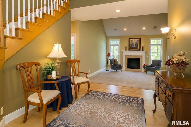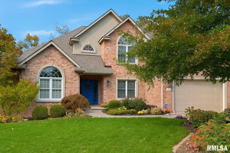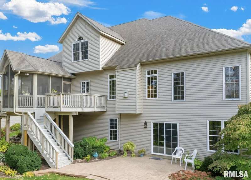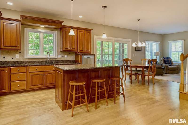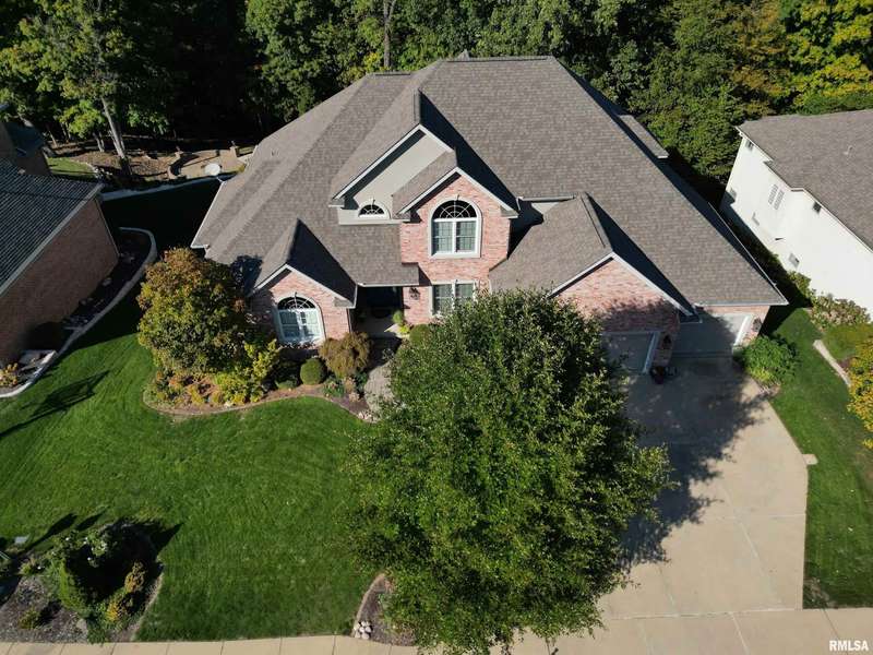 Tucked away on a quiet, wooded ½-acre cul-de-sac, this exceptional custom 1.5-story by Bruce Whitehouse blends craftsmanship, comfort, and class. Just 2 miles from The Shoppes at Grand Prairie in the award-winning Dunlap Schools, it greets you with a dramatic 2-story foyer, hardwood floors and an elegant staircase. A formal dining room with tray ceiling, private office, and a vaulted living room with fireplace lead to a gourmet island kitchen with granite counters, breakfast bar, all appliances, food pantry and butler’s pantry. The kitchen opens to a warm family room with a 2nd gas fireplace and a vaulted screened porch with decks overlooking the private backyard & woods. The main-floor primary suite features a tray ceiling and updated bath (’20) with three walk-in closets, LED backlit mirrors, and a tiled shower with frameless glass. Upstairs offers three spacious bedroom suites (one private, two sharing a dual-vanity bath), each with huge walk-in closets, plus a generous linen closet. The beautiful finished walkout lower level adds a large family/rec room with wet bar opening to a paver patio and lush, irrigated backyard framed by mature trees and brick-edged landscaping.Two daylight bedrooms (now office and gym) share a full bath. Another stairway from the garage leads to the office/workshop area.Extras: abundant built-ins/storage, updated geothermal HVAC (’23), new roof (’19), extra insulation, 3-car garage with epoxy floor, central vac, and Sonos sound system throughout!