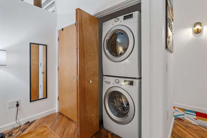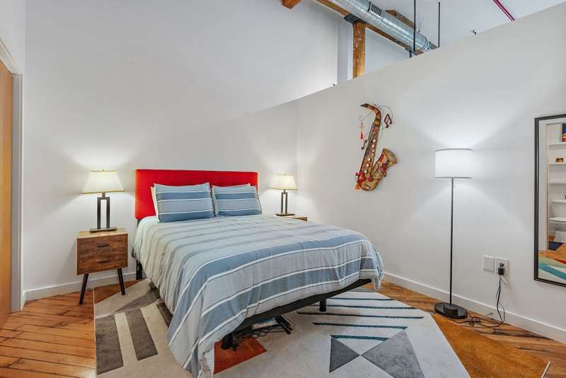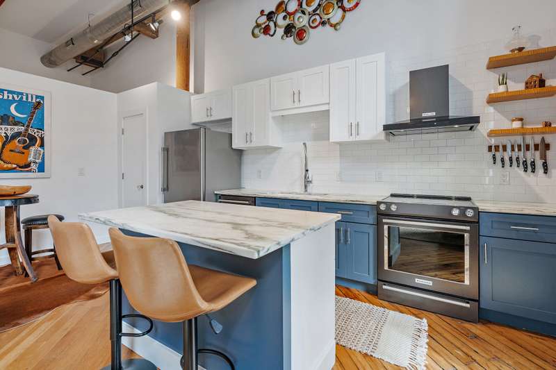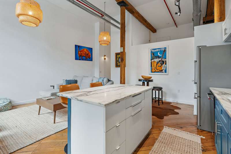 Step into this fantastic 1-bedroom unit in one of Nashville's most beloved historic buildings. Soaring ceilings and oversized factory windows fill the space with natural light, while exposed brick walls and designer lighting bring modern sophistication to the building's industrial roots. You will love the original heart of pine wood floors and character that was thoughtfully preserved when this 1800s textile factory was converted to residences. The open kitchen features marble countertops, a pantry, and thoughtful updates throughout. The spacious bedroom offers two large closets--a rare find in loft living.